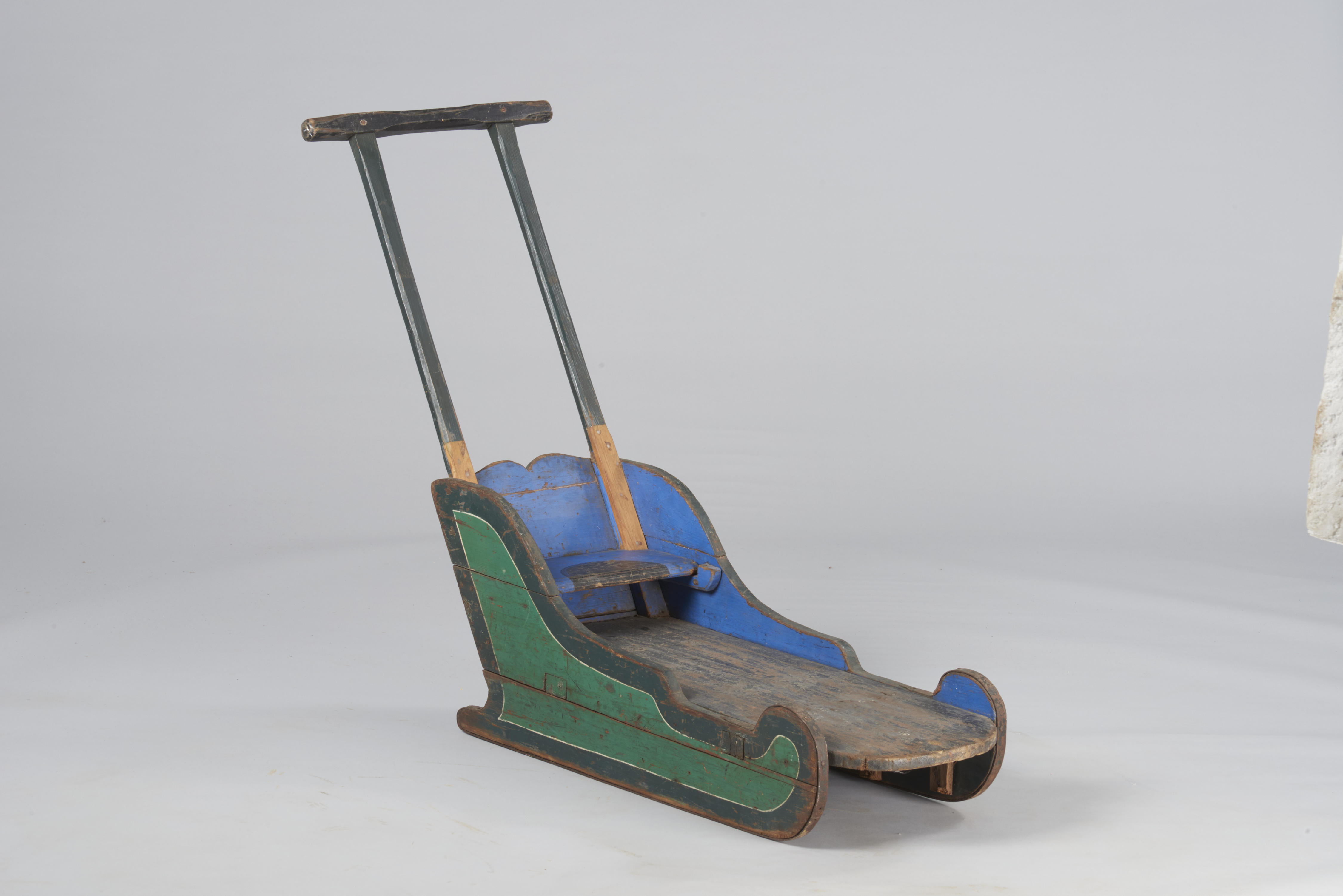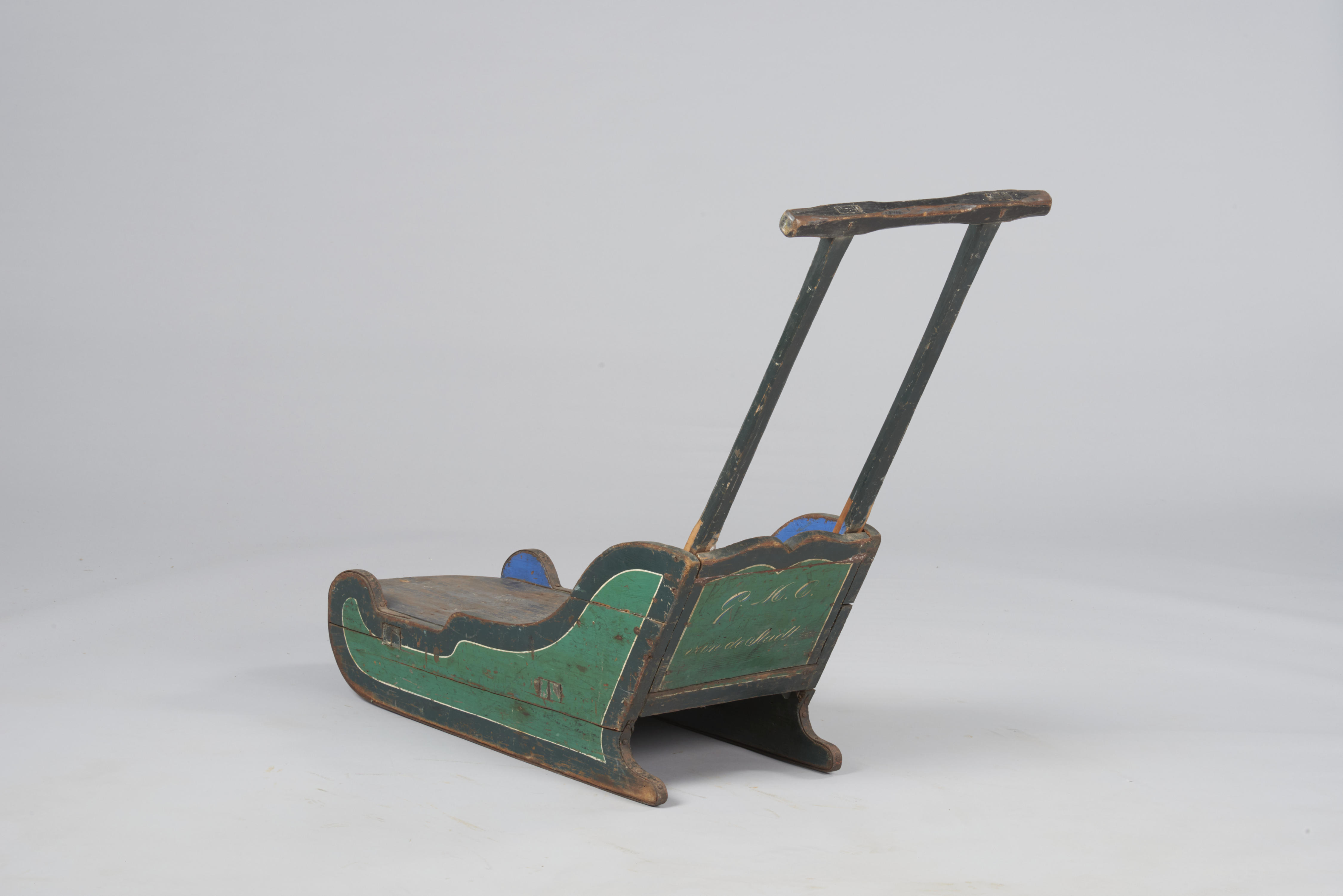 Beschilderde naaldhouten duwslede. Op de achterzijde staat in sierlijke letters: 'G.M.C. van de Stadt'. Het gaat hier naar alle waarschijnlijkheid om Gerardina Maria Christina van de Stadt, in Zaandam geboren op 20 maart 1883. Ze trouwde op 15-08-1912 met Jacob de Boer.