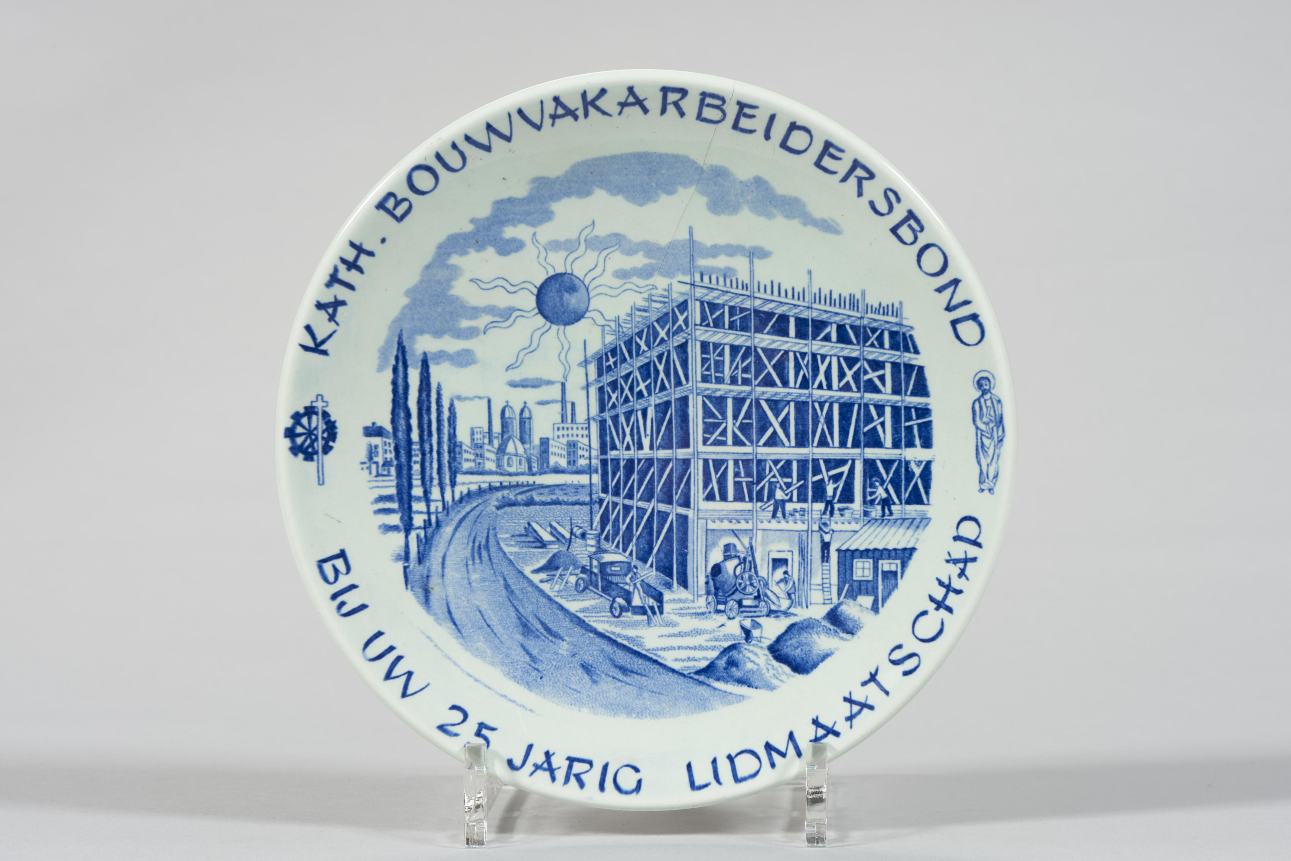 Bord met een voorstelling van een gebouw in aanbouw. Op de achtergrond zijn een stad en een grote zon te zien. Het opschrift luidt: 'Kath. Bouwarbeidersbond Bij Uw 25 jarig lidmaatschap'.