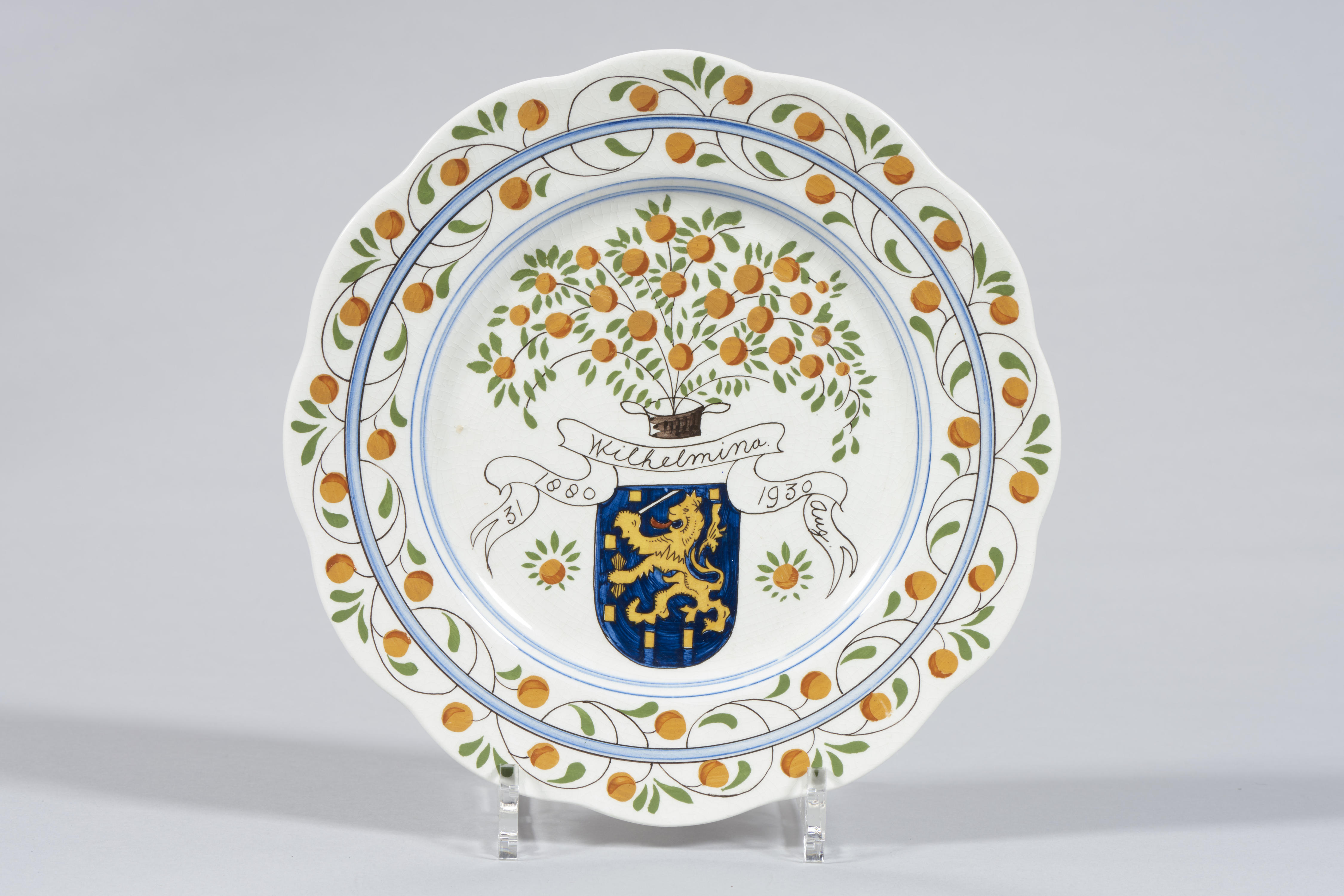 Gedenkbord, uitgebracht ter gelegenheid van de vijftigste verjaardag van koningin Wilhelmina. Op het bord staat de afbeelding van de oranjeboom en een schild met de Nederlandse leeuw. Op een lint staat de tekst: '31 Wilhelmina 1880 1930 Aug'. De rand van het bord is versierd met oranjeappels.