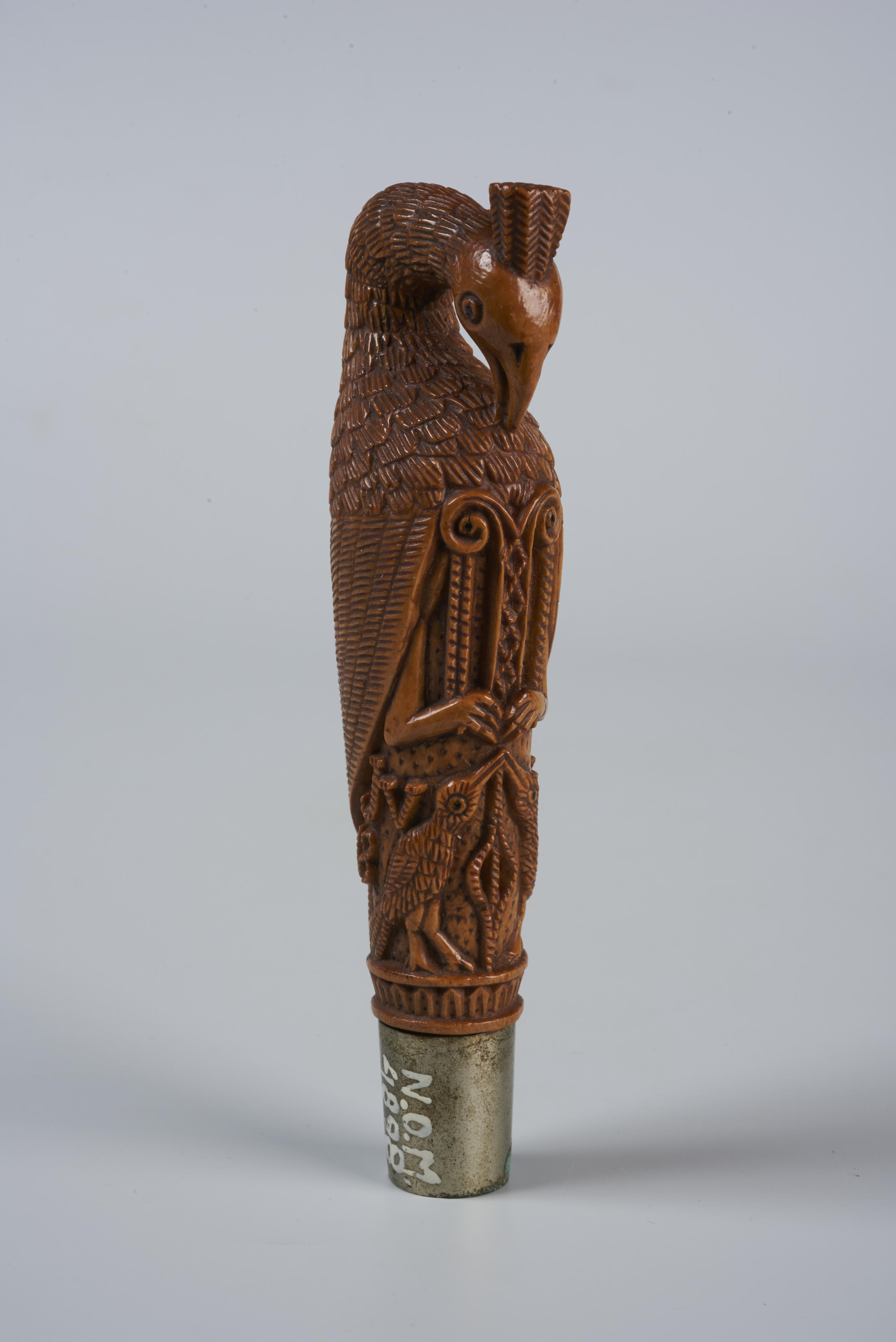 Houten mesheft in de vorm van een vogel met de initialen 'J.v.d.V.' en het jaartal 1893.
