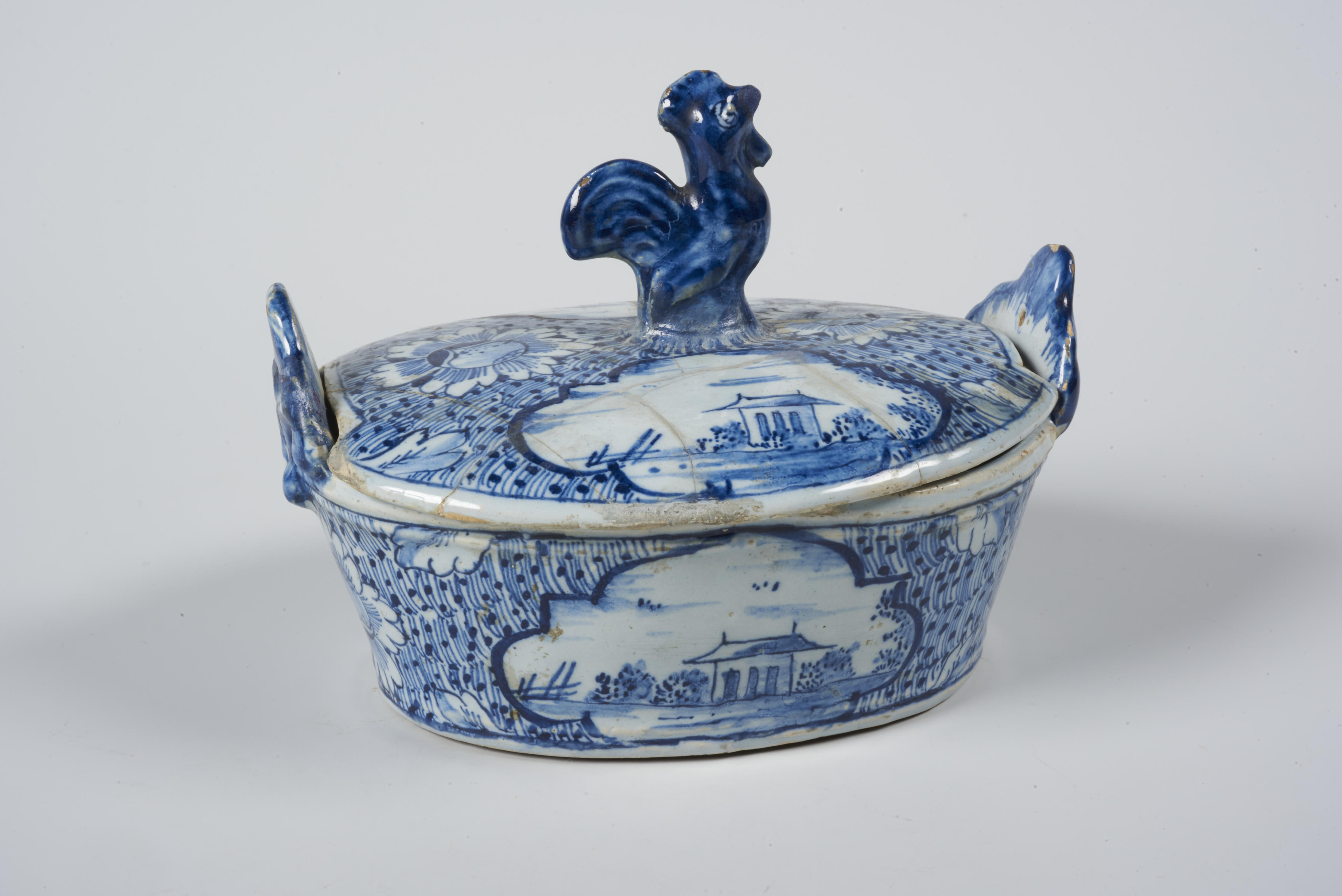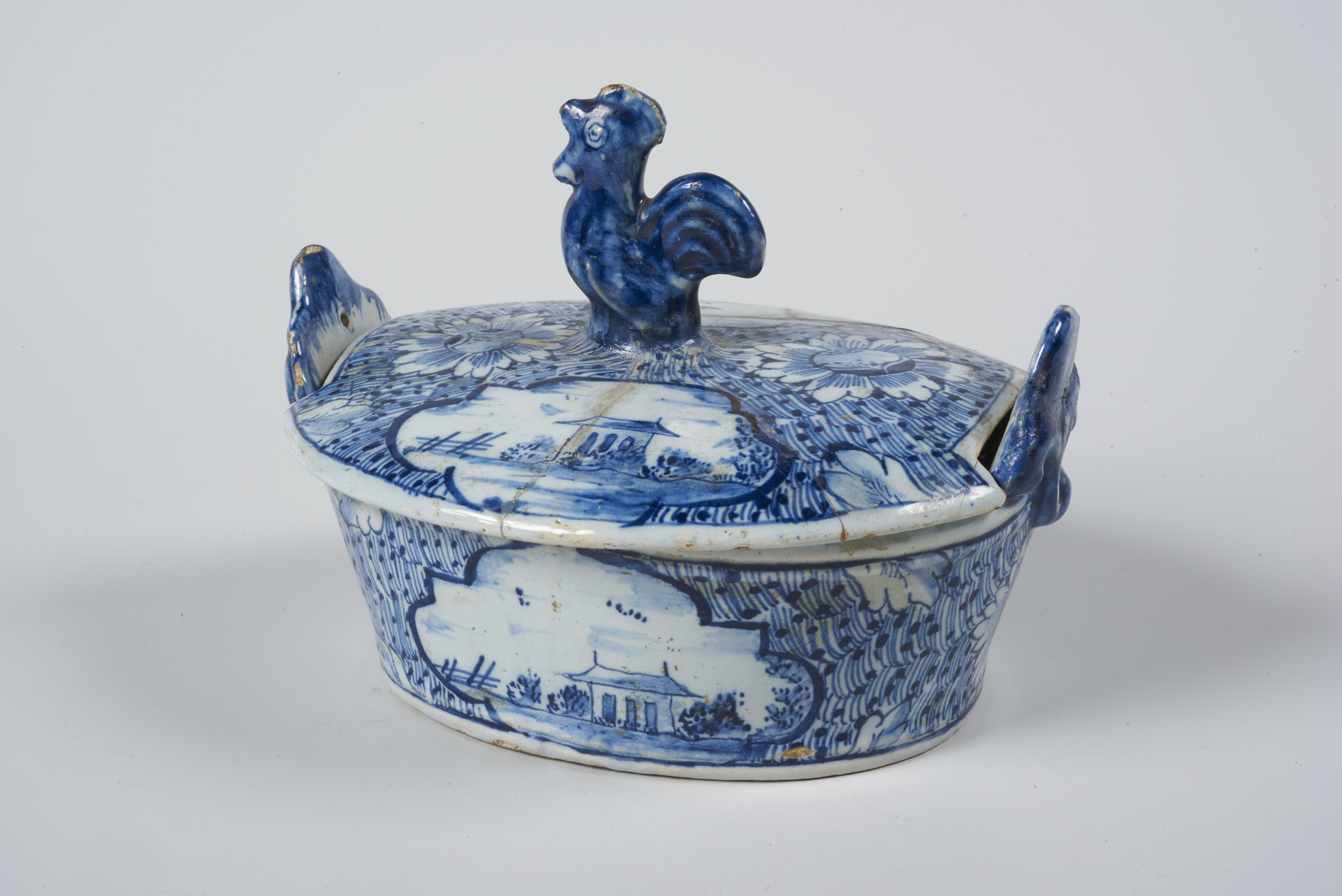 Op de lange zijden van het boterkuipje staat een landschap, dat ook tweemaal op het deksel is aangebracht. Zowel op het kuipje als op het deksel staan een paar bloemrozetten, lijn- en stipwerk en enkele bladmotieven. Een haan dient als handgreep op het deksel.
