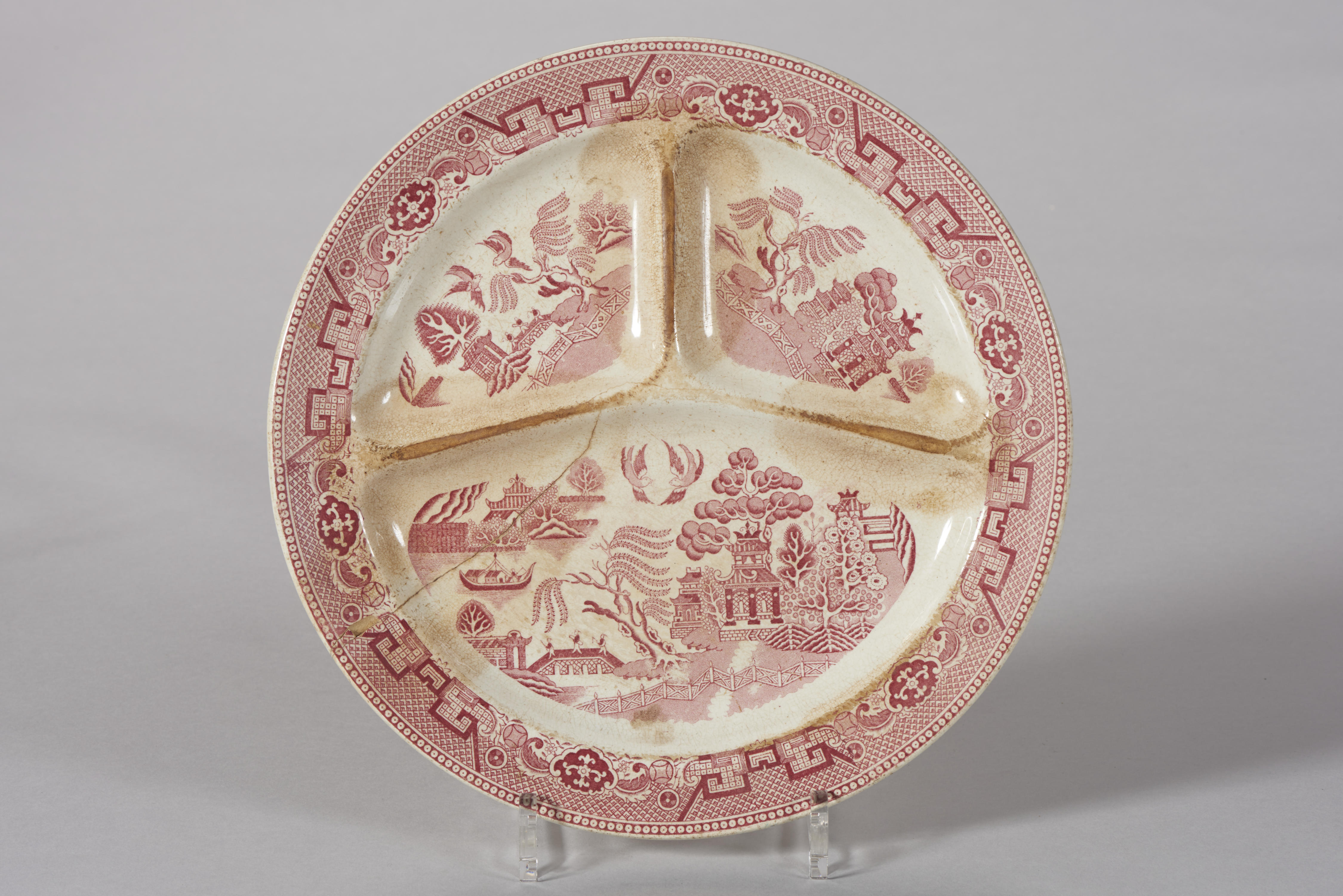 Bord met een voorstelling van een landschap met onder andere een pagode, een brug, een boot en twee vogels. Op het bord zijn opstaande randen aangebracht, zodat het in drie vakken is verdeeld.