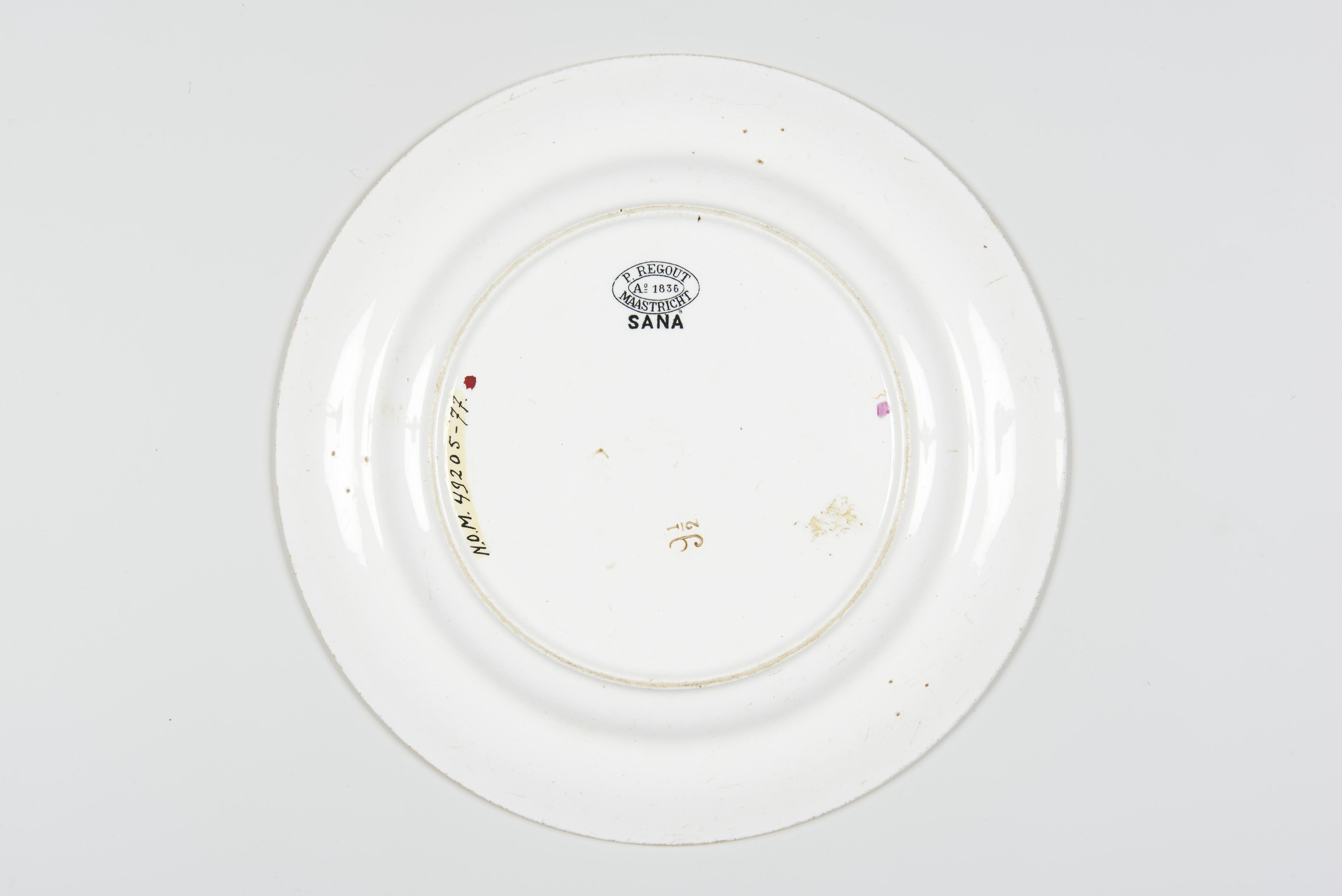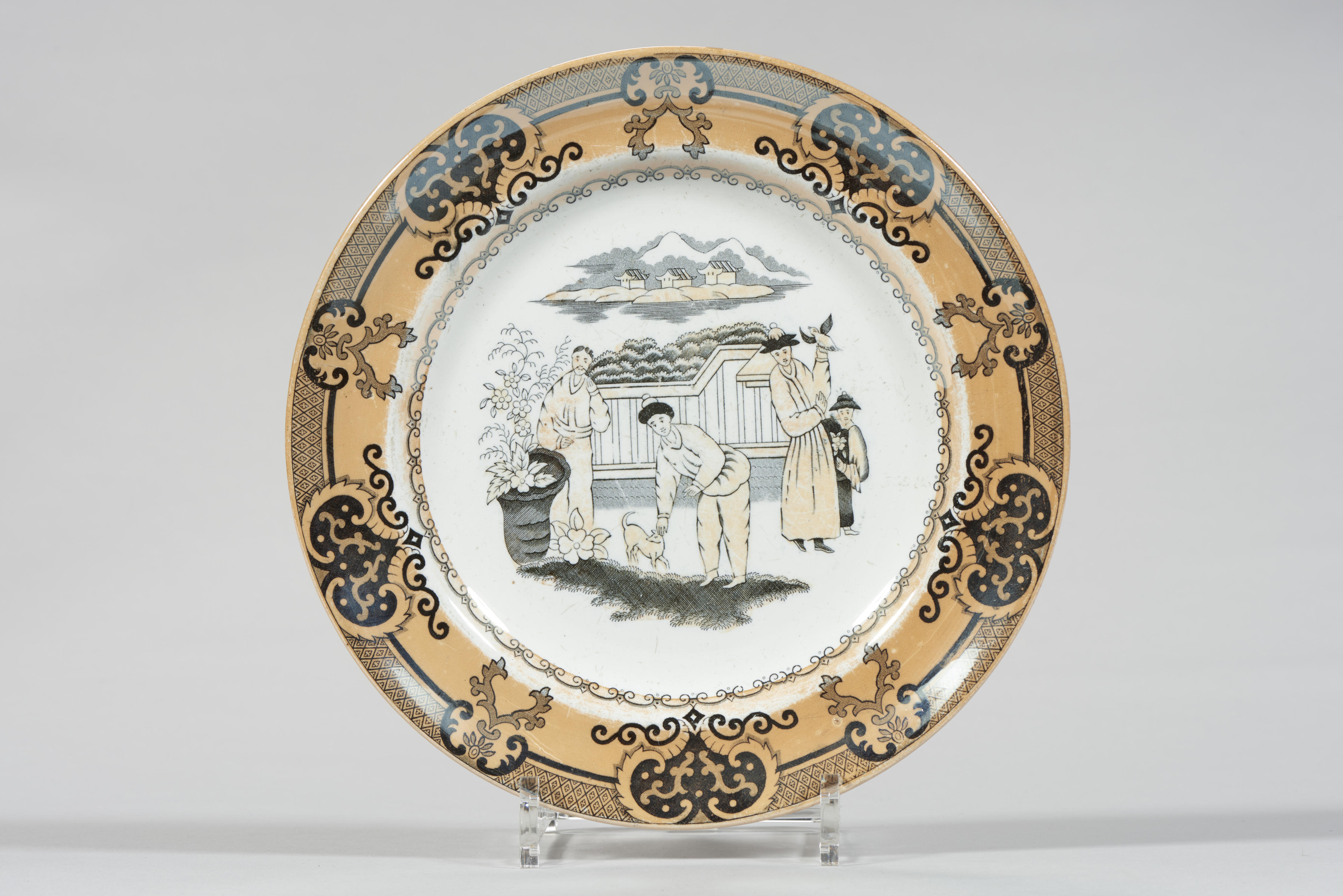 Bord van Engels aardewerk met op het middenvlak een voorstelling van vier mensfiguren in een tuin. De tweede figuur van rechts heeft een vogel op de hand. De figuur in het midden aait een hond. Op de achtergrond zijn gebouwen en bergen te zien.