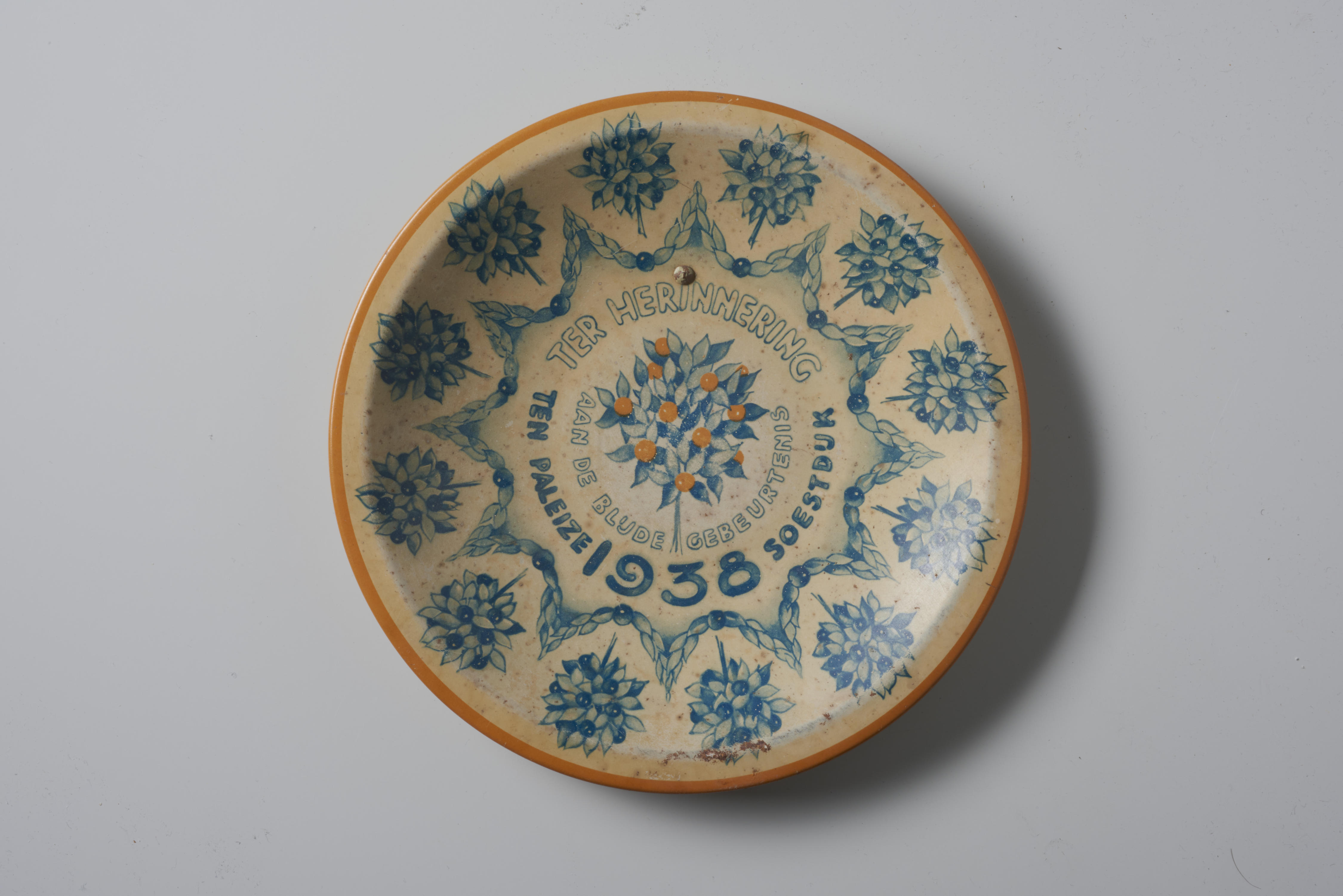 Gedenkbord, uitgebracht ter gelegenheid van de geboorte van prinses Beatrix in 1938. Het bord is versierd met oranjebomen en de tekst: 'Ter Herinnering aan de blijde gebeurtenis Ten Paleize 1938 Soestdijk'.