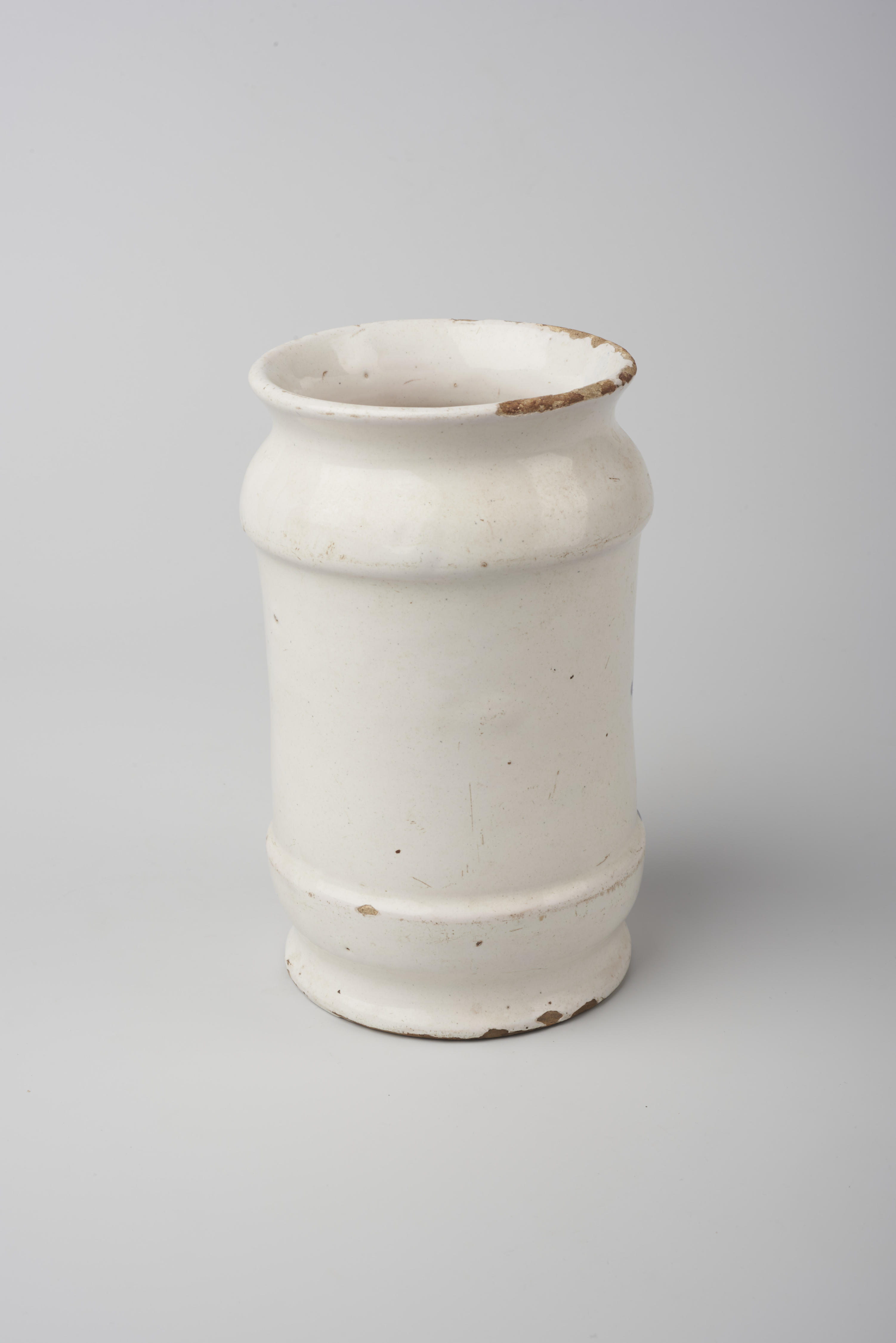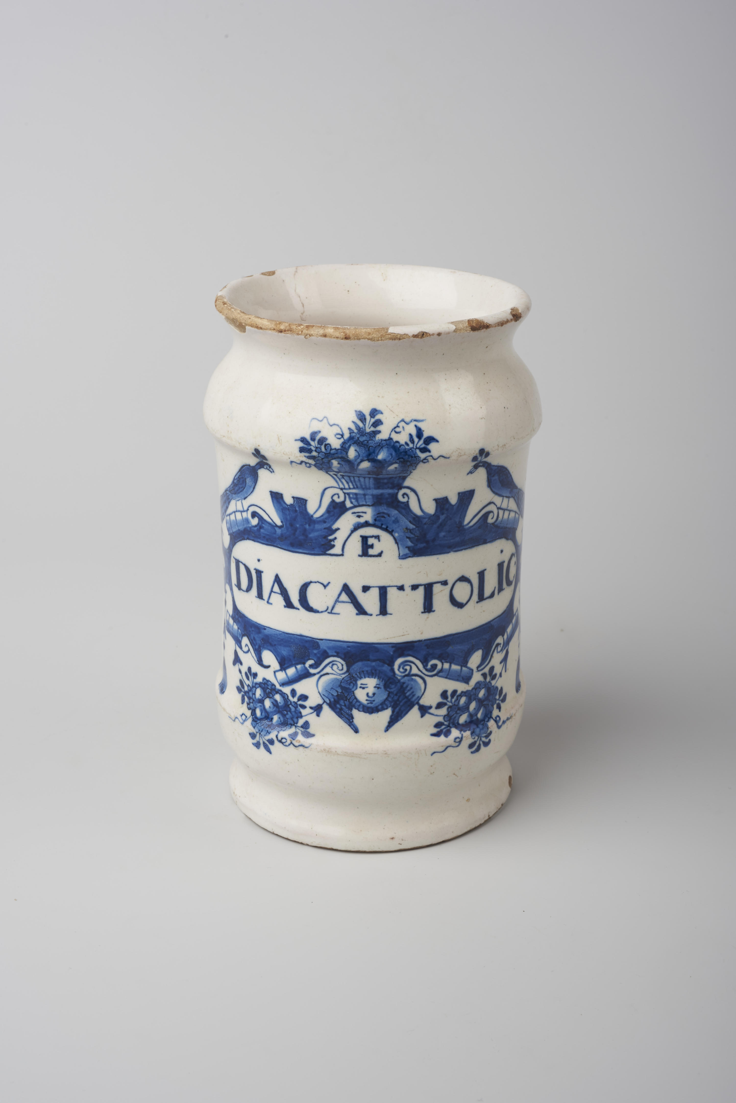 Zalfpot, versierd met bloemen, vogels en engelenkopjes. In de cartouche staat de tekst: 'E DIACATTOLIC' (likkepot van pruimen).