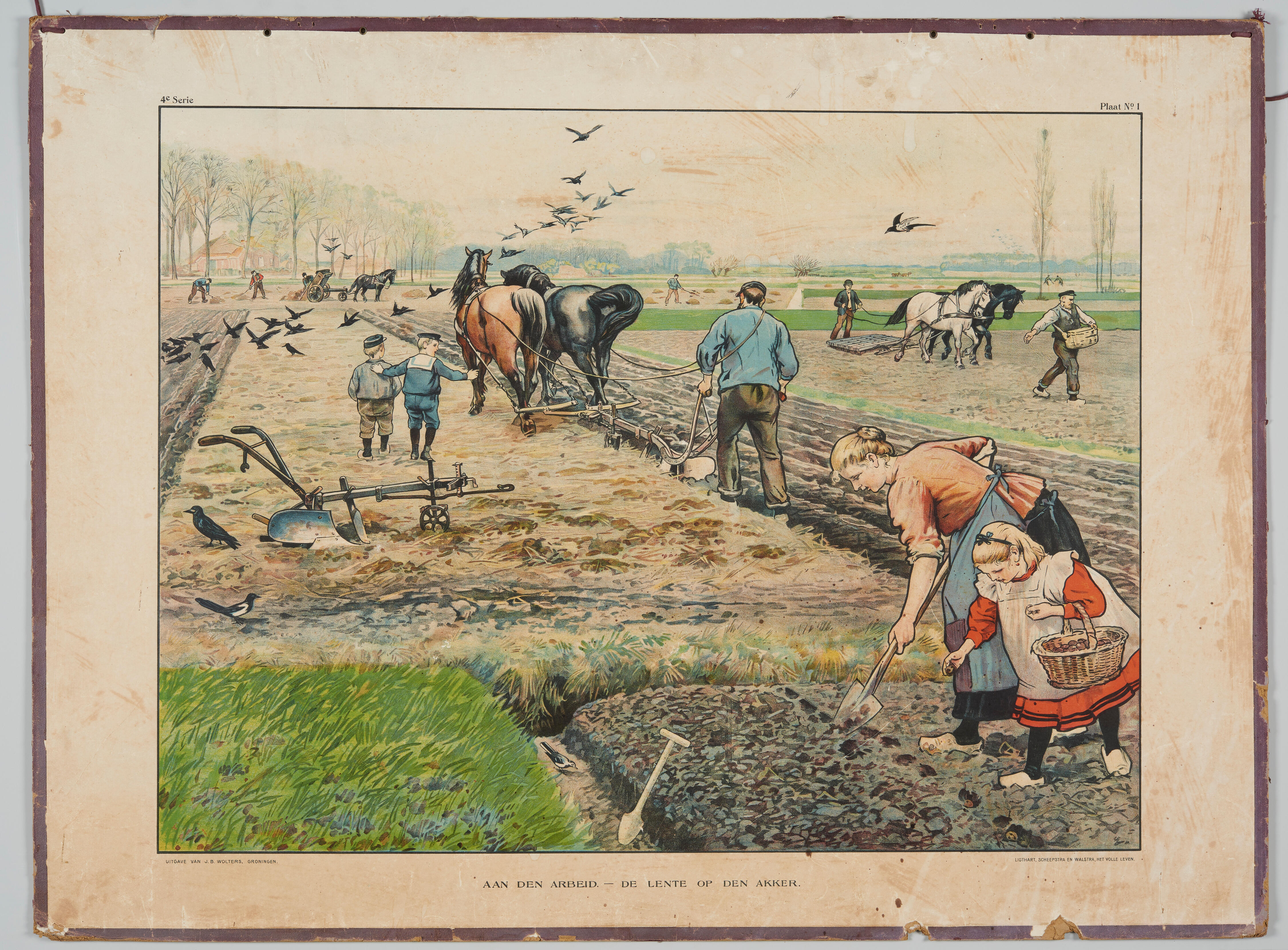 Schoolplaat in kleurendruk met een afbeelding van een akker met ploegende, eggende en zaaiende mensen. Mannen, vrouwen en kinderen werken allemaal op het land. Paarden trekken de landbouwwerktuigen. Linksboven de afbeelding staat: '4e Serie' en rechtsboven: 'Plaat no. 1'. Linksonder staat de naam van de uitgever vermeld: 'Uitgave van J.B. Wolters, Groningen', terwijl op eerdere ...