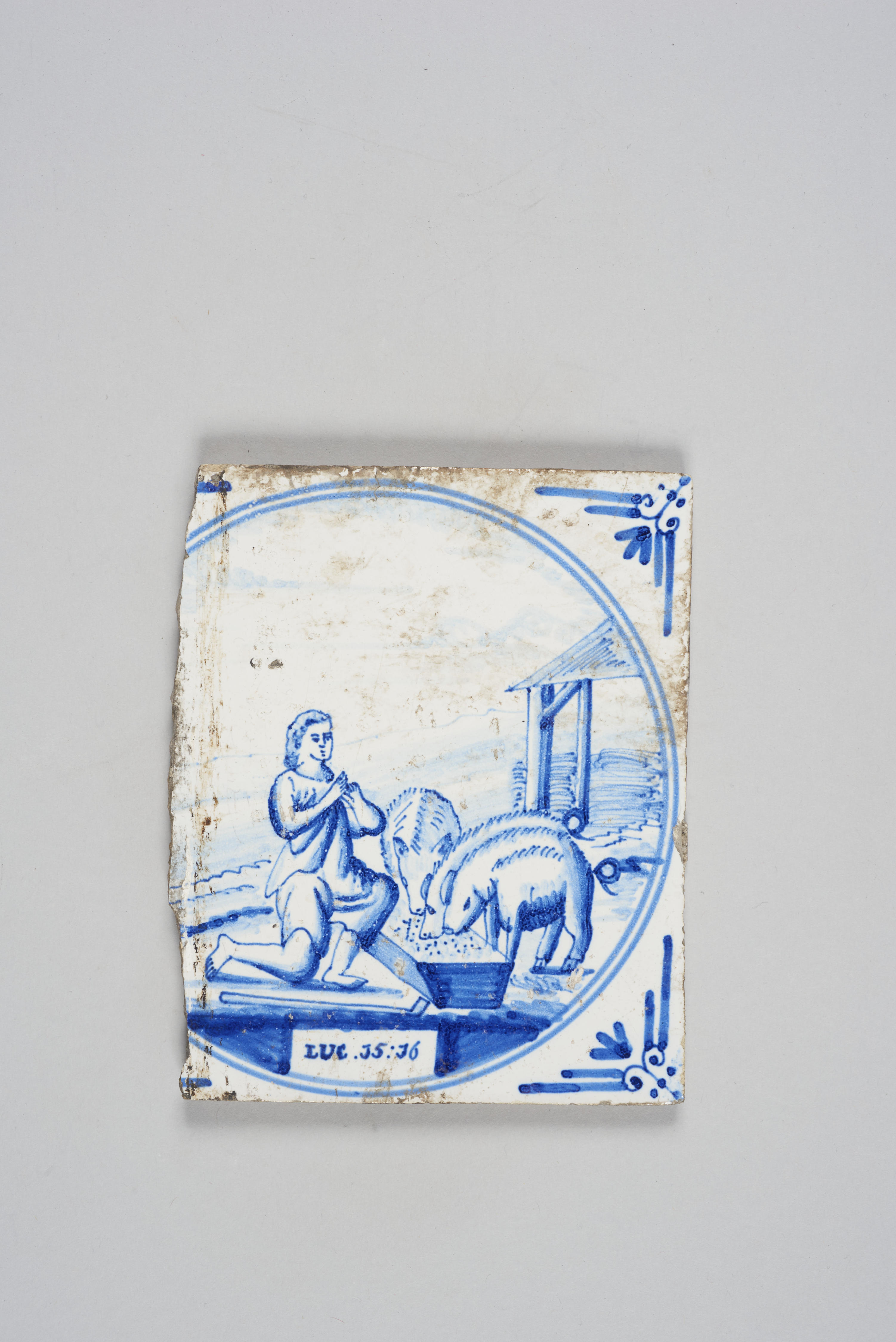 Wandtegel (gebroken) met een Bijbelse voorstelling (de verloren zoon) in een cirkel; blauw; hoekmotief: ossenkop.
