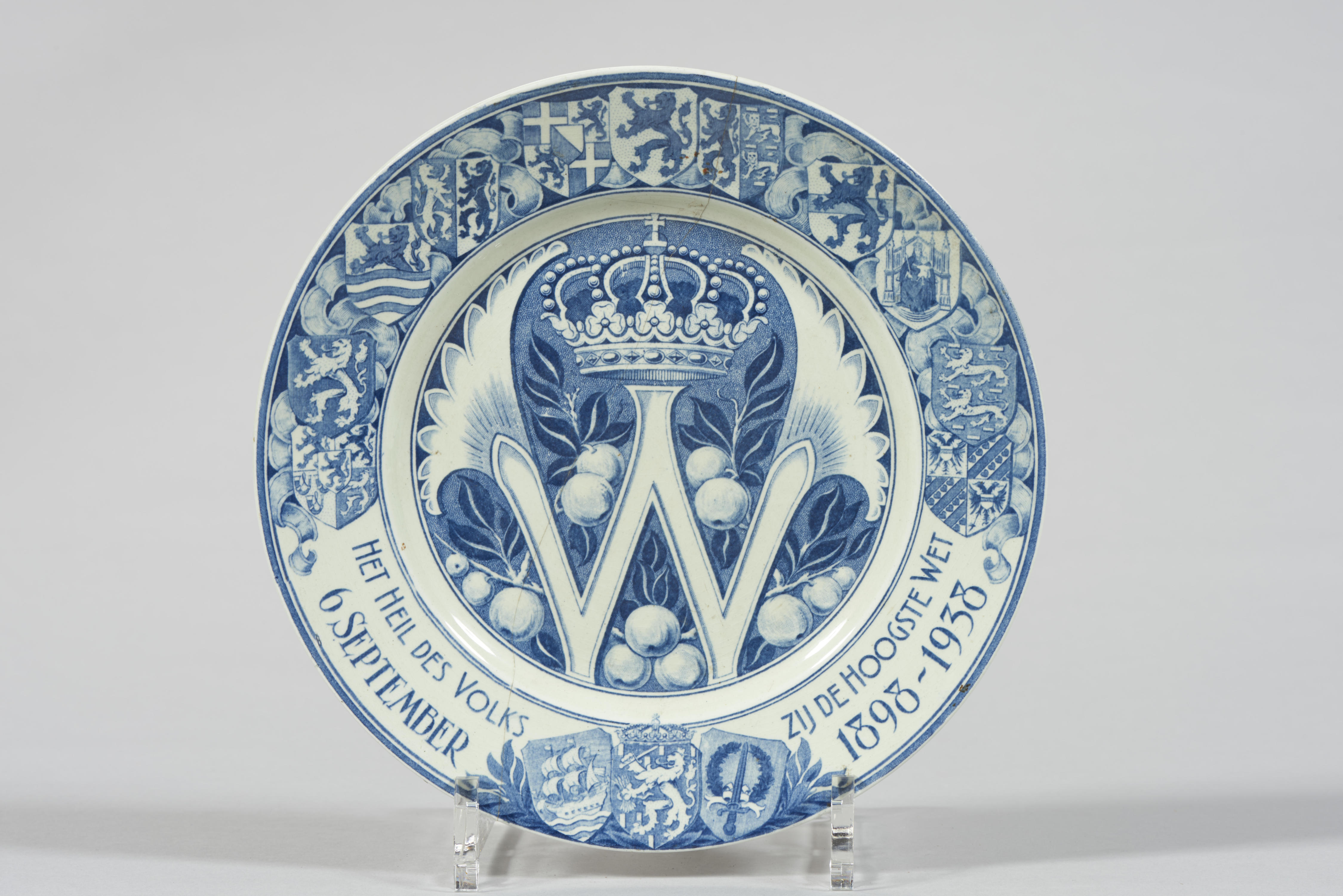 Gedenkbord, uitgebracht ter gelegenheid van het veertigjarige regeringsjubileum van koningin Wilhelmina in 1938. Op het midden van het bord is een gekroonde ‘W’ met oranjeappels afgebeeld. De rand van het bord is versierd met wapenschilden. Langs de onderrand staat de tekst: ‘Het Heil des Volks Zij de Hoogste Wet 6 september 1898-1938’.