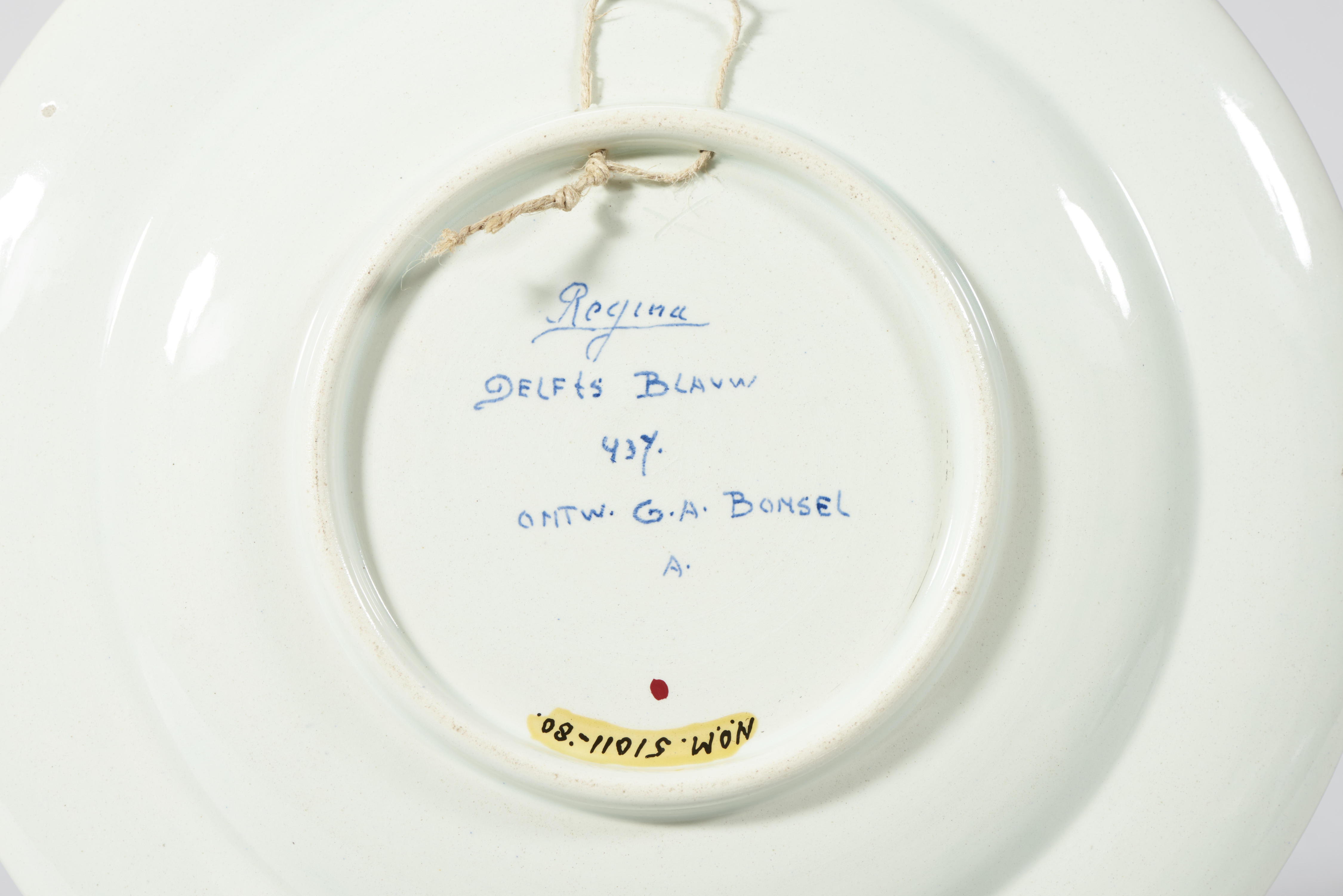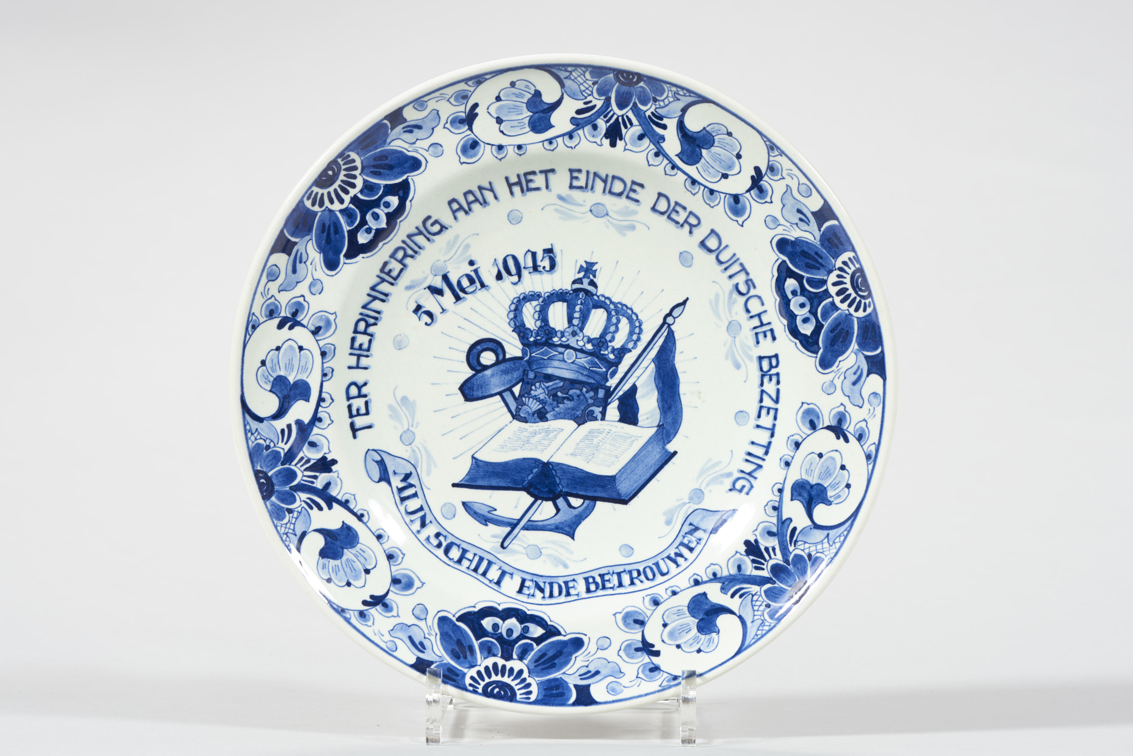 Gedenkbord met op het middenvlak afbeeldingen van een kroon, een anker, een Nederlandse vlag, een bijbel en een schild met de Nederlandse leeuw. Rondom de afbeeldingen staat de tekst: 'Ter herinnering aan het einde der Duitsche bezetting / mijn schilt ende betrouwen / 5 Mei 1945'. De rand van het bord is versierd met gestileerde ...