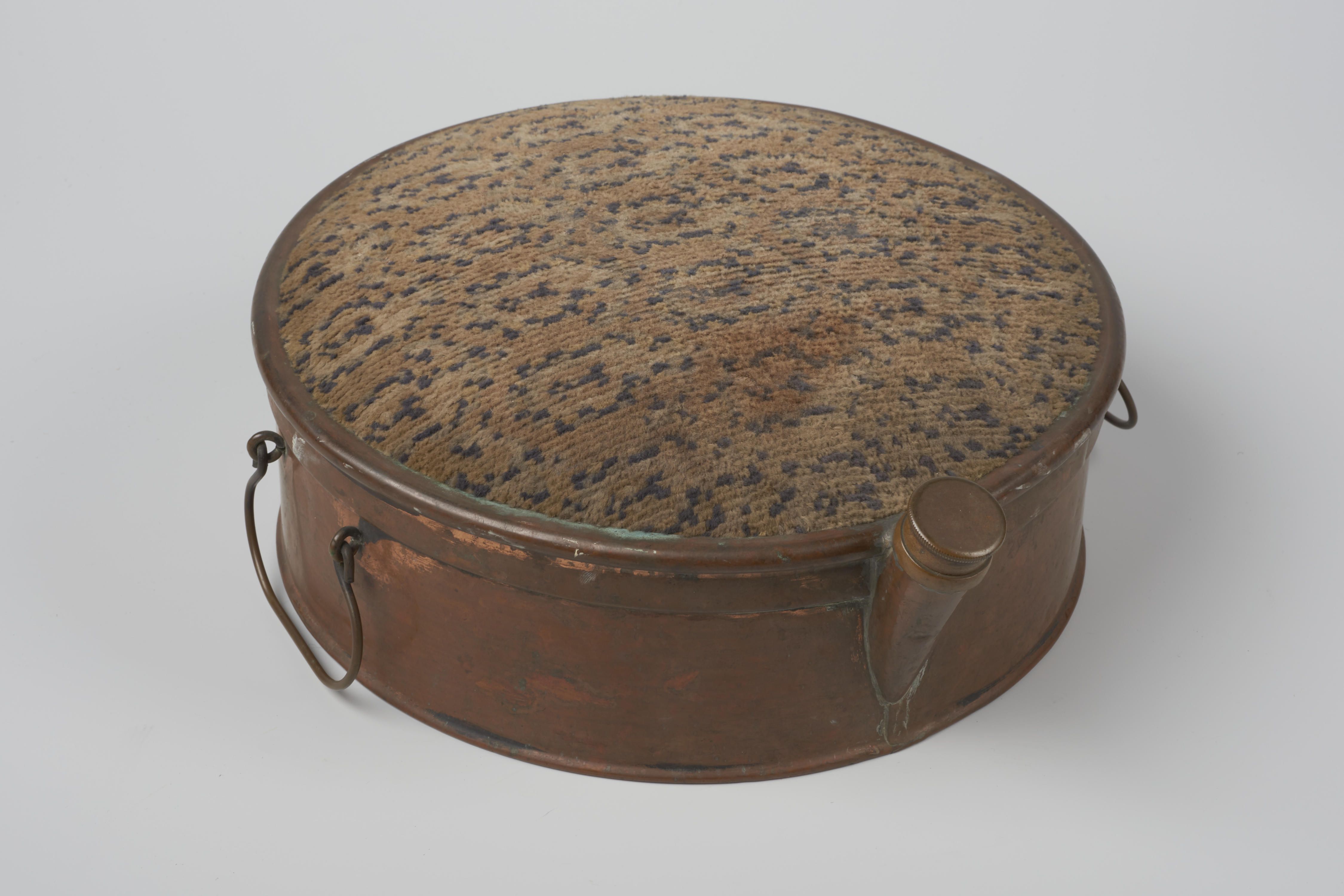 Koperen warmwaterstoof, aan de bovenzijde bekleed met textiel.