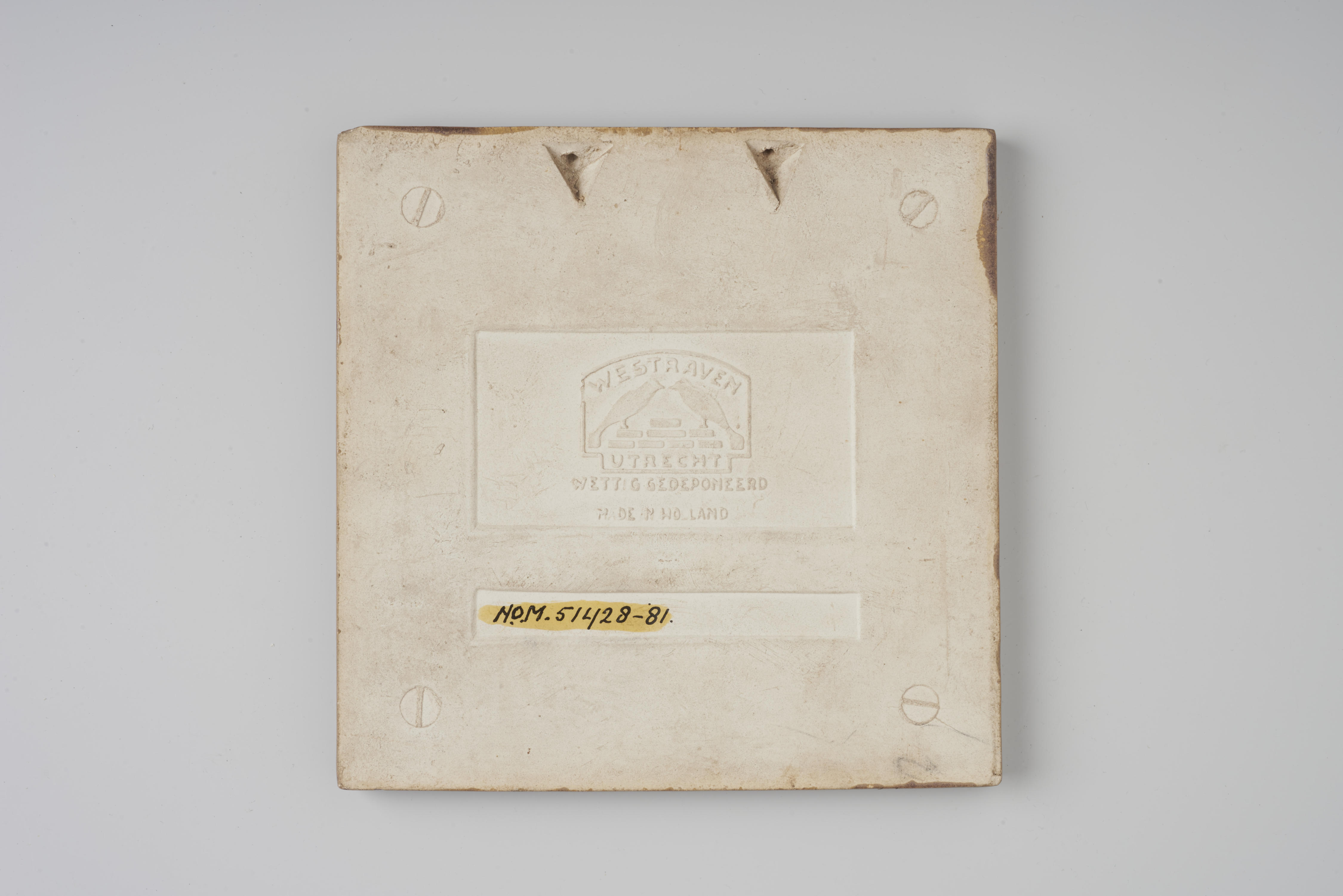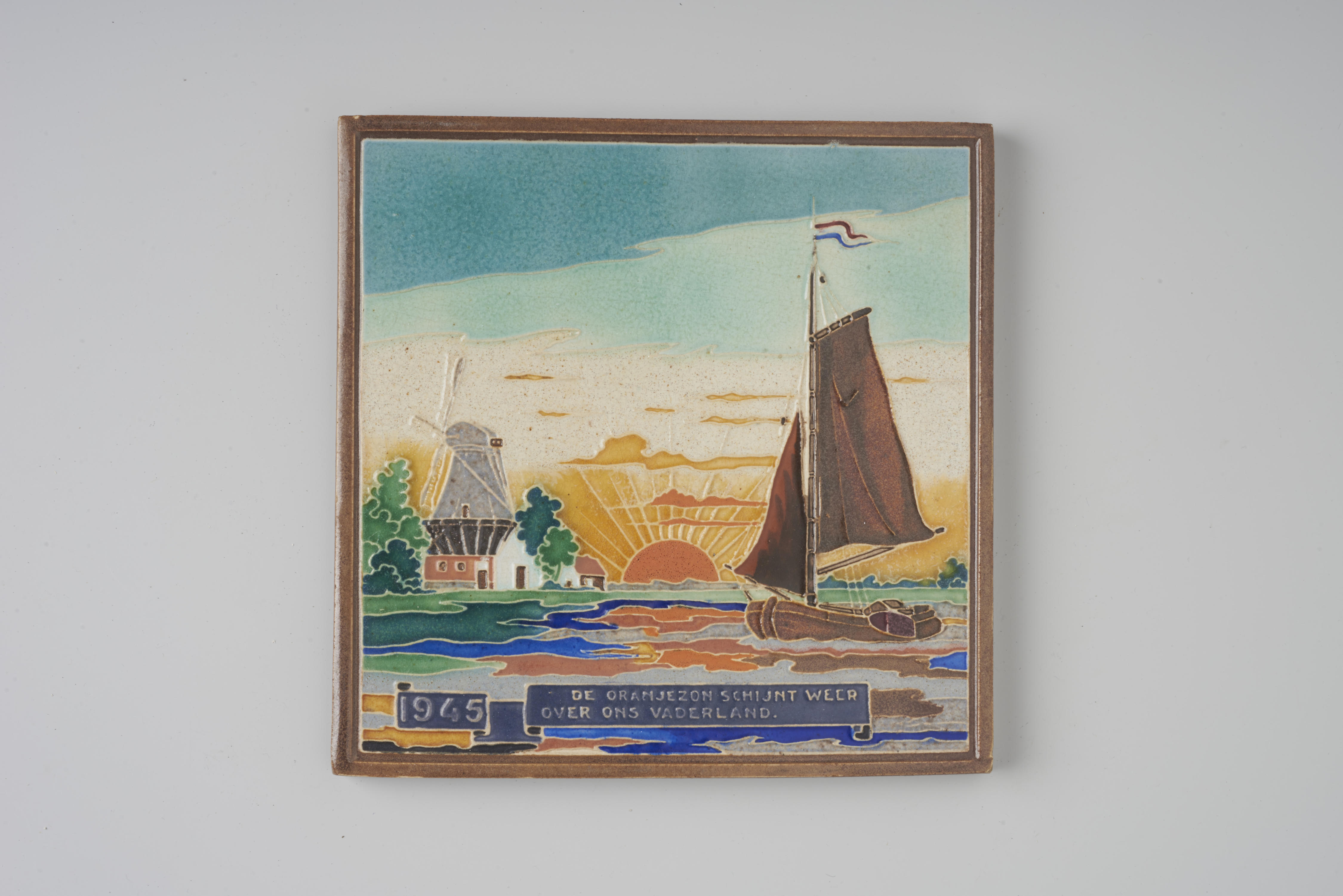 Gedenktegel met een voorstelling van een zeilboot op het water met op de achtergrond een molen en een opkomende zon. Het onderschrift luidt: '1945 De Oranjezon schijnt weer over ons vaderland.'
