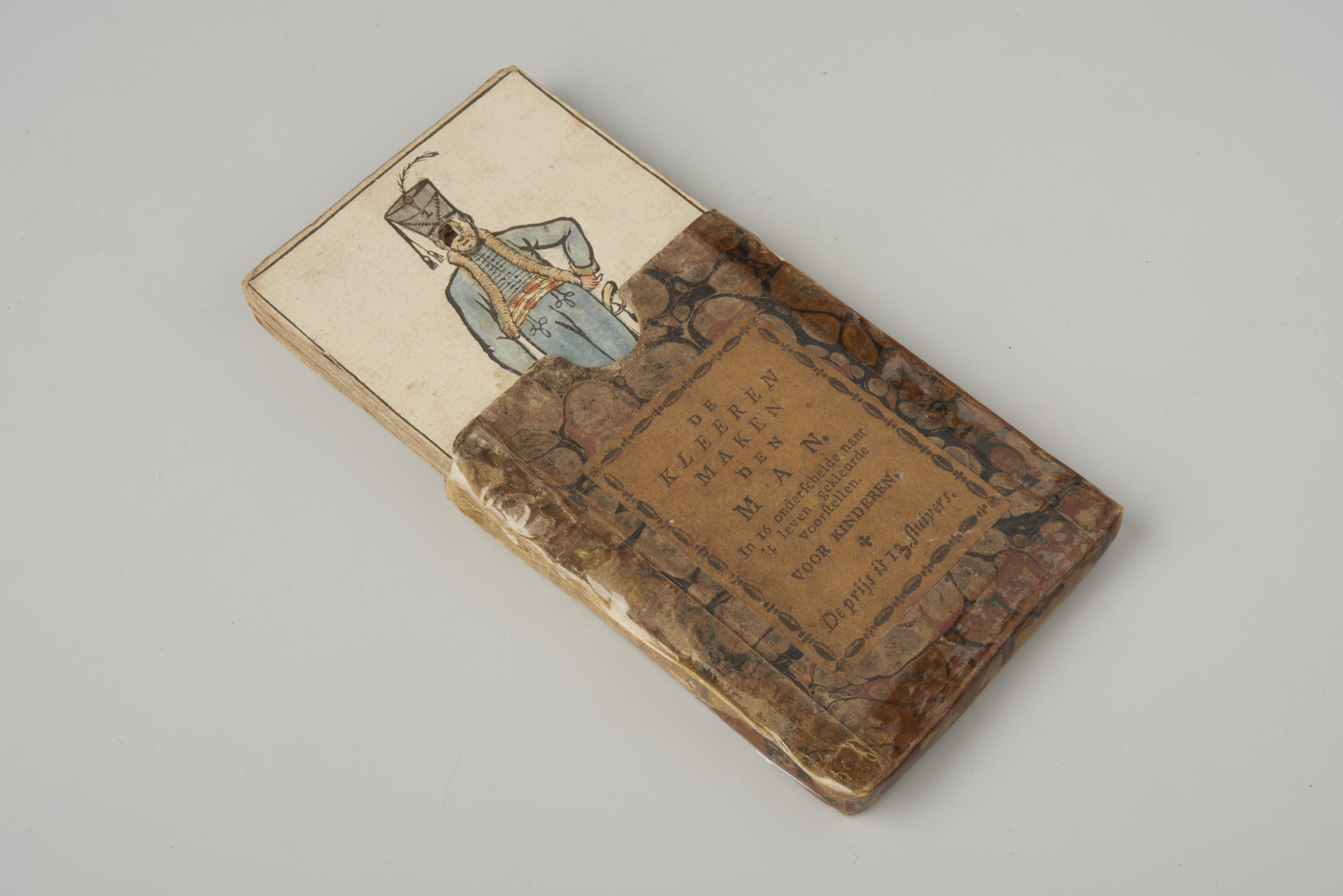 Spel met de titel 'De kleeren maken den man', een legspel met vijftien kaartjes waarop personen zonder gezicht staan afgebeeld, zoals een boer, een soldaat en een visvrouw. De zestiende kaart dient steeds onderop te blijven liggen. Dit is een kaart met een afbeelding van een naakt figuur met een gezicht en een masker in ...