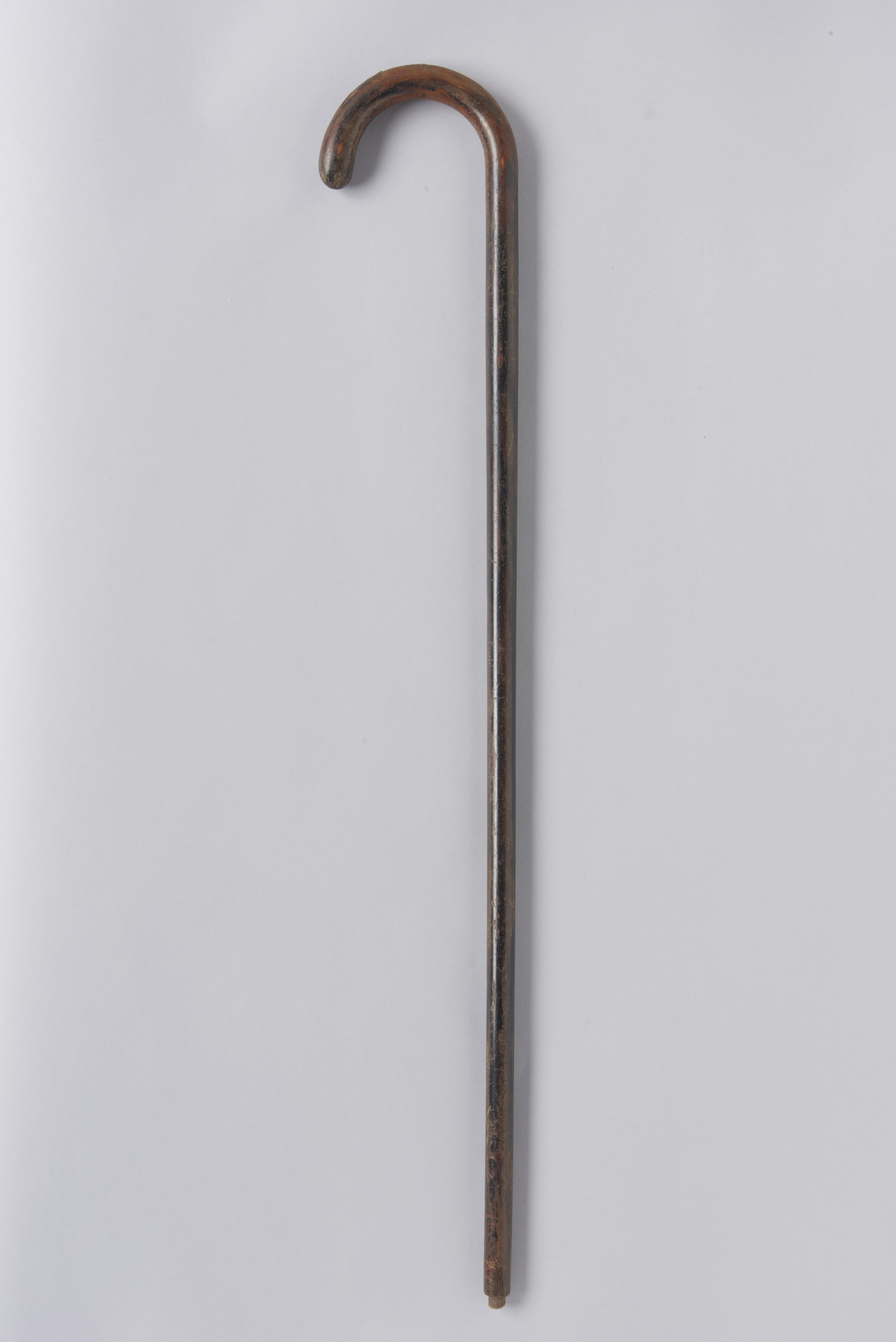 Houten wandelstok met gebogen greep.