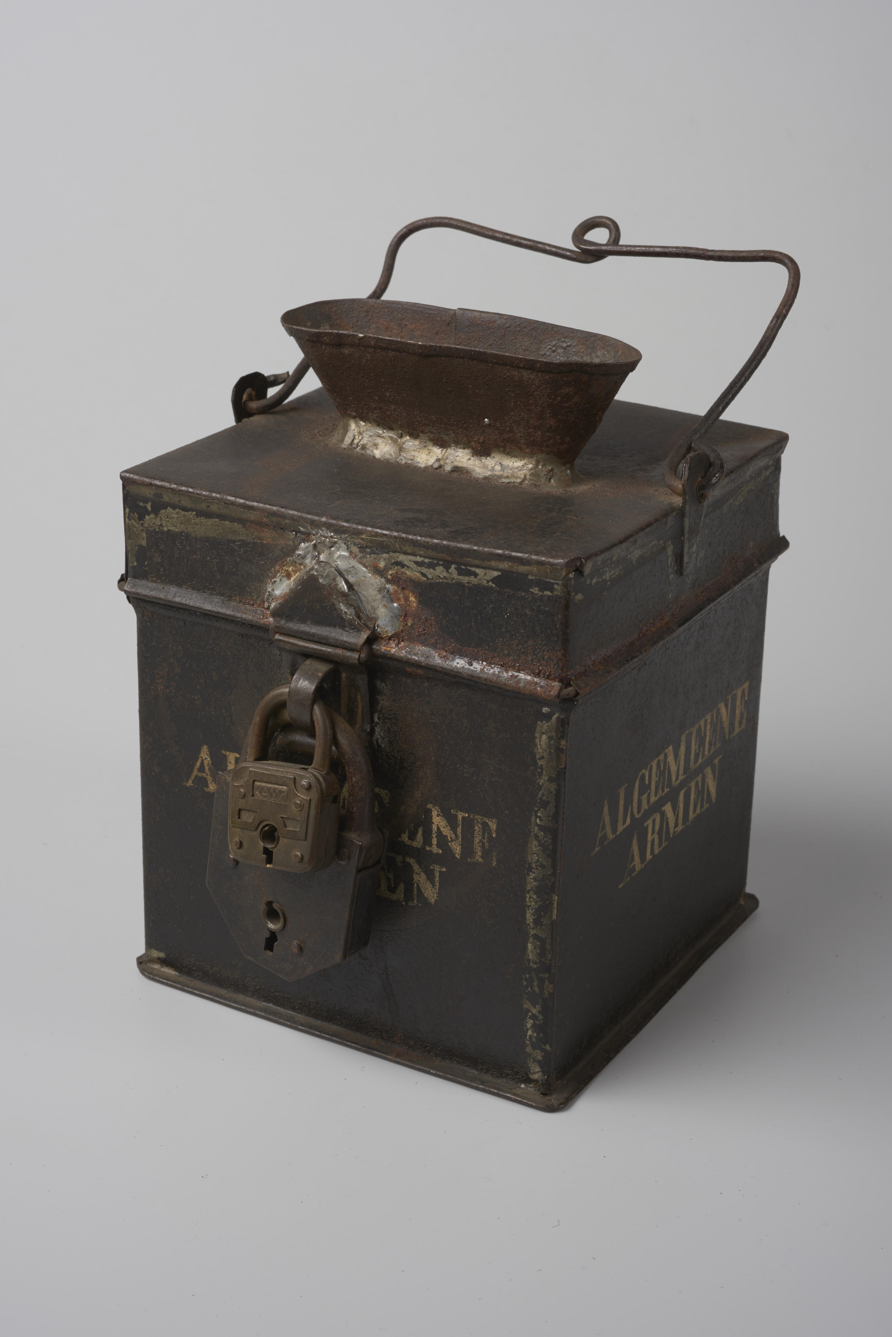 Zwart gelakte blikken collectebus of 'armenbus'. Op de zijkanten staat het opschrift: 'Algemeene Armen'. Liefdadigheid was burgerplicht. Collectebussen voor de ‘algemene armen’ die niet konden terugvallen op een kerkgenootschap waren in de negentiende eeuw overal in Nederland te vinden. Het Nationaal Crisiscomité (1931-1936) stuurde zo’n negenhonderd plaatselijke comités aan die in de crisisjaren fondsen wierven ...