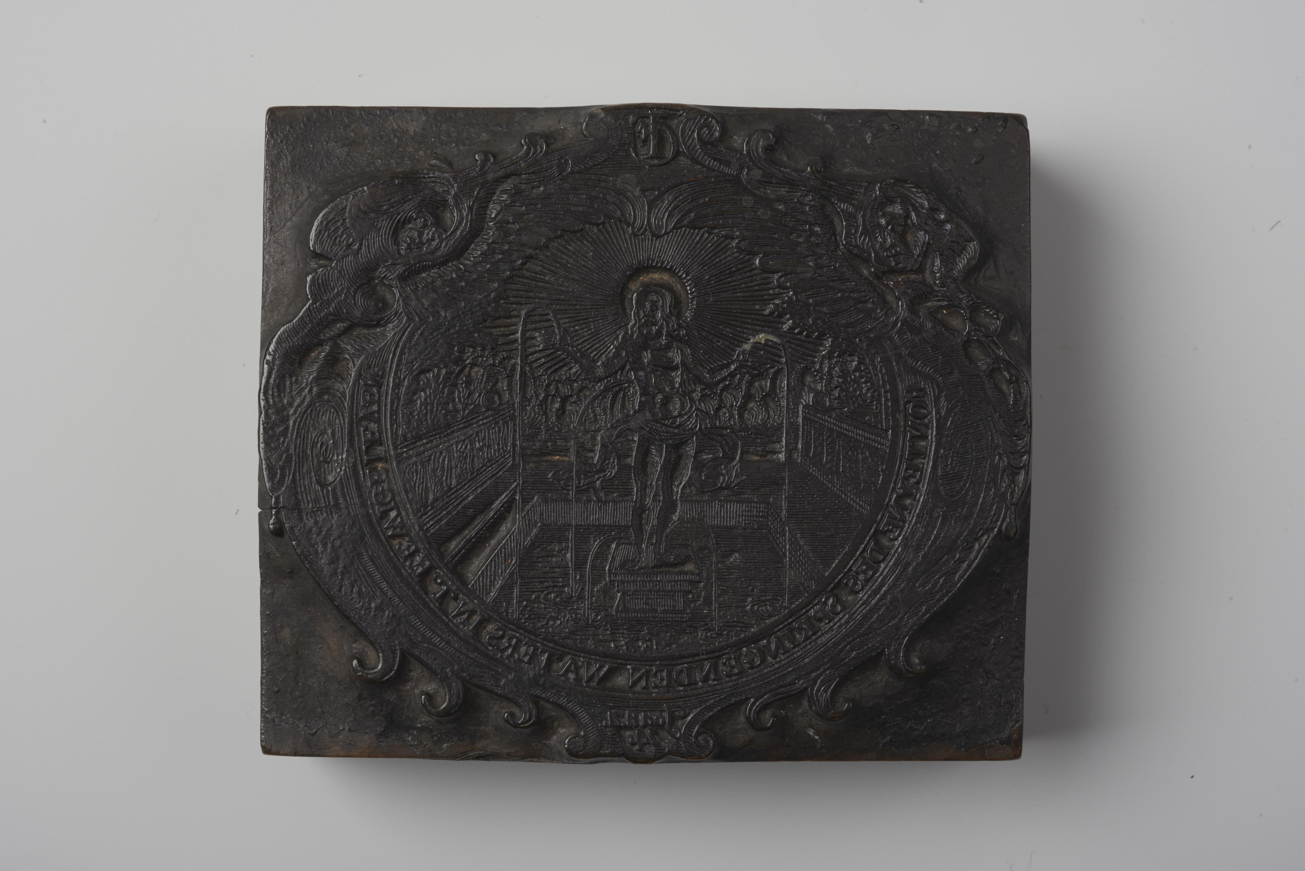 Houten cliché met de voorstelling van Christus als fontein des levens, met het randschrift: 'Fonteyne des Springenden Waters, In 't Eeuwige Leven Joh. 4:14'.