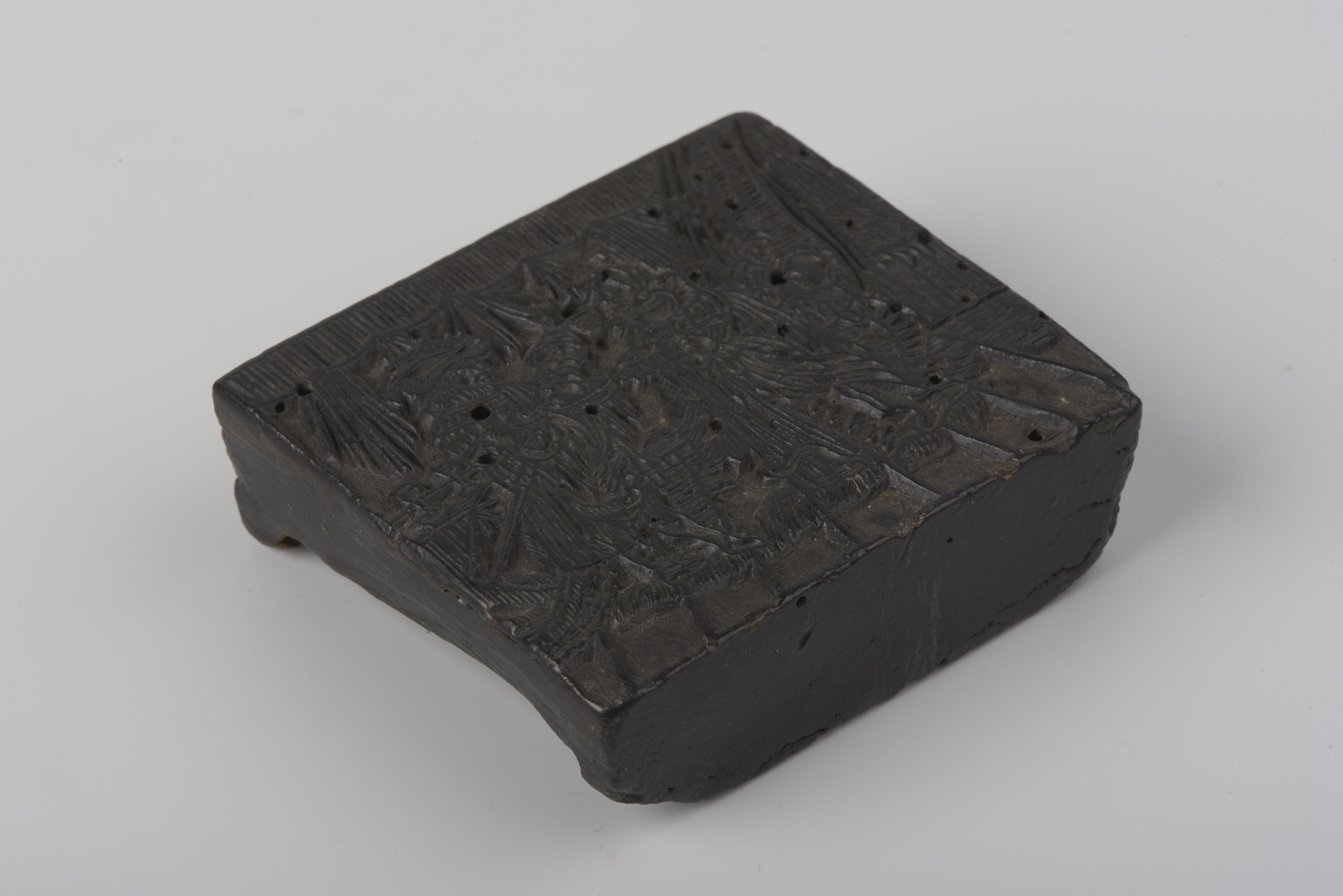 Houten cliché met de voorstelling van twee mannen en een vrouw in een interieur.