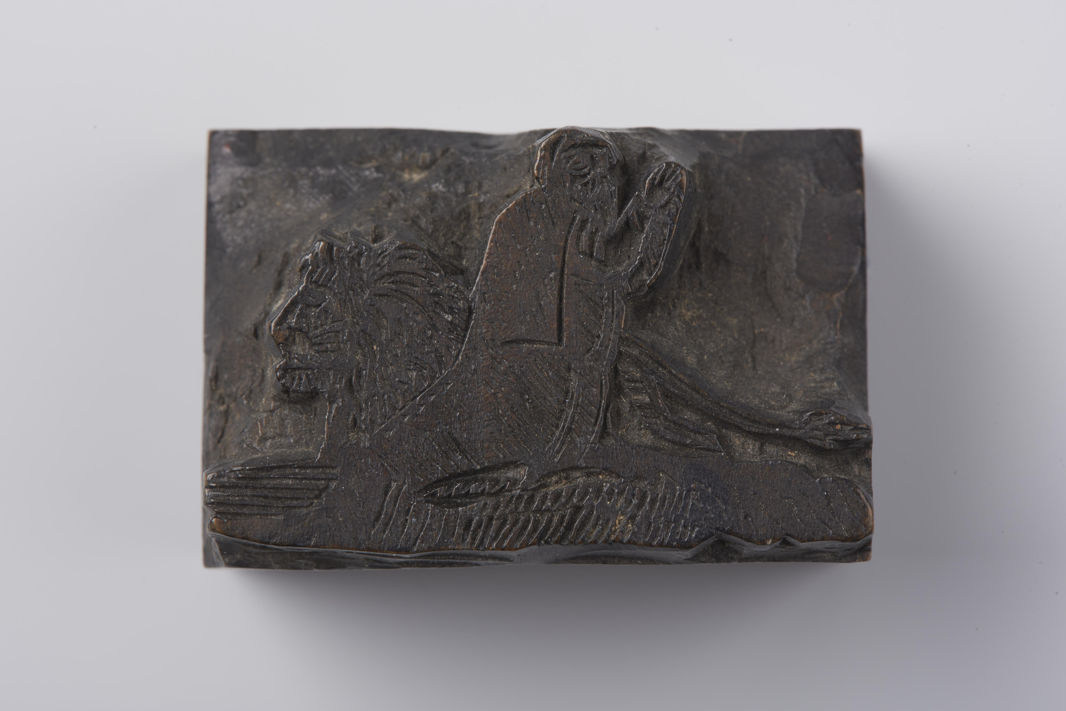 Houten cliché met de voorstelling van een man, geknield bij een liggende leeuw.