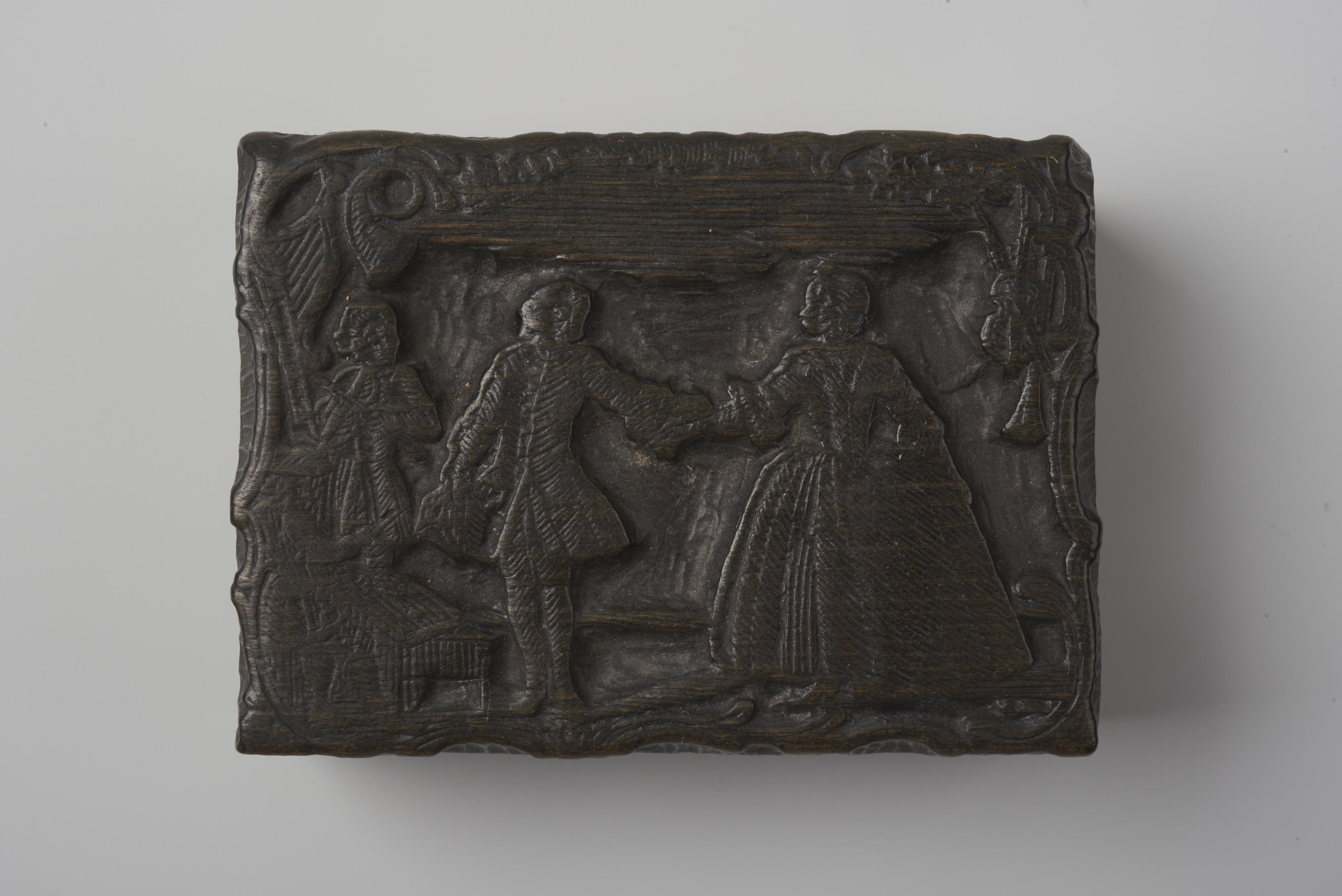Houten cliché met de voorstelling van een dansende man en vrouw. Links in de hoek staat een violist.