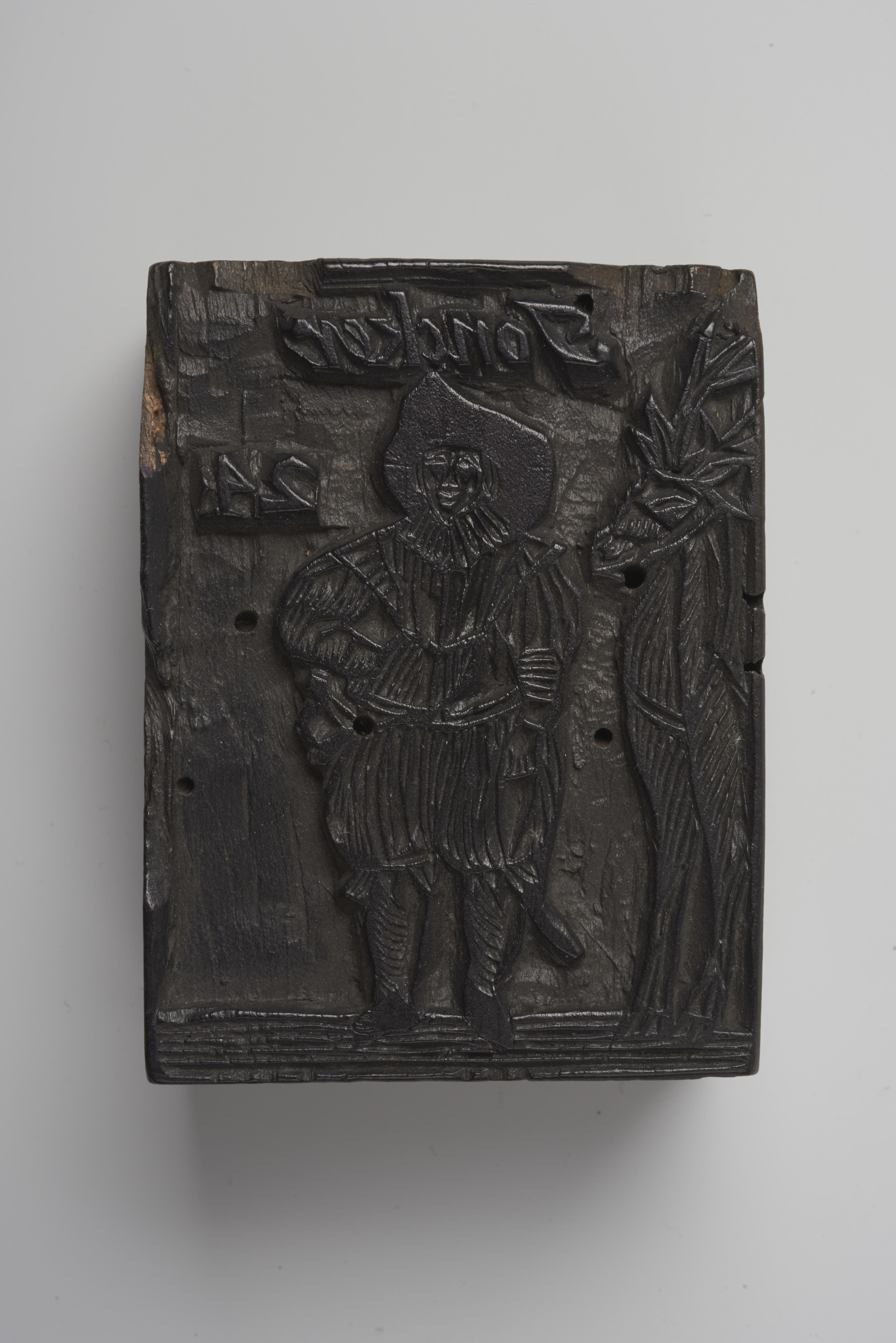 Houten cliché met de voorstelling van een jonker met een hert.