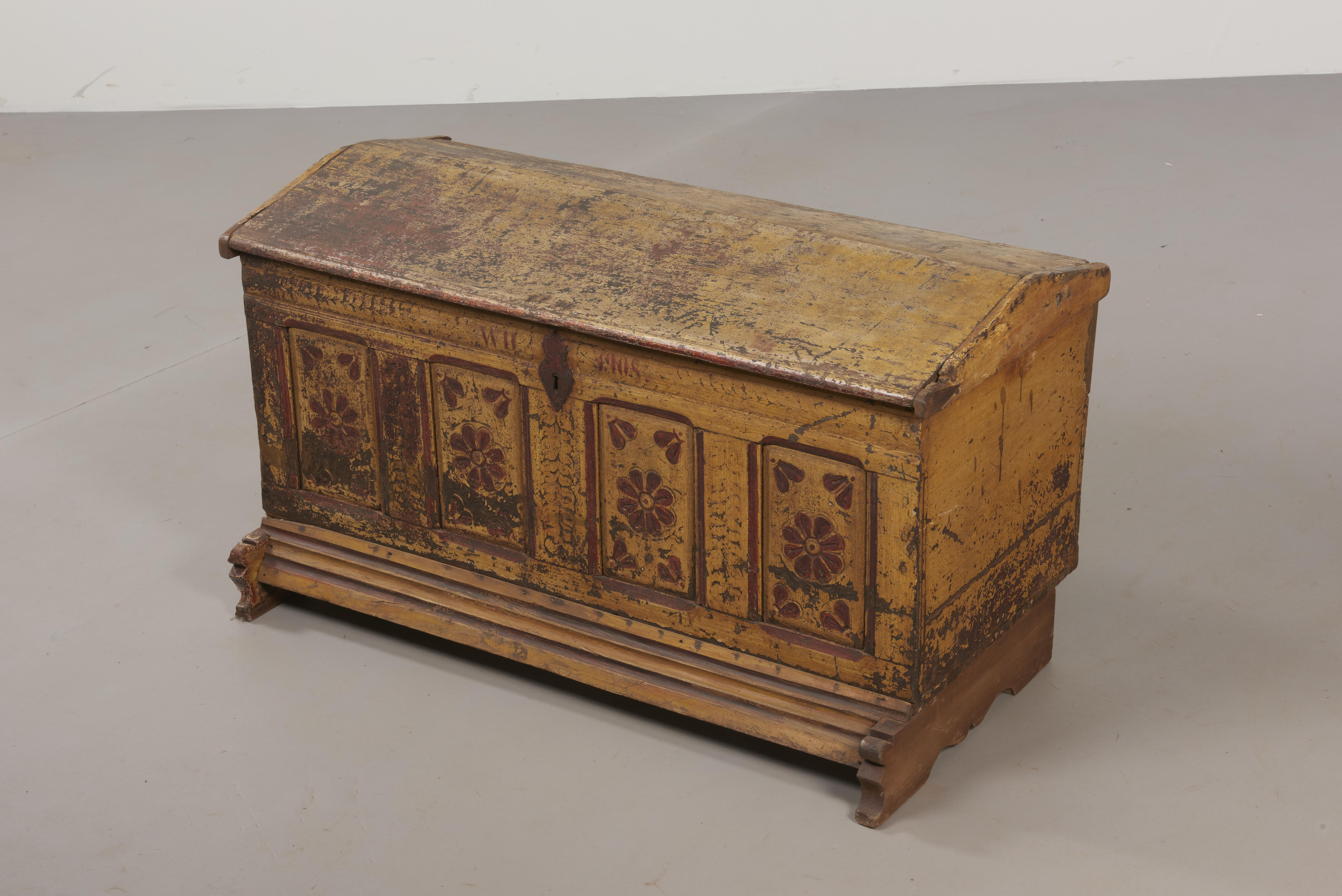 Eikenhouten en iepenhouten kist, afkomstig uit Staphorst. De kist is aan de voorzijde versierd met vier bloemen. Links van het sleutelgat staan de initialen 'WD'; rechts is het jaartal '1908' te zien. Het jaartal 1908 betreft de laatste overschildering. De kist zelf dateert waarschijnlijk uit midden negentiende eeuw.