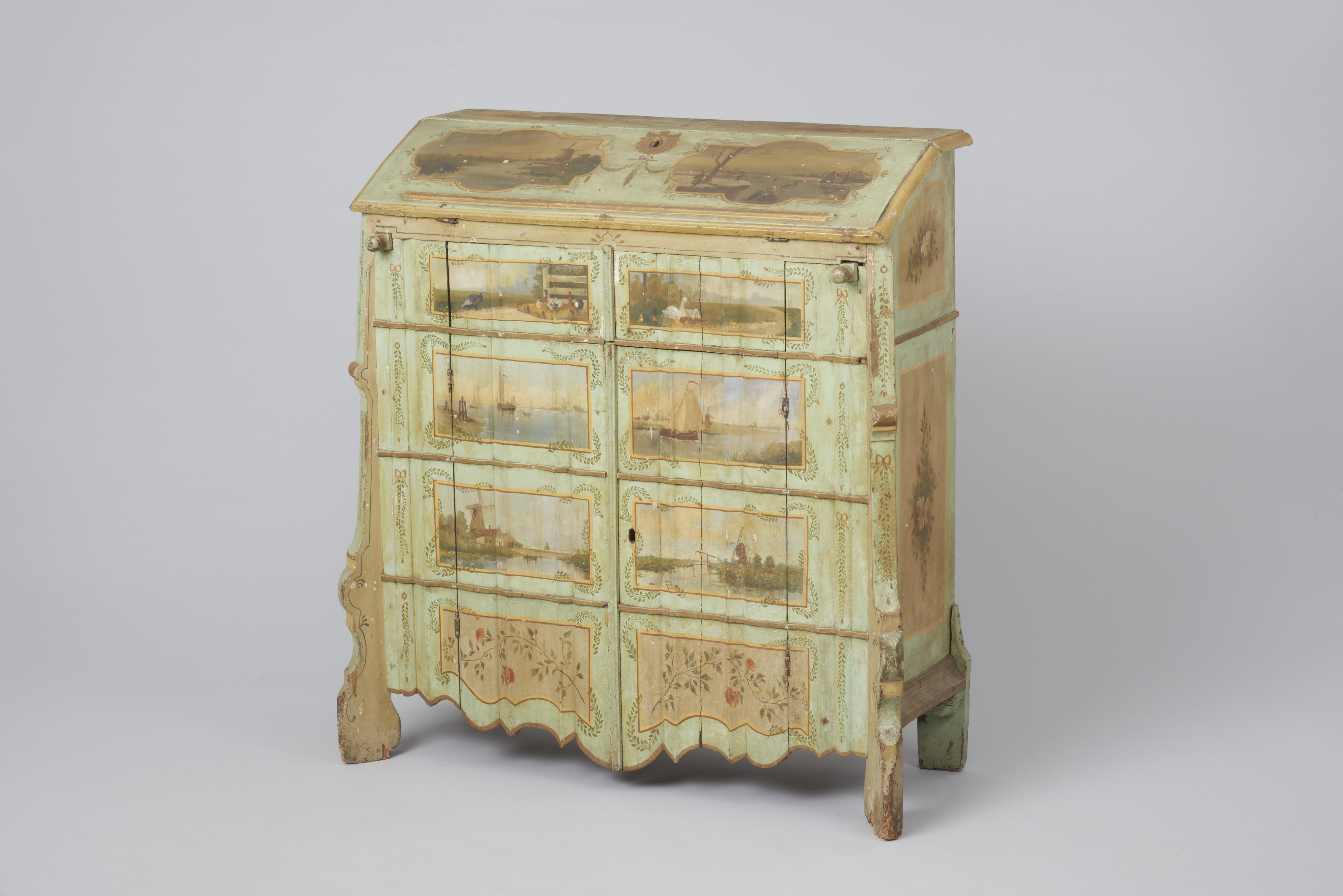 Bureau met een opklapbaar schrijfblad, laadjes en deurtjes. De originele beschildering bestond uit een roodbruine houtimitatie. De huidige figuratieve beschildering op het mintkleurige fond dateert van ná 1860. De scènes beslaan rivier- en zeegezichten, gevogelte, ijspret en naaktzwemmers met langs de oever een vrouw in streekdracht.
