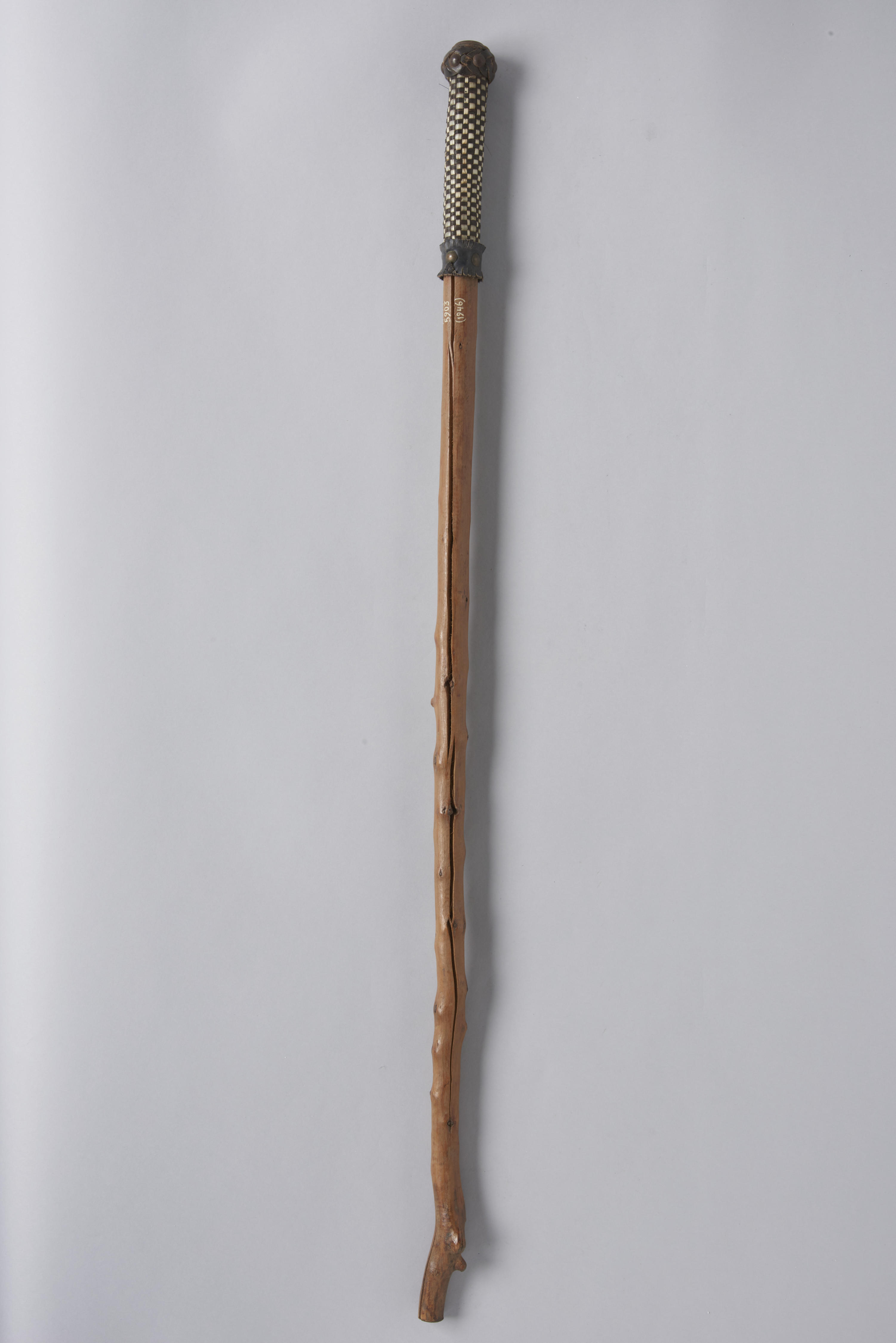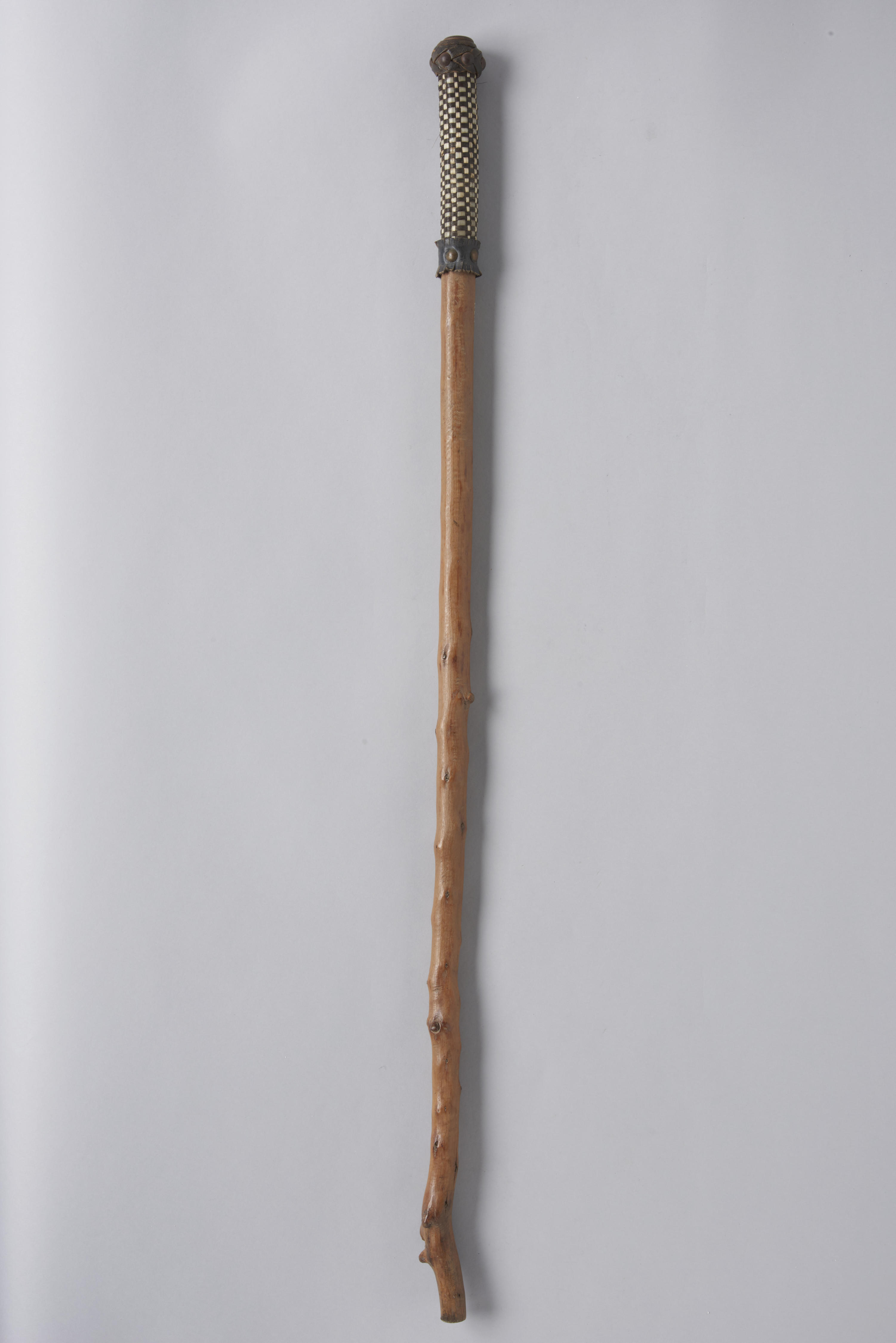 Houten wandelstok, zogenoemde goastok. Het handvat is gemaakt van paardenhaar, ganzenveren, leerwerk en metalen nagels. Bovenaan is een metalen plaatje aangebracht. Deze stok is in 1944 gemaakt door Gerrit Roosdom in Markelo.
