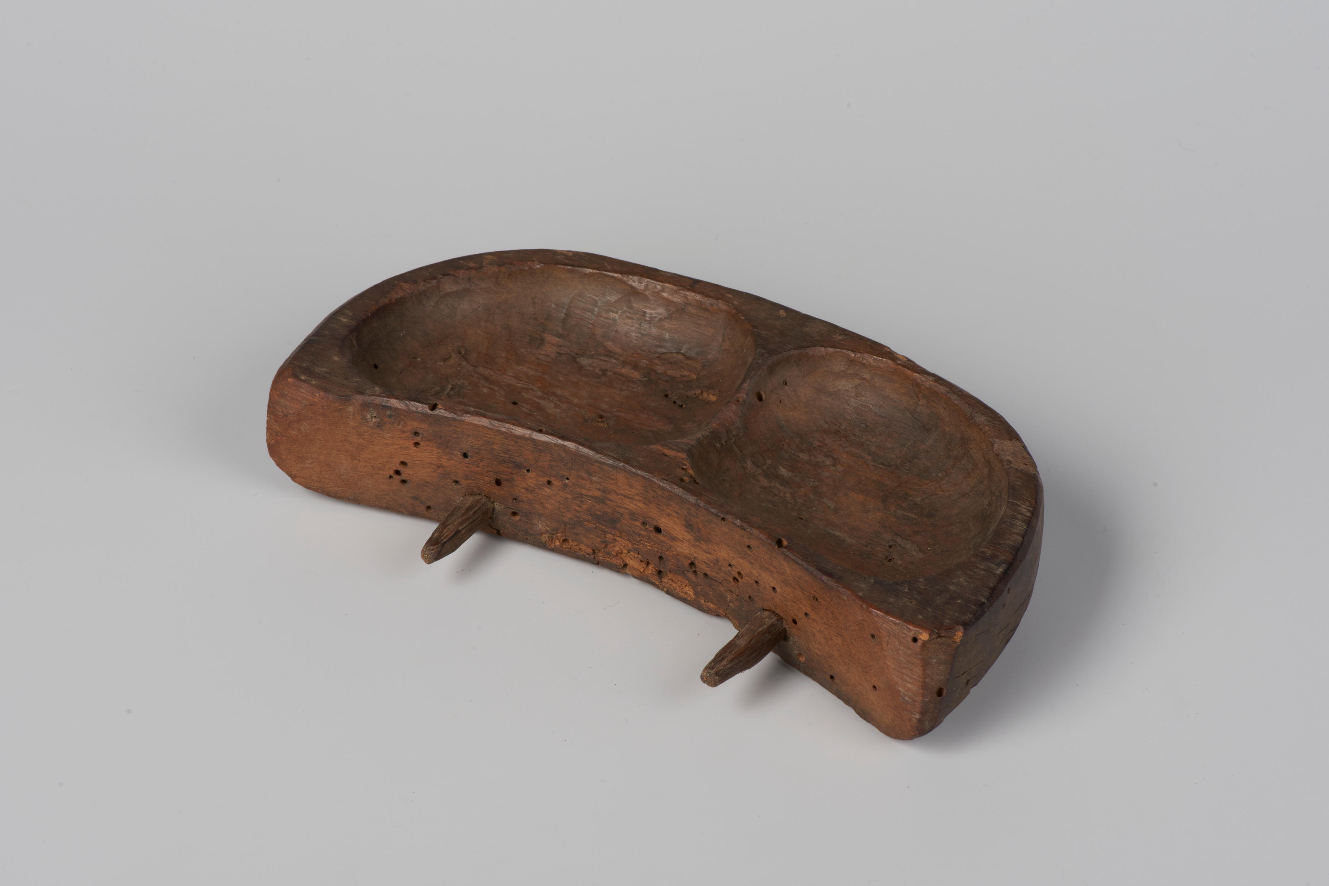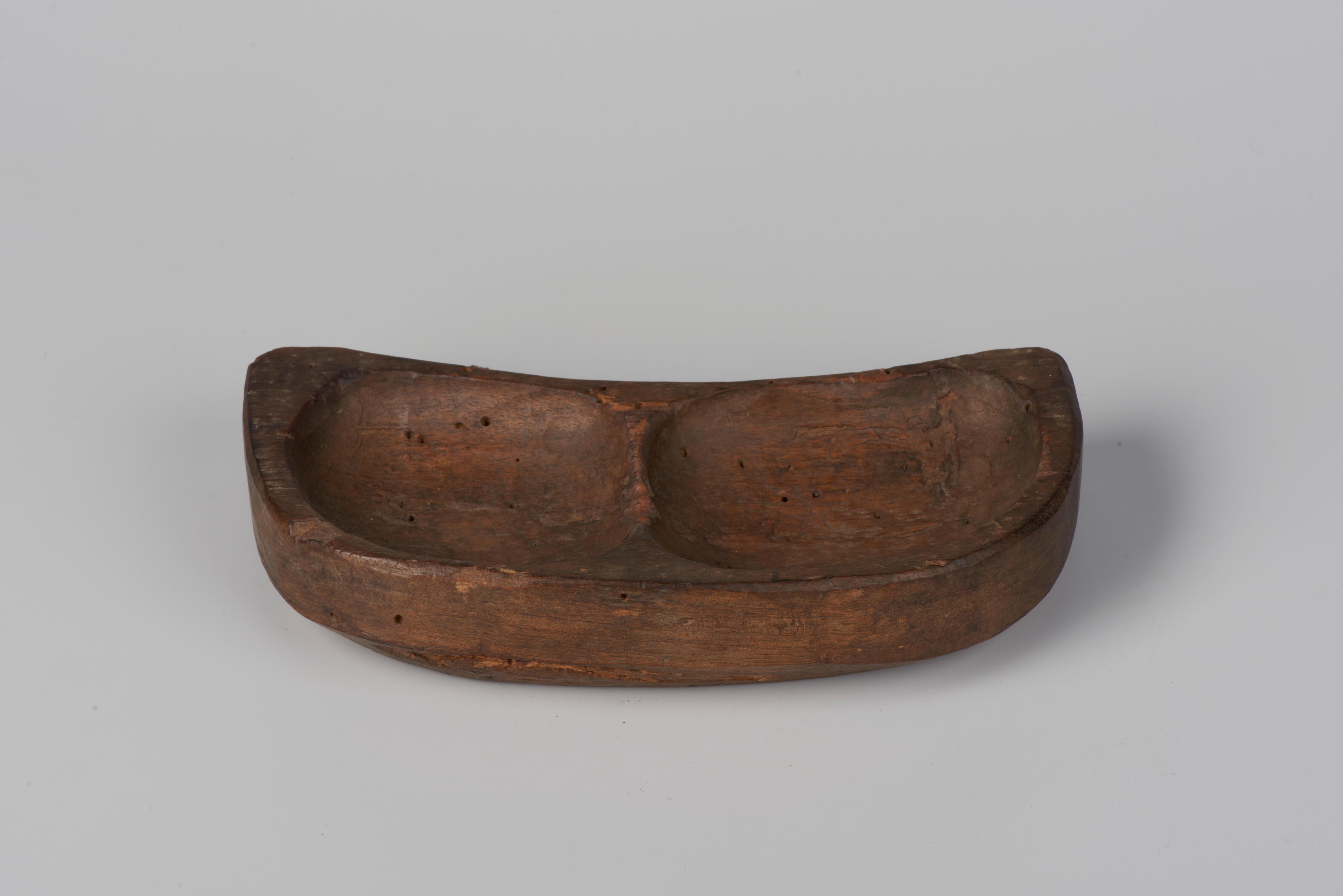 Voerbakje met twee pinnetjes voor op de buitenkant van de bijenkorf. Het gebruik van dergelijke bakjes veroorzaakt roverij: bijen uit andere korven gaan hier ook gebruik van maken. De bakje is waarschijnlijk gemaakt door een klompenmaker.