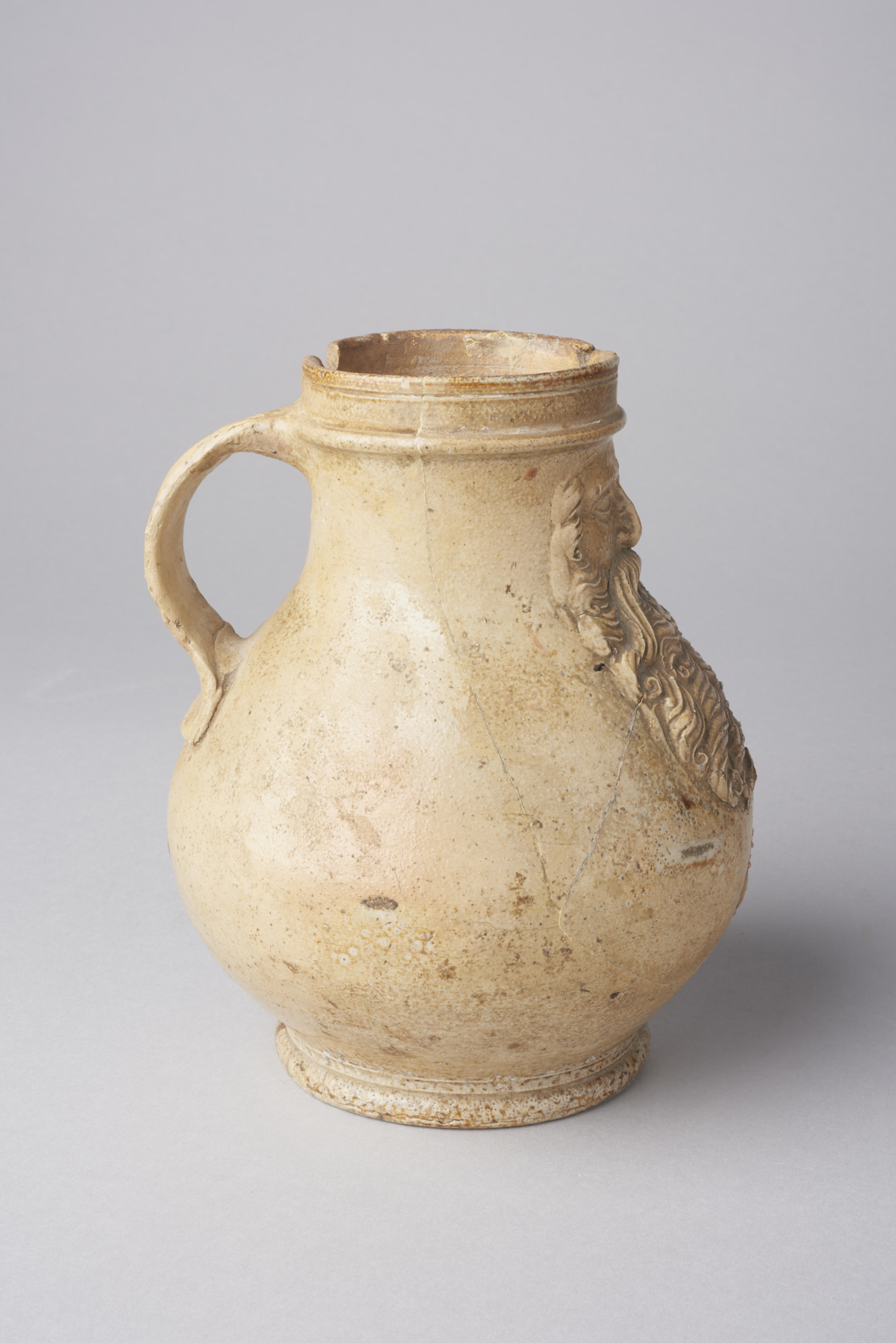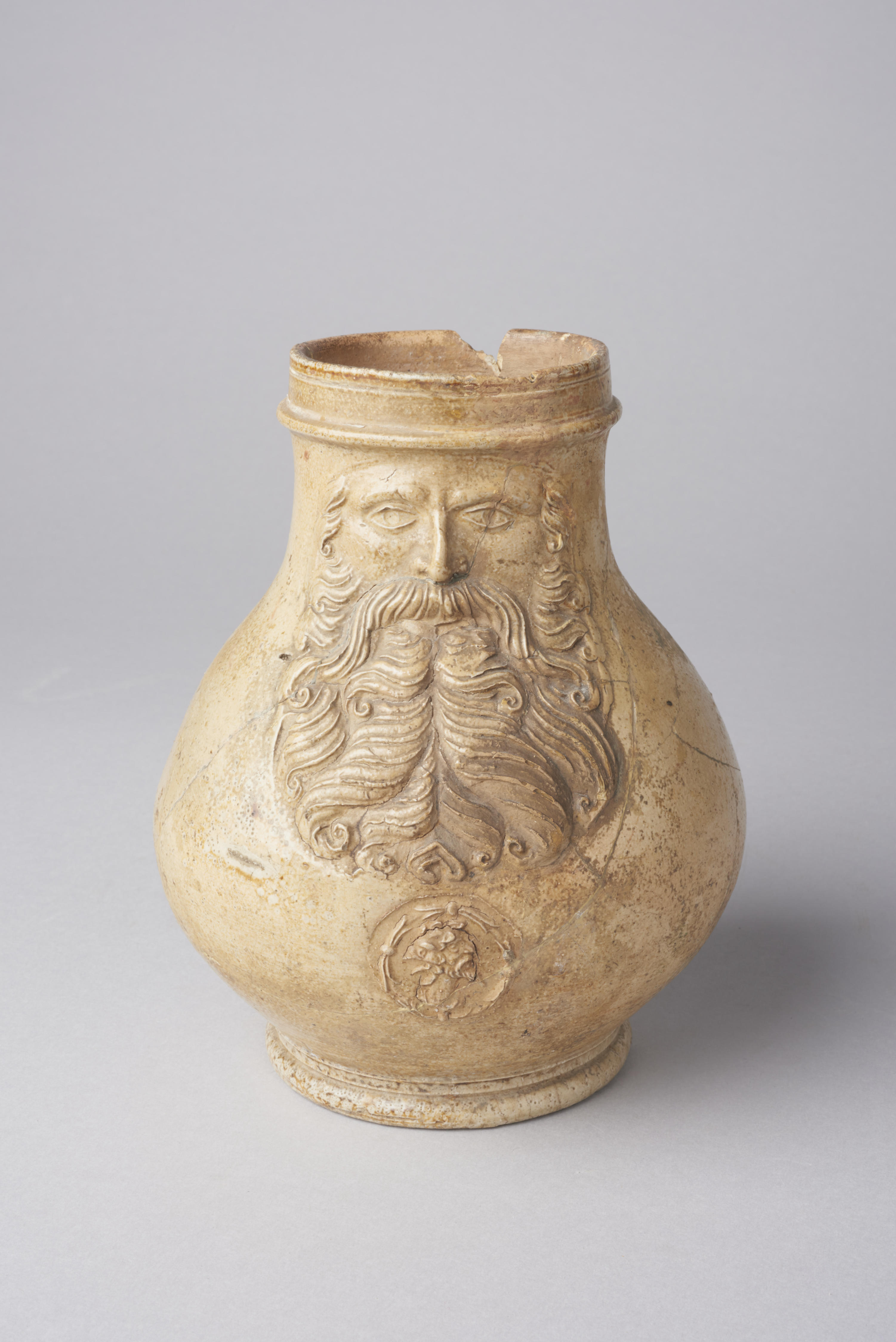 Vroege baardmankruik met renaissance-medaillon uit Frechen of Keulen. Een vrijwel identieke kruik, uitgevoerd met een tinnen deksel, staat afgebeeld op de voorgrond van het schilderij 'Interieur met de sater bij de boer (Aesopus)' door Willem van Herp I uit 1650-1677. De kan is in Deventer tijdens opgravingen gevonden.