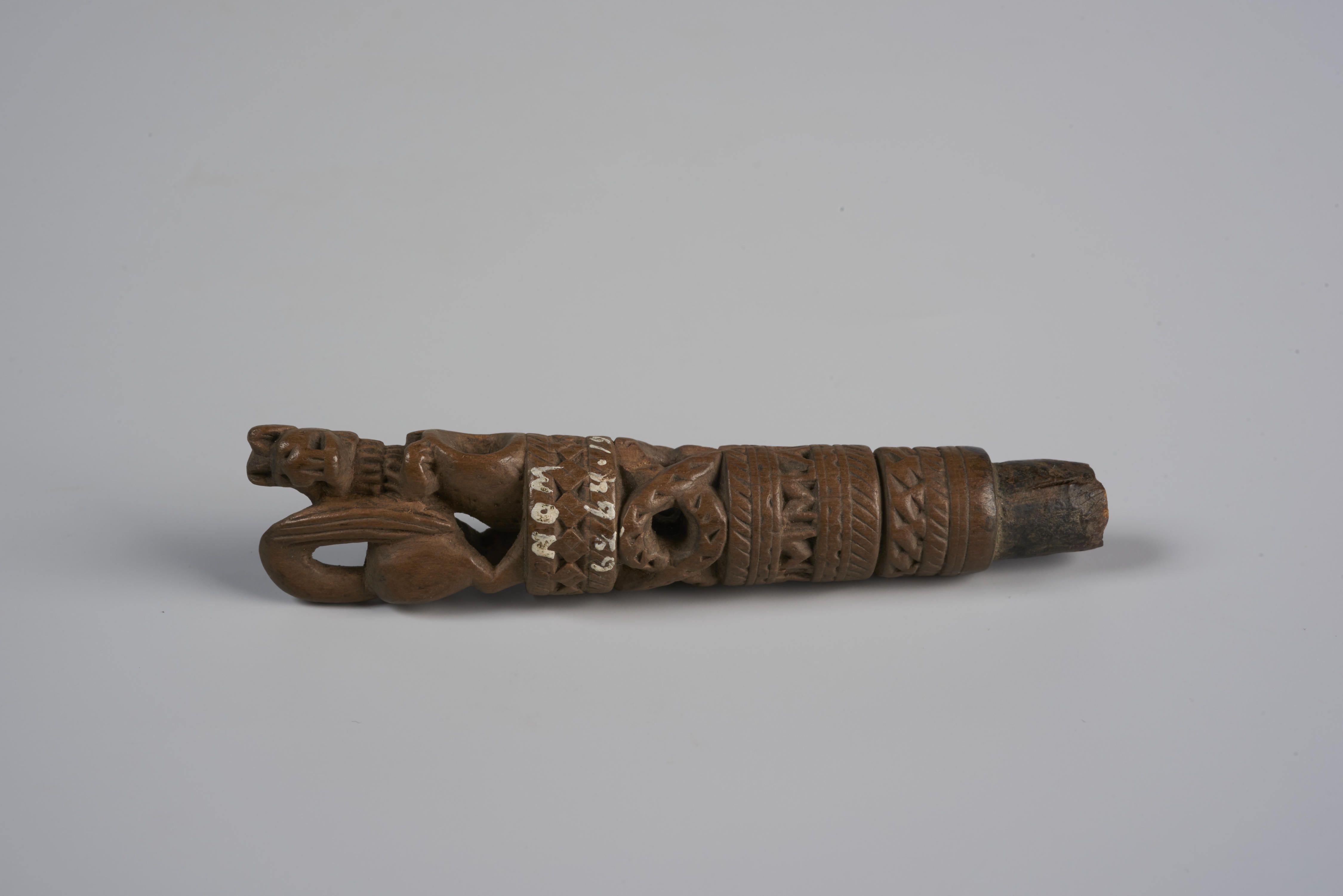 Palmhouten mesheft, besneden met de tekst: 'MM ANNO 1877'. Het heft is bekroond met een leeuw.