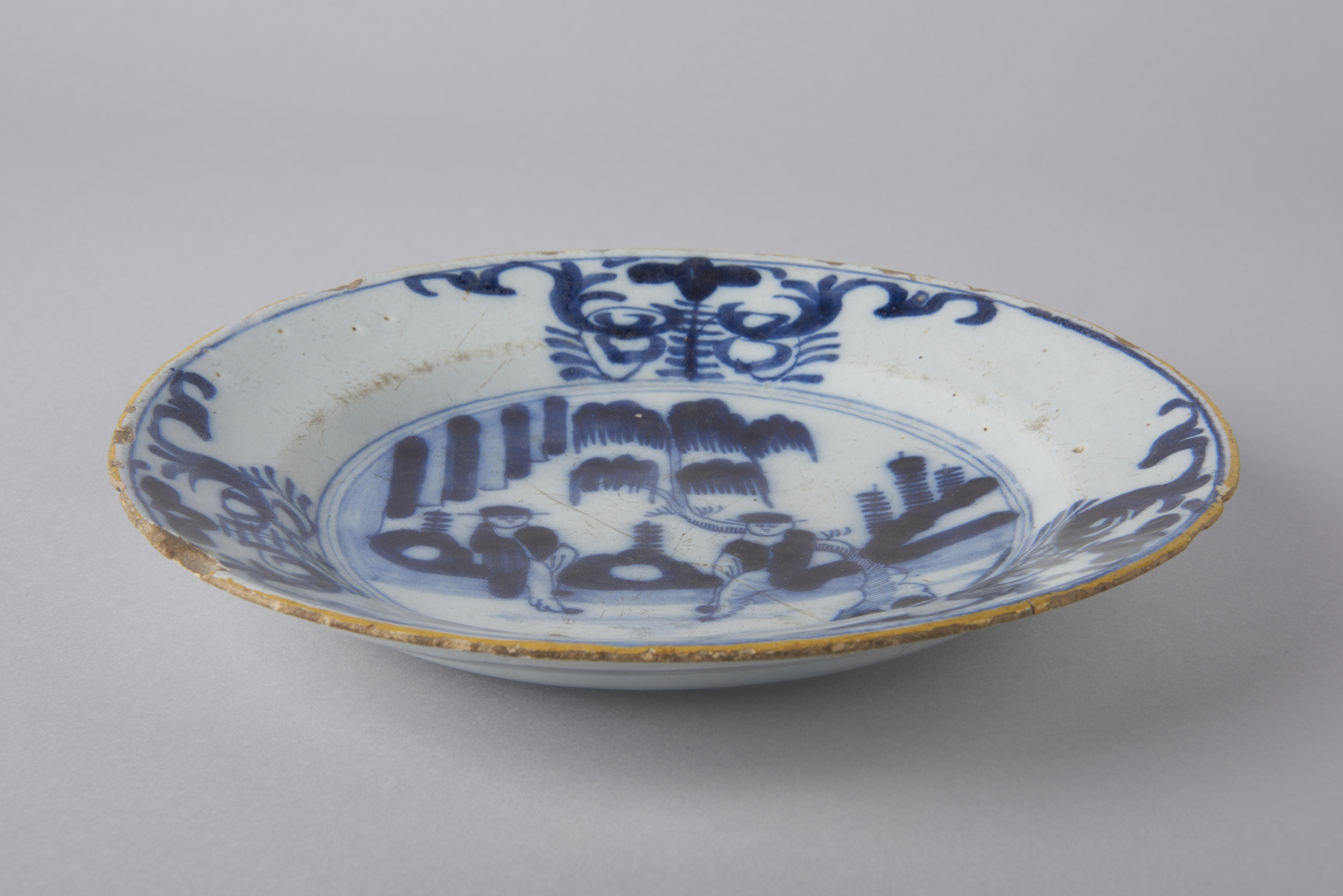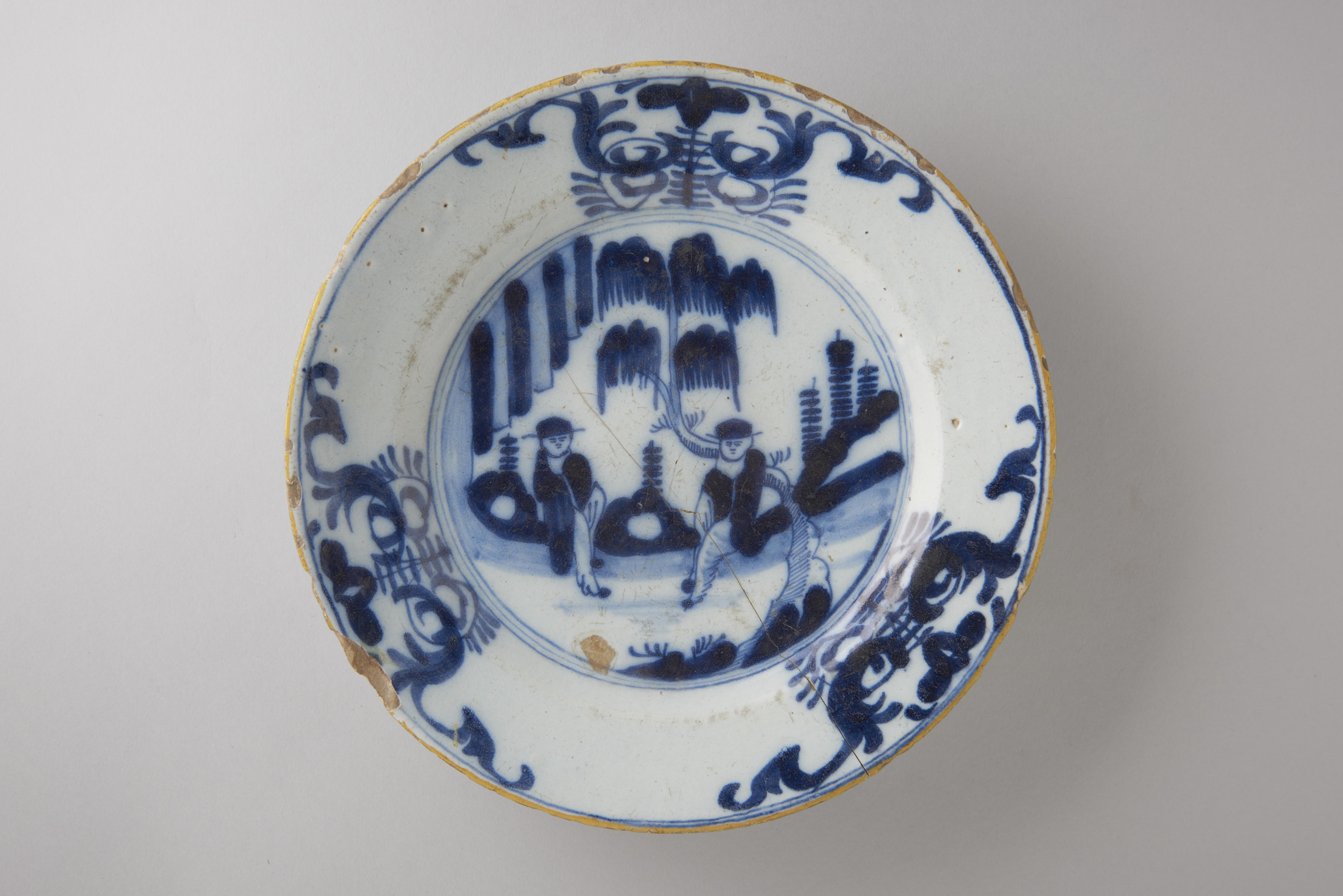Schotel met een randversiering van gestileerde bloem- en bladmotieven en op het middenvlak een voorstelling van twee mannen in een landschap.