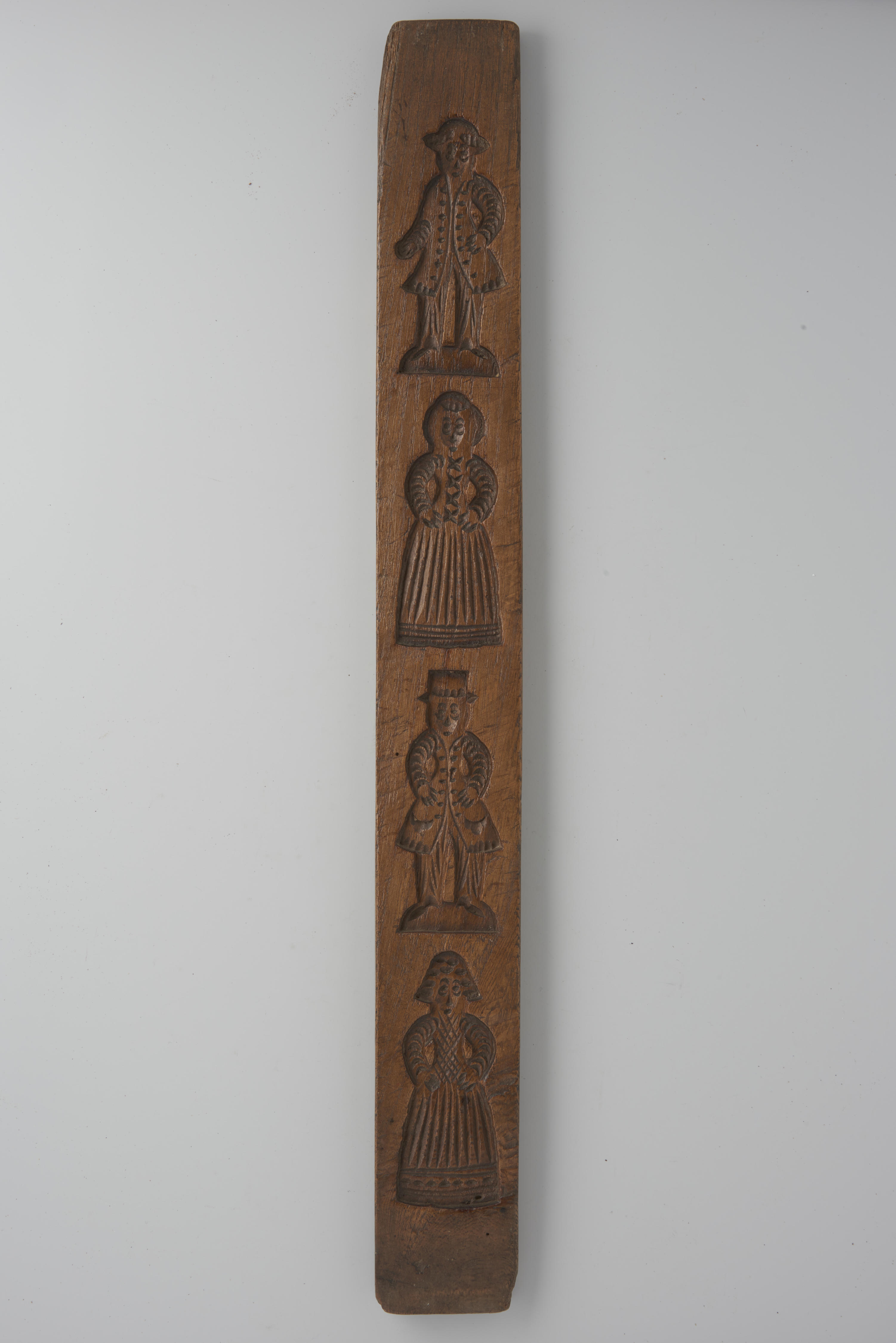 Essenhouten koekplank, aan één zijde besneden met twee mans- en twee vrouwenfiguren.
