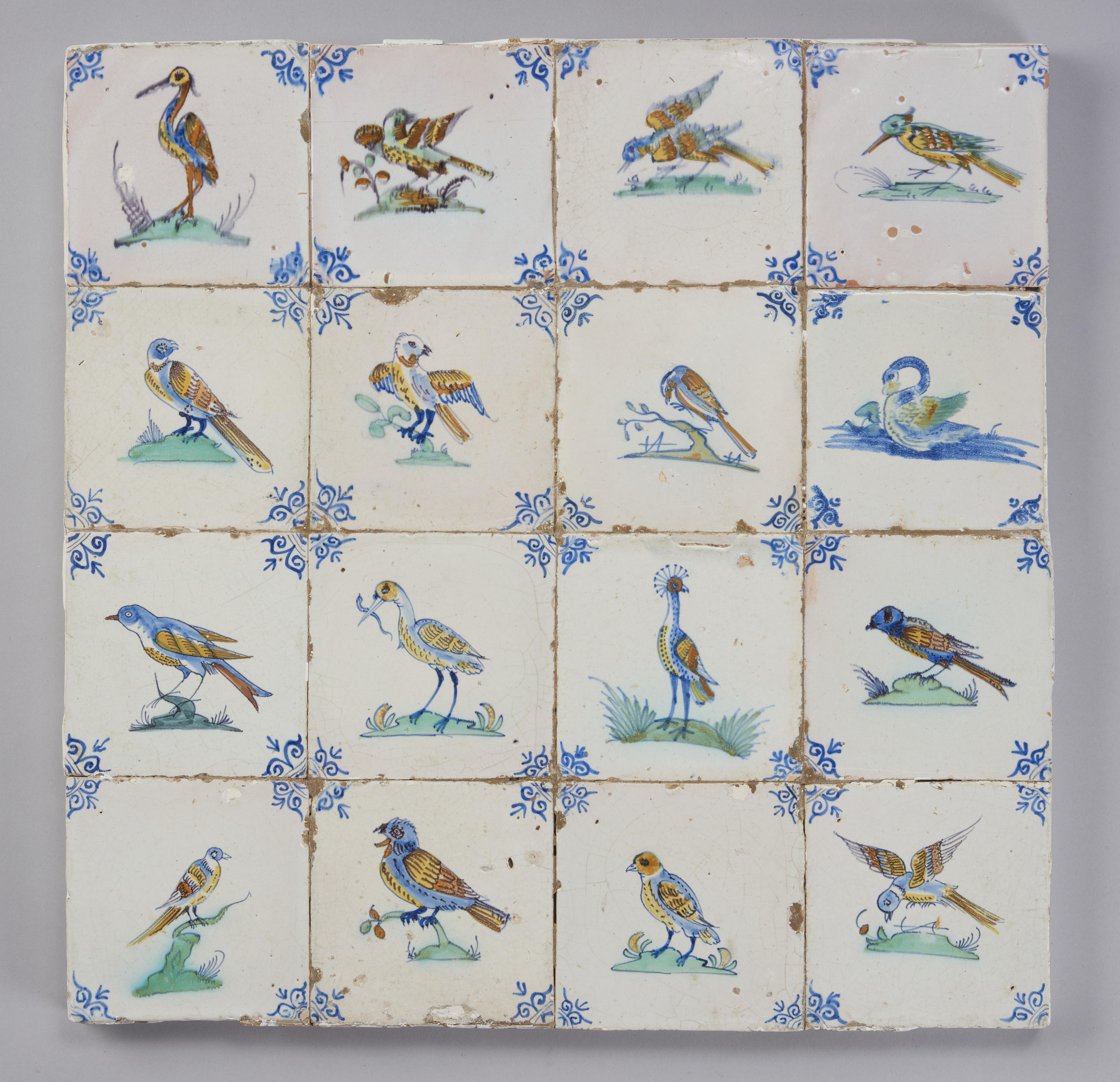 Veld van zestien wandtegels met een afbeelding van een vogel op een grondje of takje; veelkleurig; hoekmotief: ossenkop.