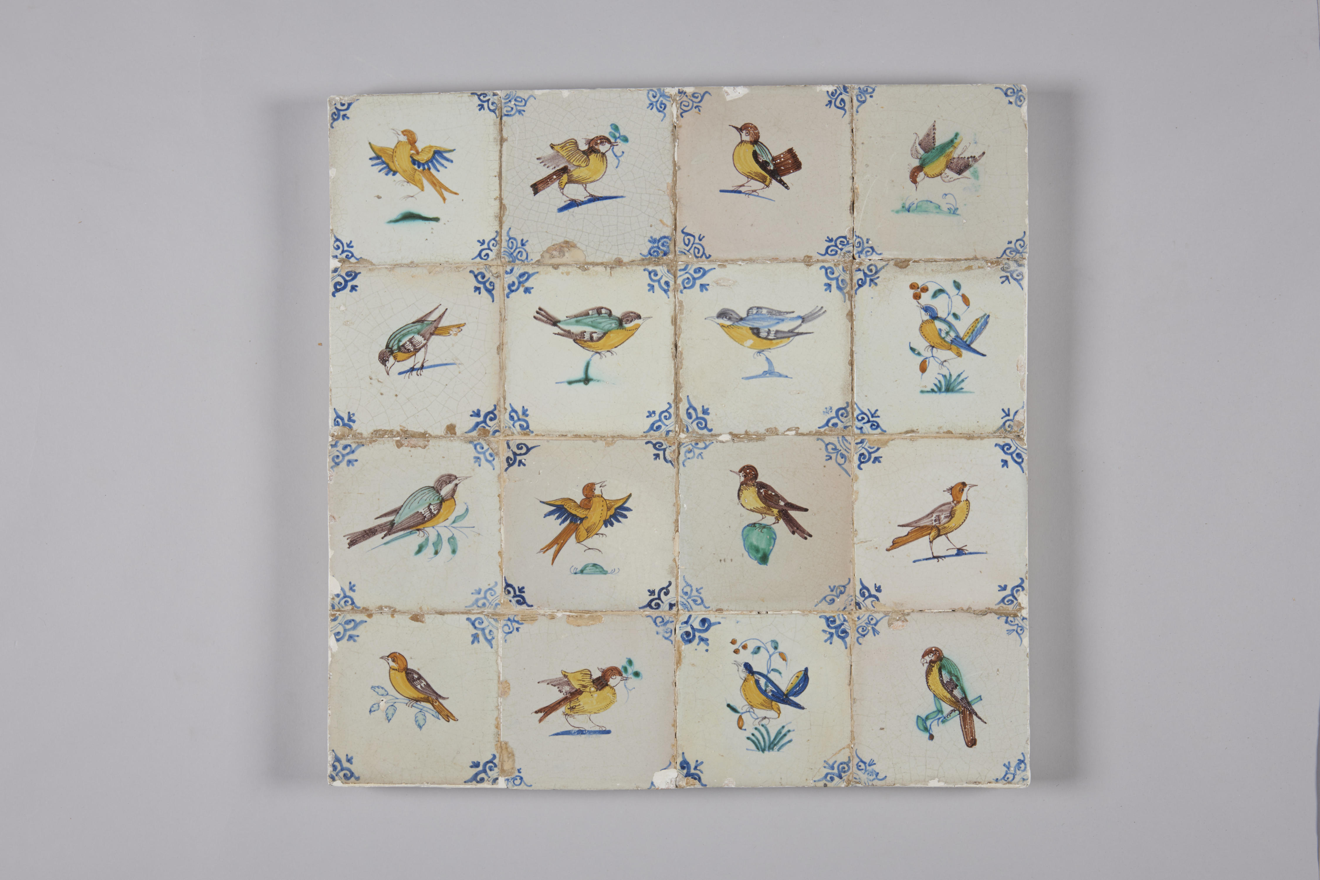 Veld van zestien wandtegels met een afbeelding van een vogel op een grondje of takje; veelkleurig; hoekmotief: ossenkop.