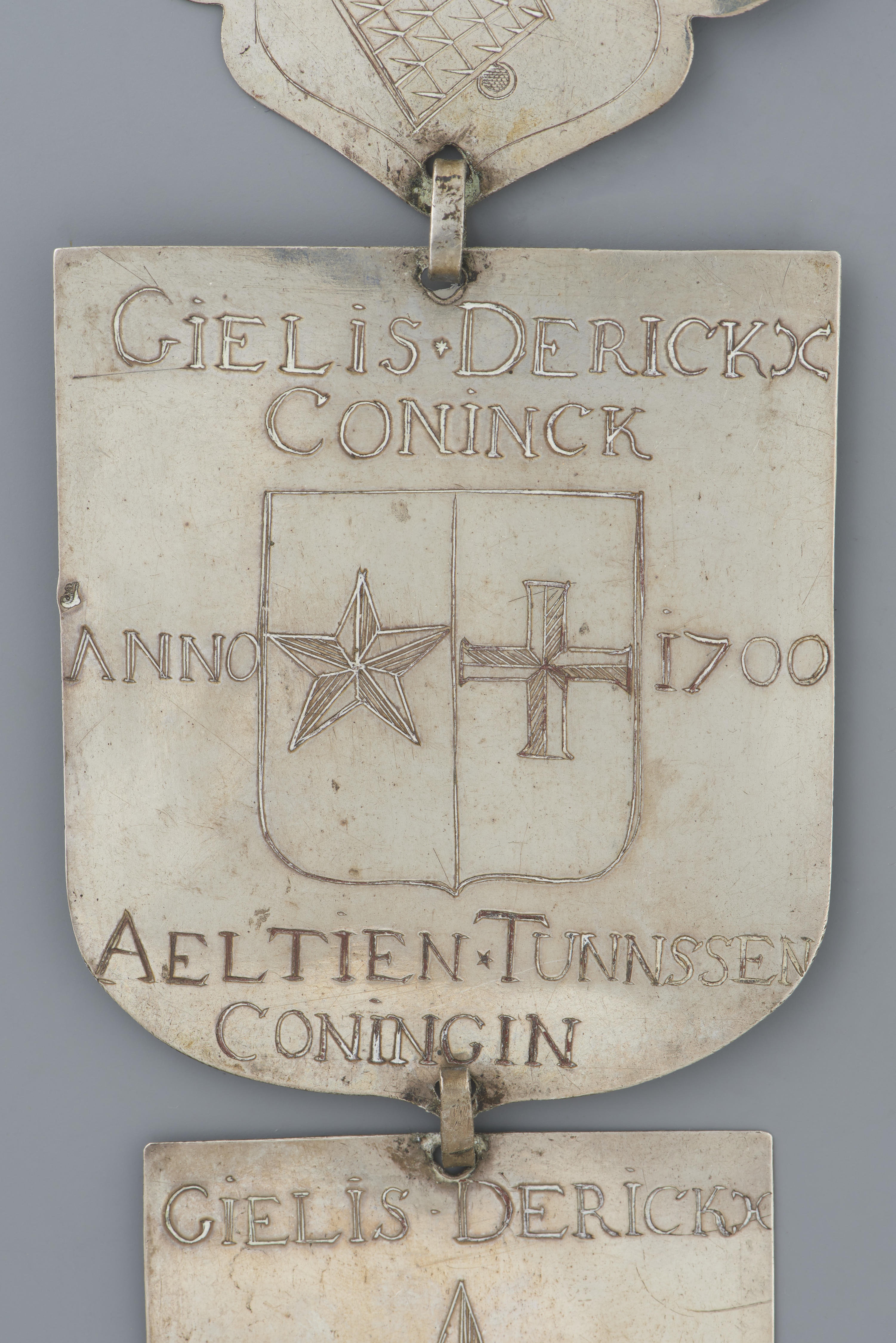 Zilveren koningsplaat. In het midden van het schild is een klein schildje gegraveerd met een vijfpuntige ster en een kruis. Boven, aan weerszijden en onder deze voorstelling is de volgende inscriptie te lezen: 'GIELIS DERICKX CONINCK ANNO 1700 AELTIEN TUNNSSEN CONINGIN'. De plaat heeft toebehoord aan het Sint Antoniusgilde in Malden.