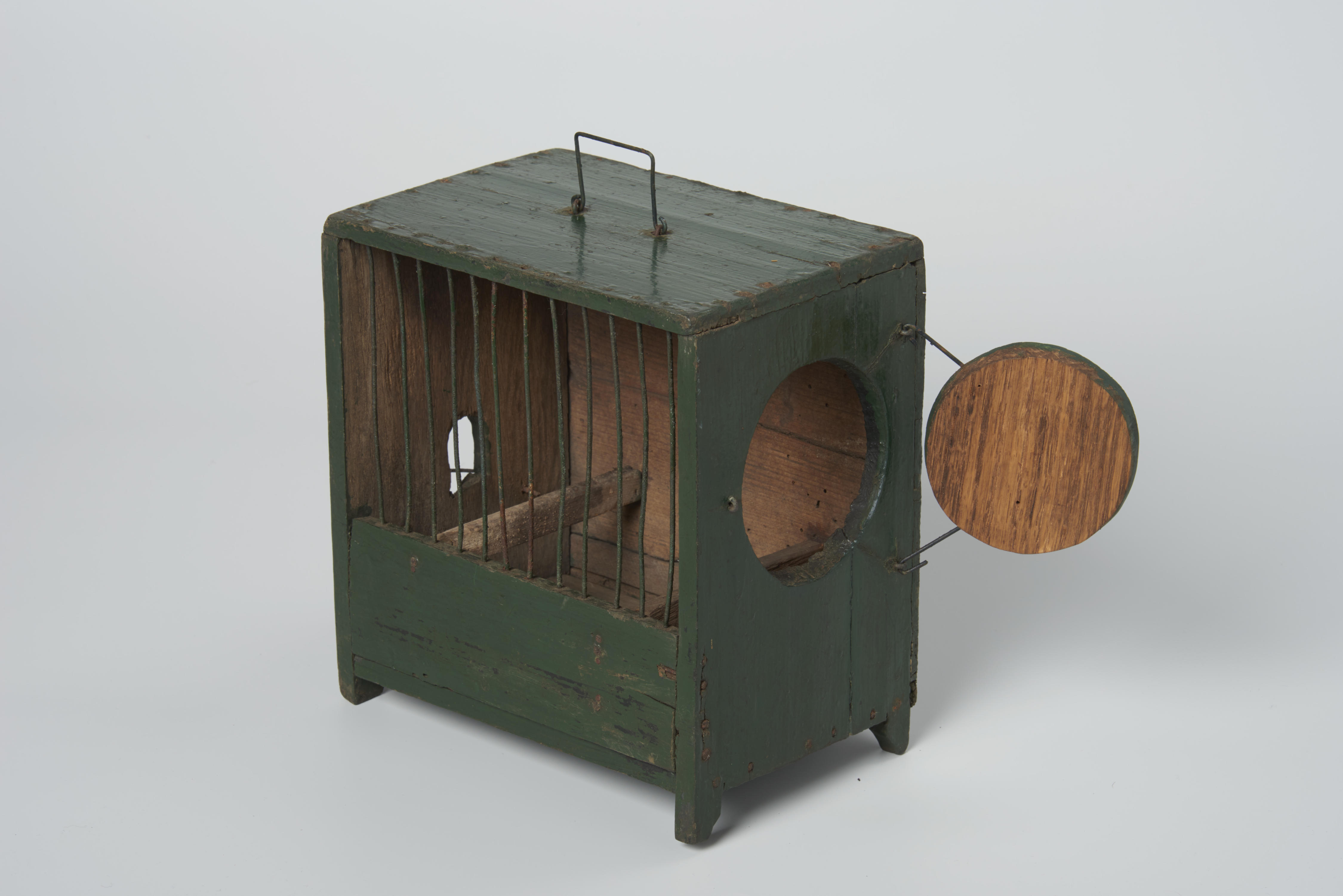 Houten vinkenkooi met ijzeren tralies.