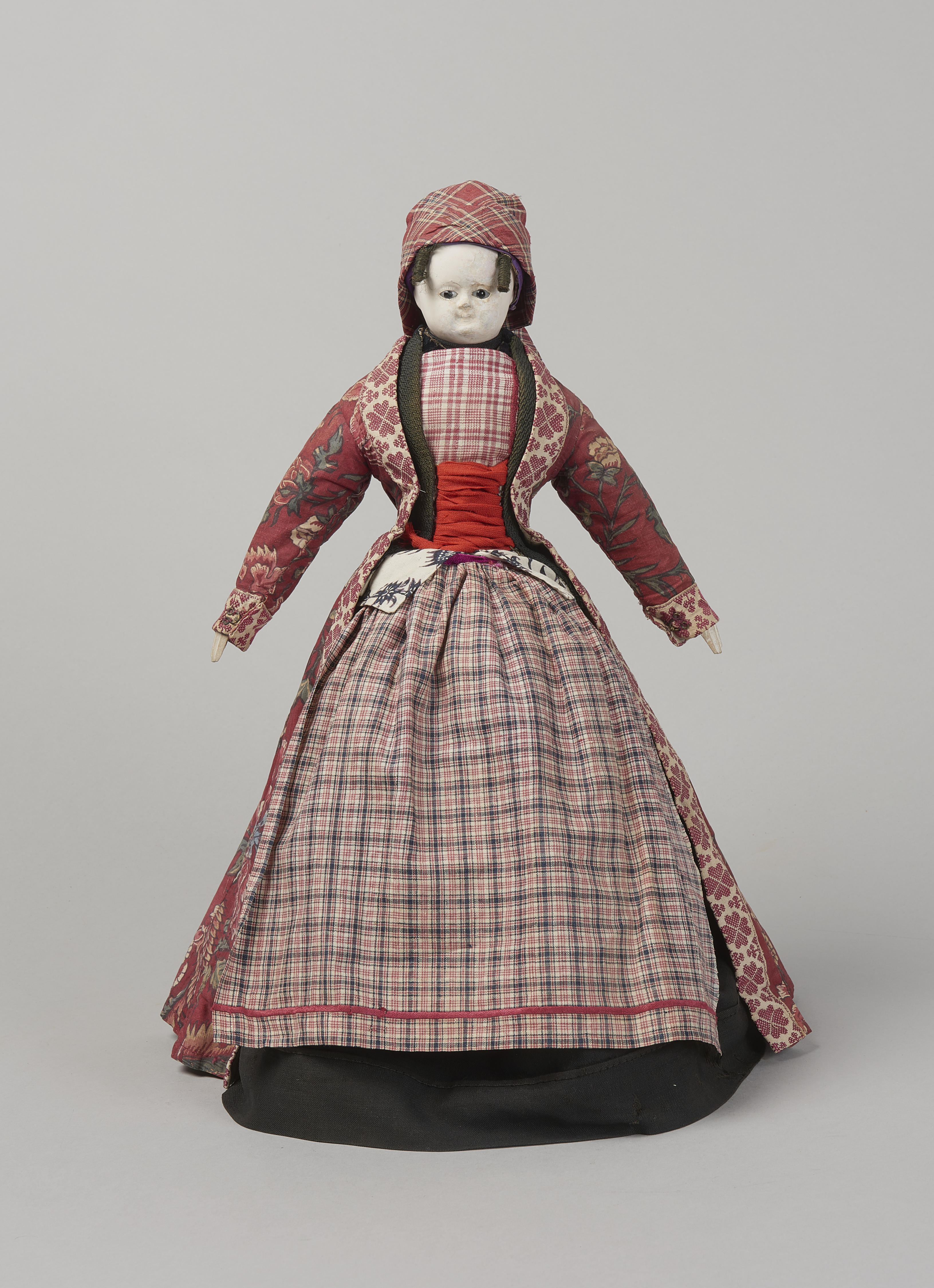 Miniatuurpop, gekleed als ongehuwde vrouw uit Hindeloopen in zondagse of gelegenheidskleding met wentke of winke.