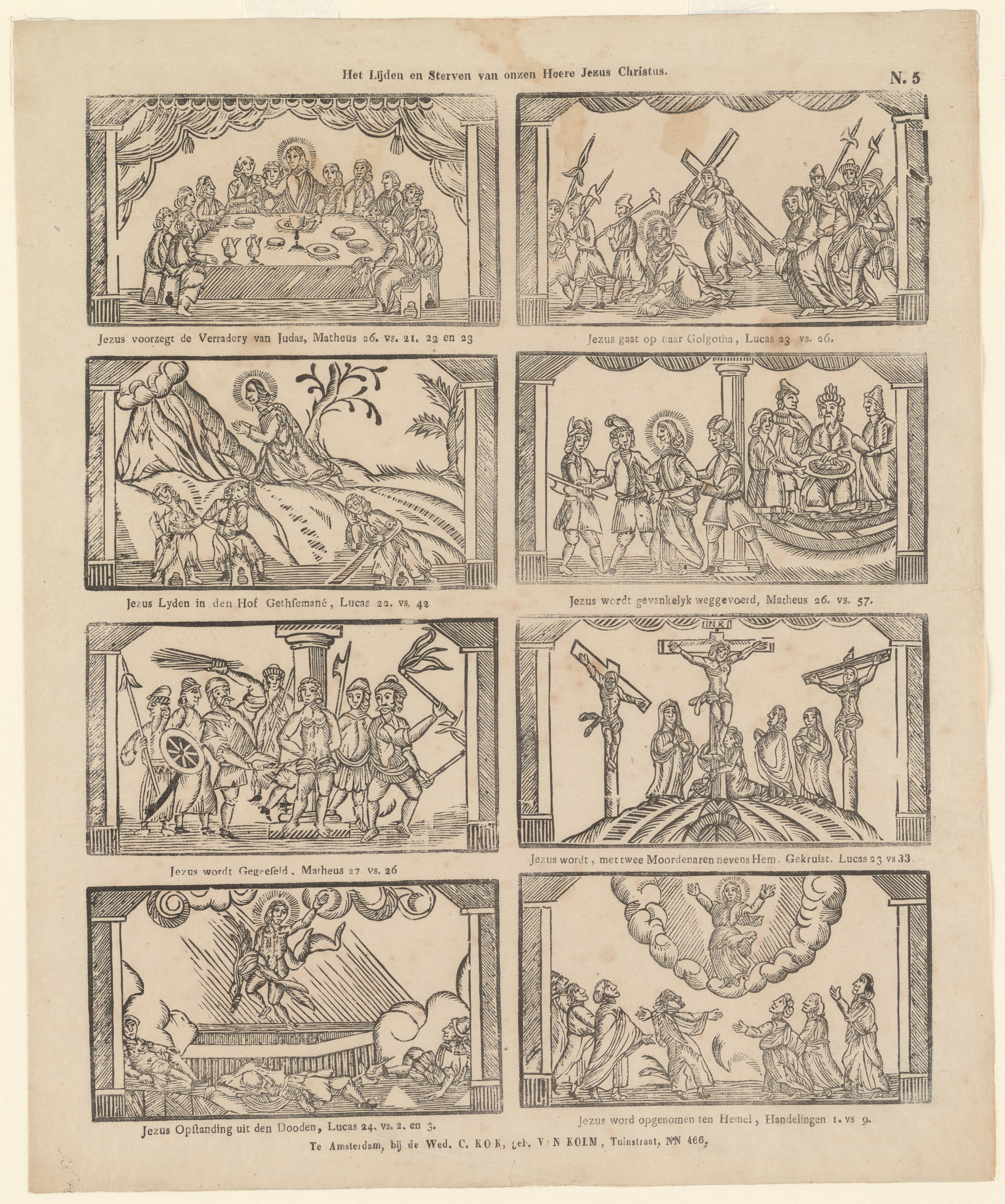 Prent met acht afbeeldingen van de passie van Jezus, gedrukt met afzonderlijke houtsneden. Onder elke afbeelding staat een onderschrift, gedrukt in boekdruk.