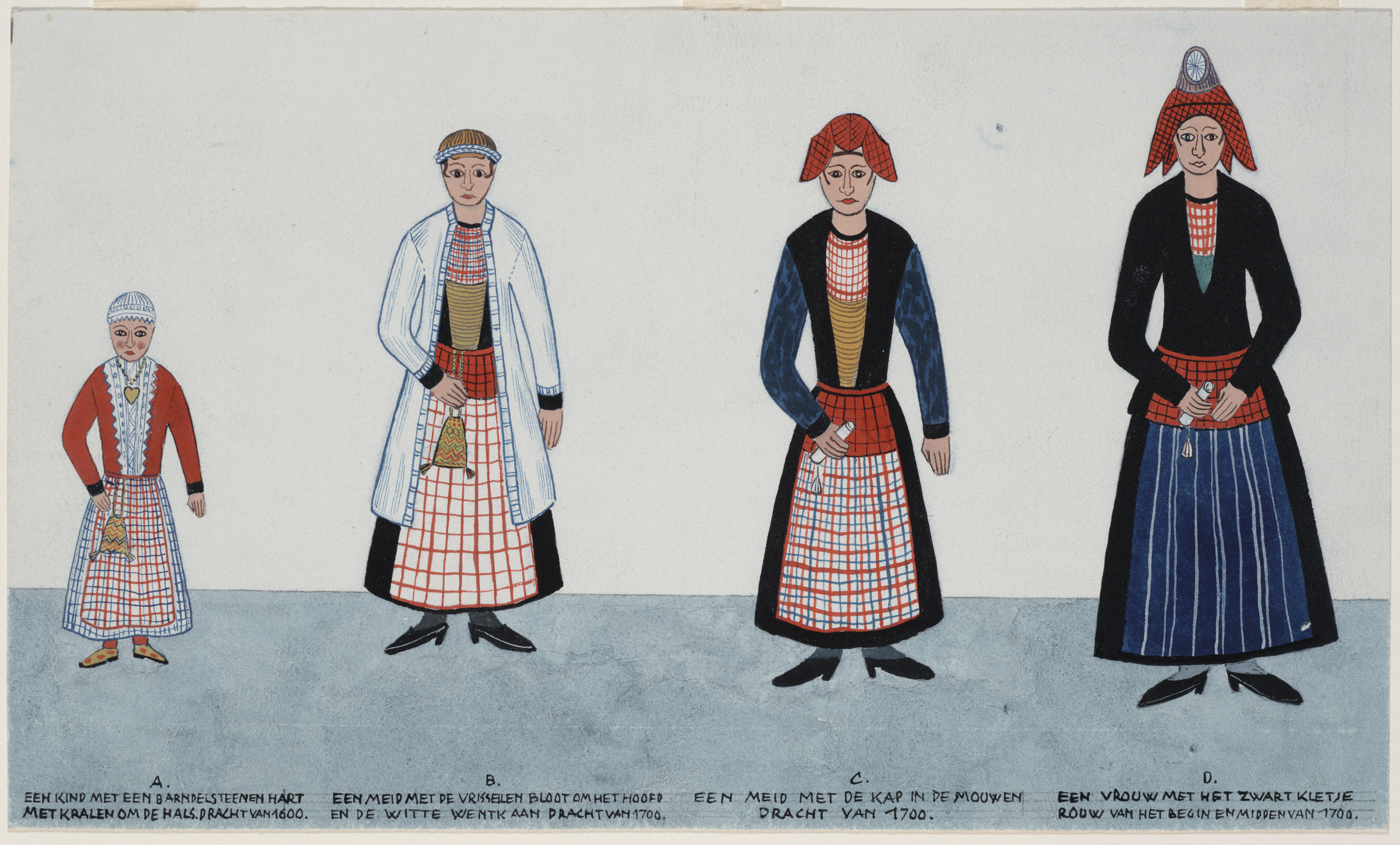 In 1950 kreeg Nicolaas Huppes, hoofdrestaurator van het Rijksmuseum in Amsterdam, de opdracht van het Nederlands Openluchtmuseum om 21 Friese miniaturen te kopiëren. Deze tekening laat de ontwikkeling in de Hindelooper dracht zien. De kopie is naar werk van de Hindelooper schilder Hendrik Lap (1824-1874).