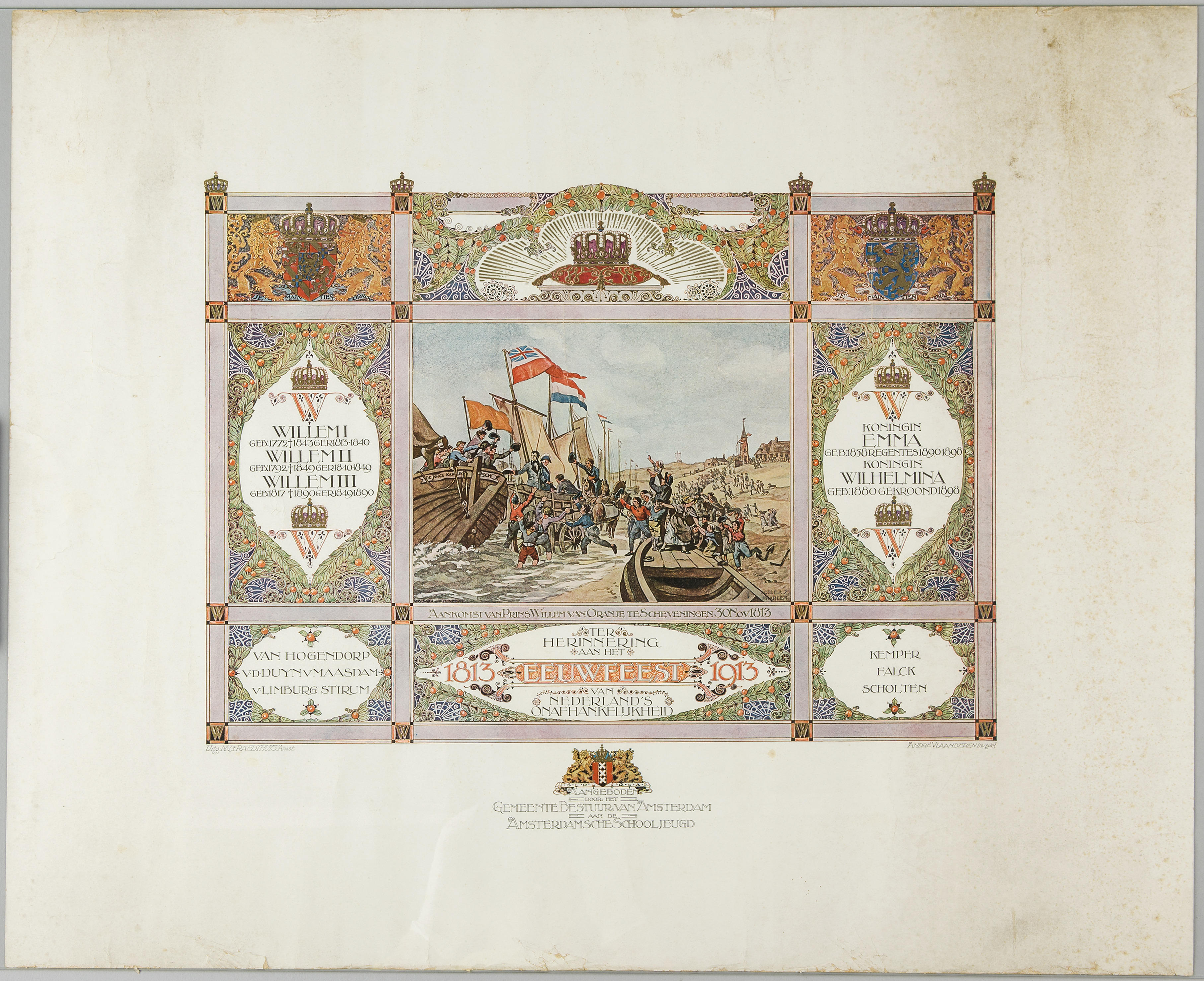 Deze prent is gemaakt in 1913 ter herinnering aan het eeuwfeest van de Nederlandse onafhankelijkheid. Precies honderd jaar eerder kwam erfprins Willem I (1772-1843) in Scheveningen aan. De middenafbeelding 'Aankomst van Prins Willem van Oranje te Scheveningen 30 nov. 1813' is vrij naar een tekening van J.W. Pieneman (1779-1853).