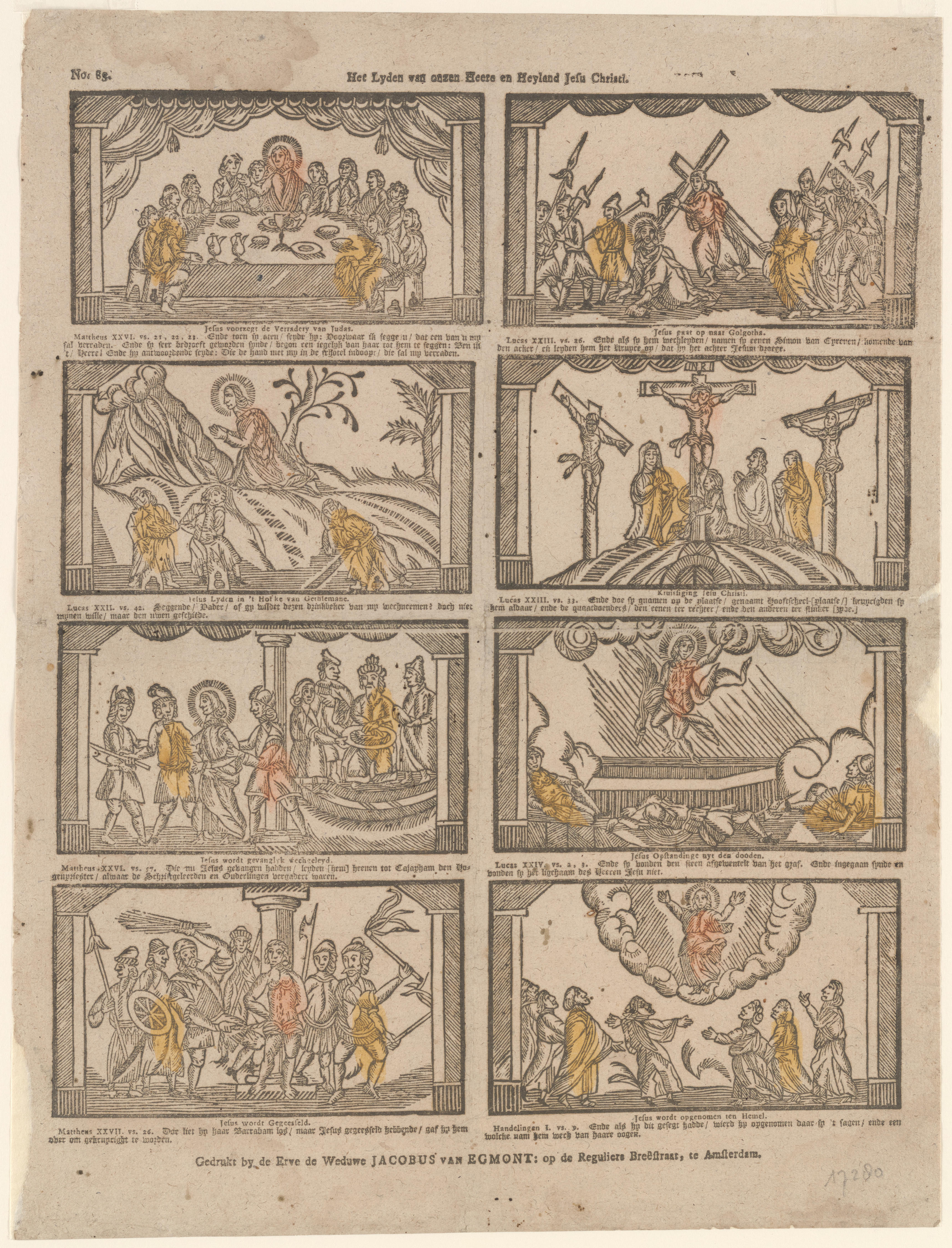 Prent met acht voorstellingen uit het Nieuwe Testament van Jezus, onder meer uit de passie en de hemelvaart. De afbeeldingen zijn gedrukt met afzonderlijke houtsneden. Onder iedere afbeelding staat een onderschrift met daarin onder meer een verwijzing naar het Bijbelvers.