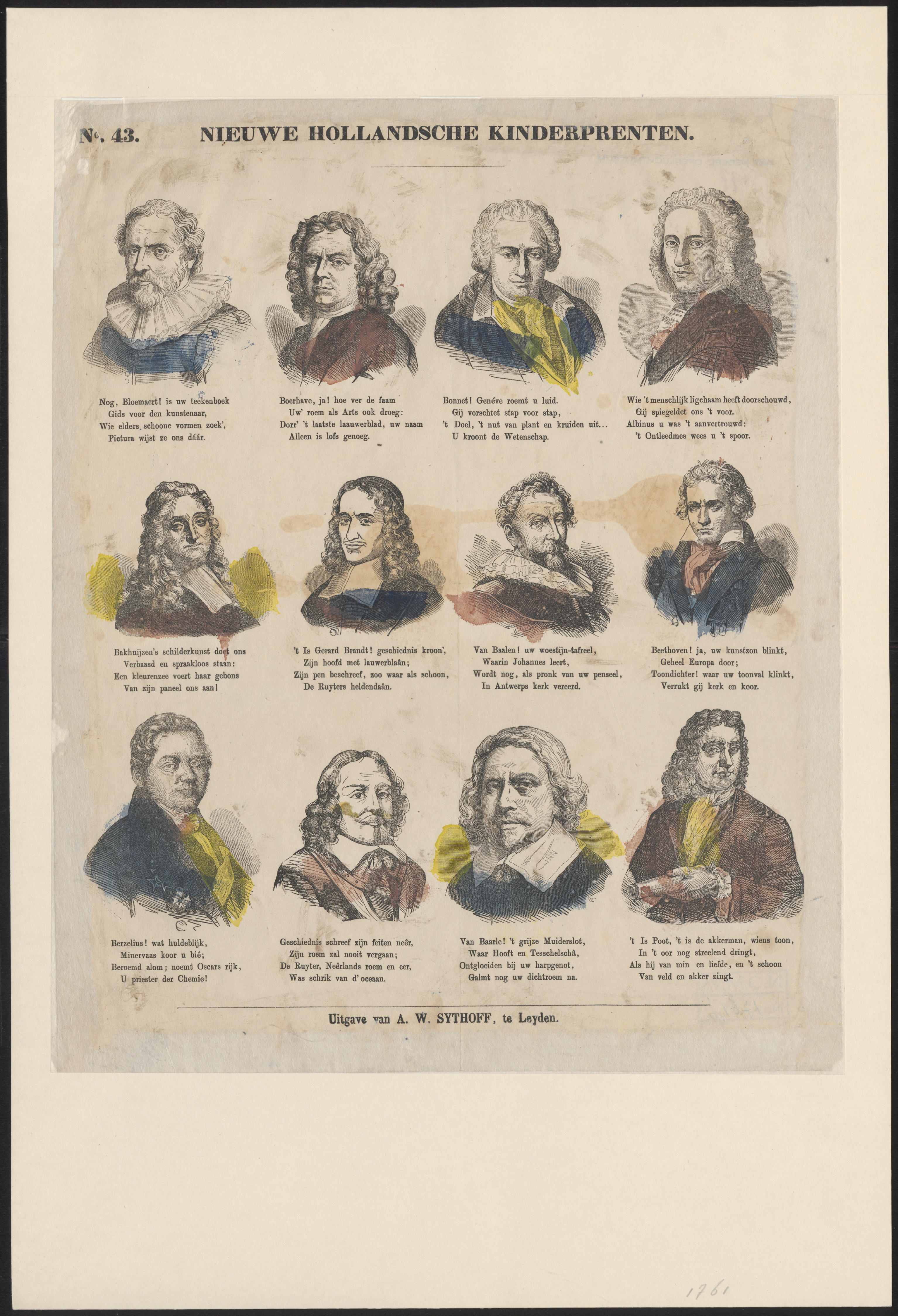 Prent met twaalf portretten van beroemde mannen, gedrukt met afzonderlijke houtgravures en ingekleurd met rood, geel en blauw. Onder iedere afbeelding staat een onderschrift, gedrukt in boekdruk.