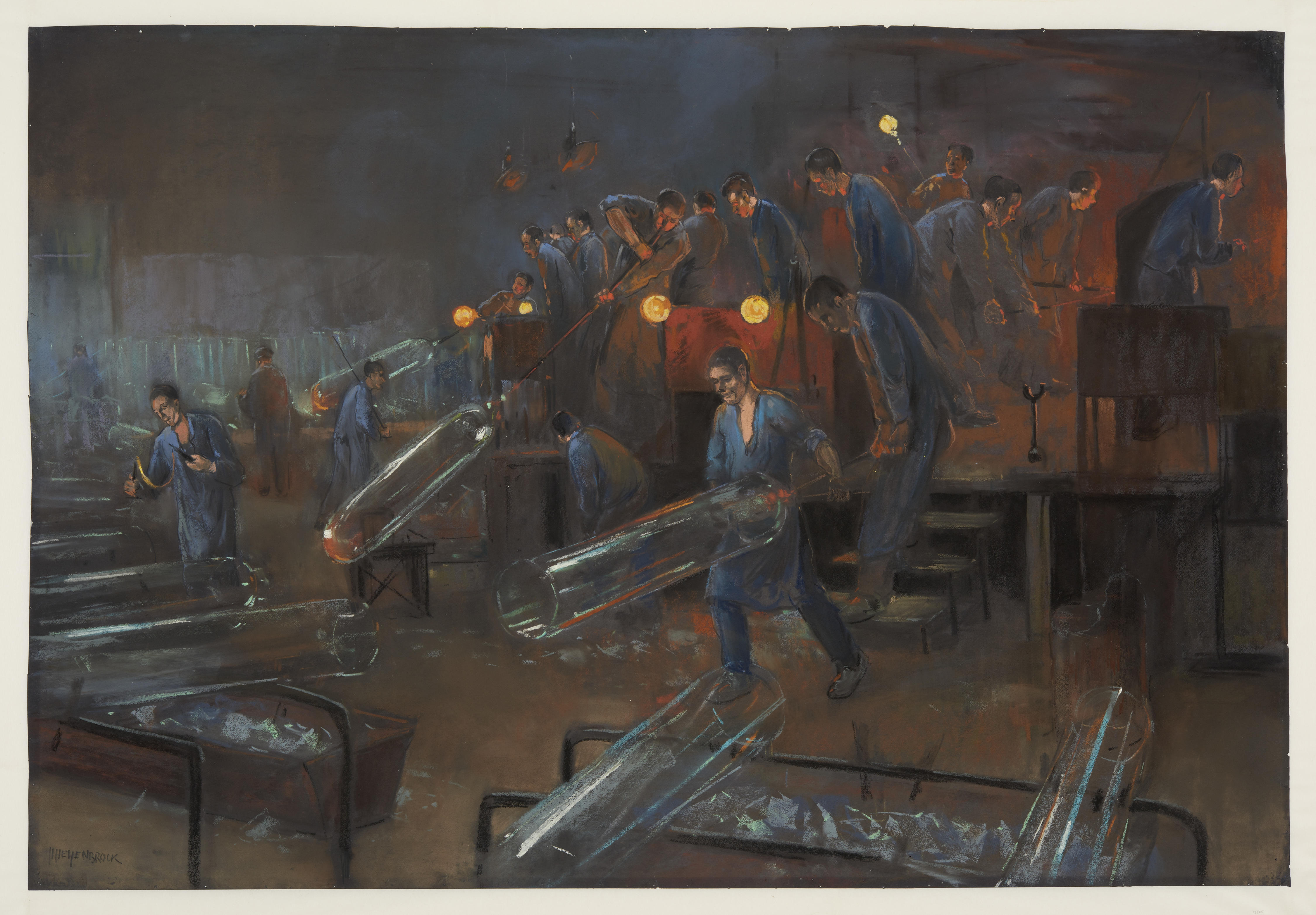 Dit werk is de laatste in een reeks die het proces van het vensterglas maken laat zien. Het geeft een totaaloverzicht van alle handelingen die plaatsvinden om vensterglas te maken. Nadat glas in de oven is verhit, wordt een bol geblazen. Dit is rechtsboven op de tekening te zien. Daarna wordt deze bol uitgerekt tot ...