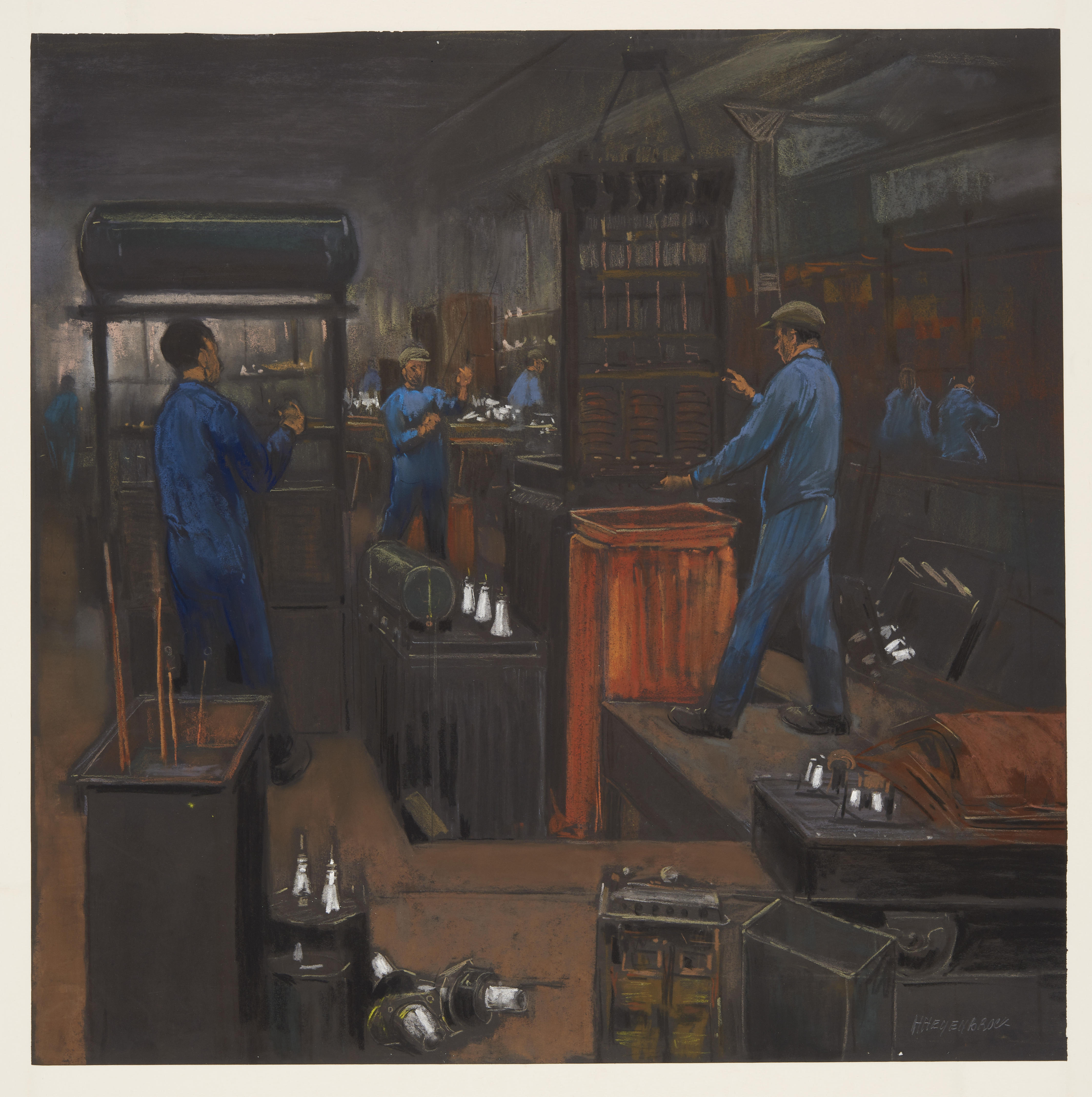 Pastel van het interieur van een transformatorenfabriek, mogelijk Smit en Co's Transformatorenfabriek N.V. in Nijmegen. De arbeiders zijn bezig met de assemblage van transformatoren, zoals het plaatsen van een transformator in zijn behuizing. Op de voorgrond ligt keramische isolatie. Op de achterzijde van de pastel staat geschreven: 'maken van isolatiemateriaal'. Dit opschrift lijkt onjuist.