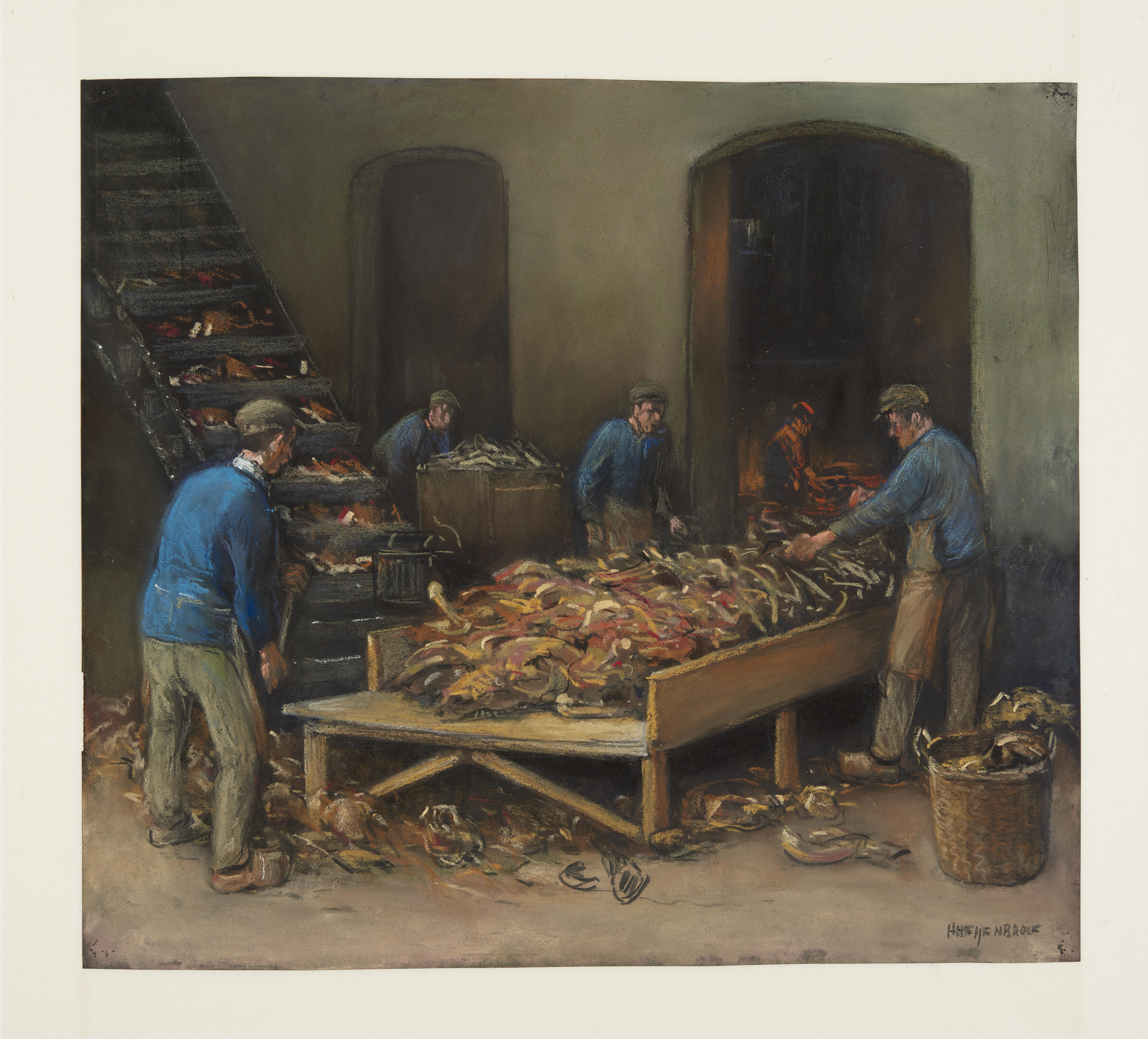 Pastel van het interieur van een lijmfabriek. Arbeiders zijn bezig met het sorteren van beenderen aan een sorteertafel. Links staat een kettingelevator.