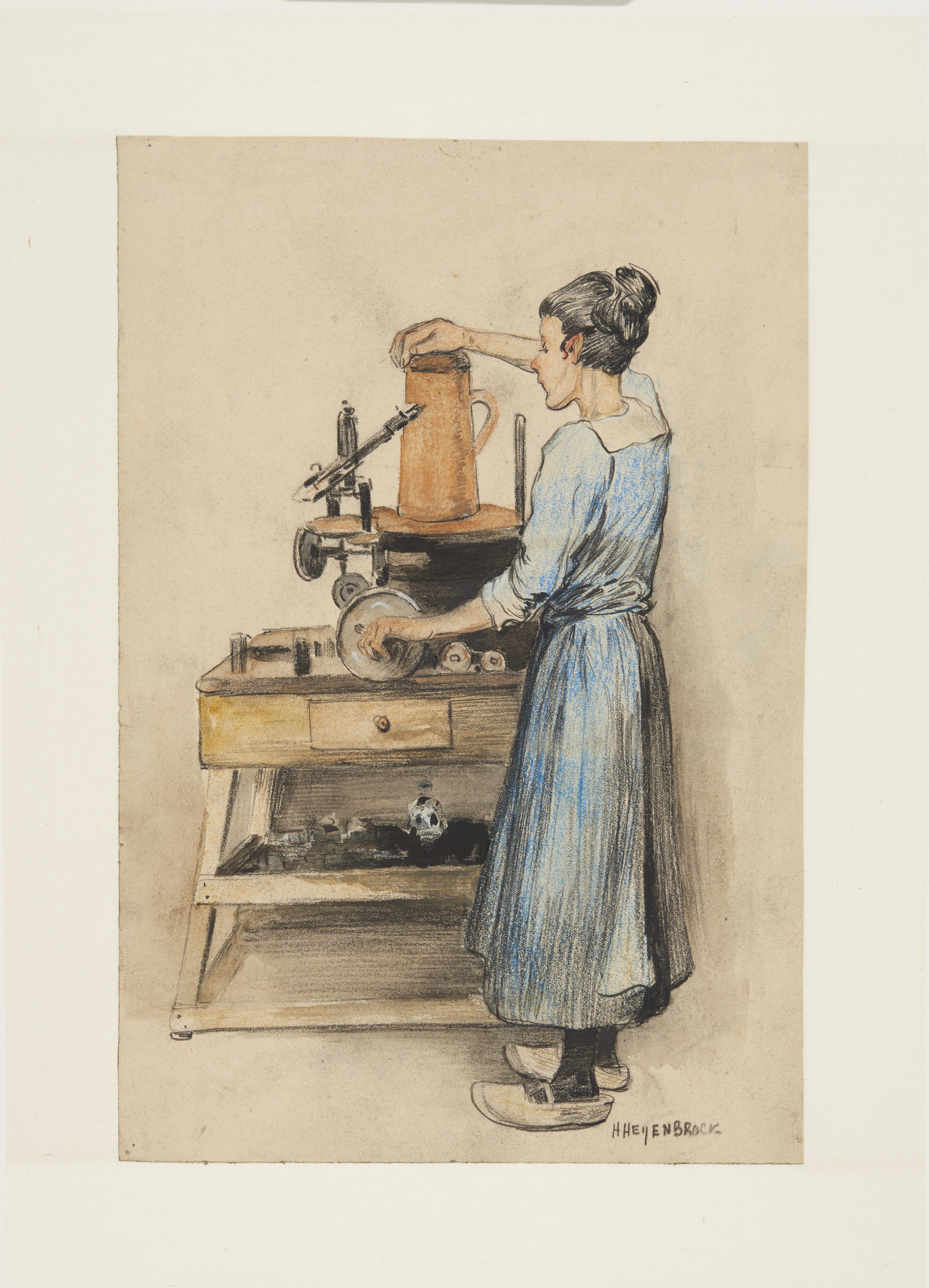 Pastel van een vrouw aan een graveermachine, bezig met het graveren van glas.