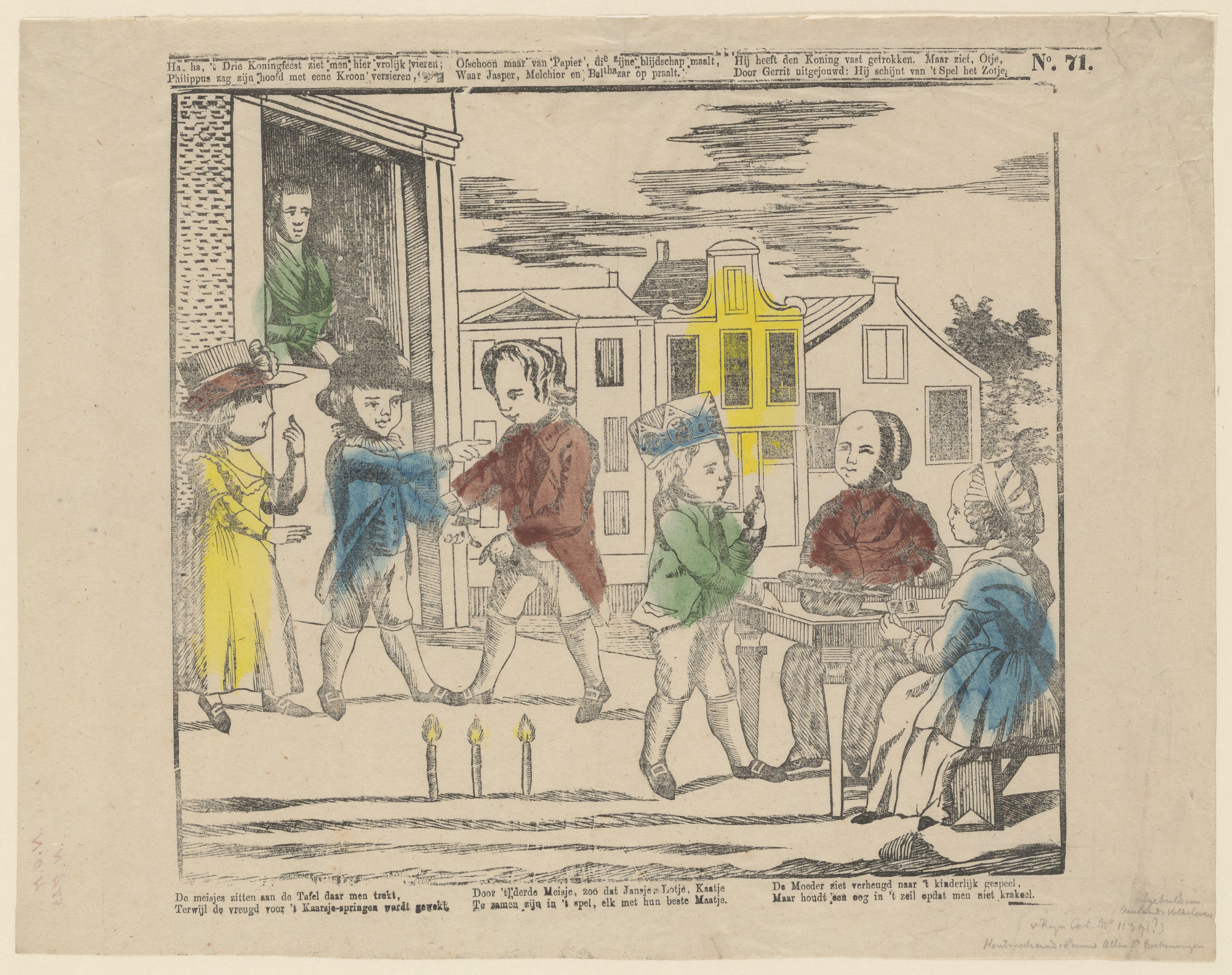 Prent met een grote voorstelling van zes kinderen die het spel koningtrekken spelen op het Driekoningenfeest. Een vrouw kijkt vanuit een deuropening toe. Onder de afbeelding staat een zesregelig vers in drie kolommen.