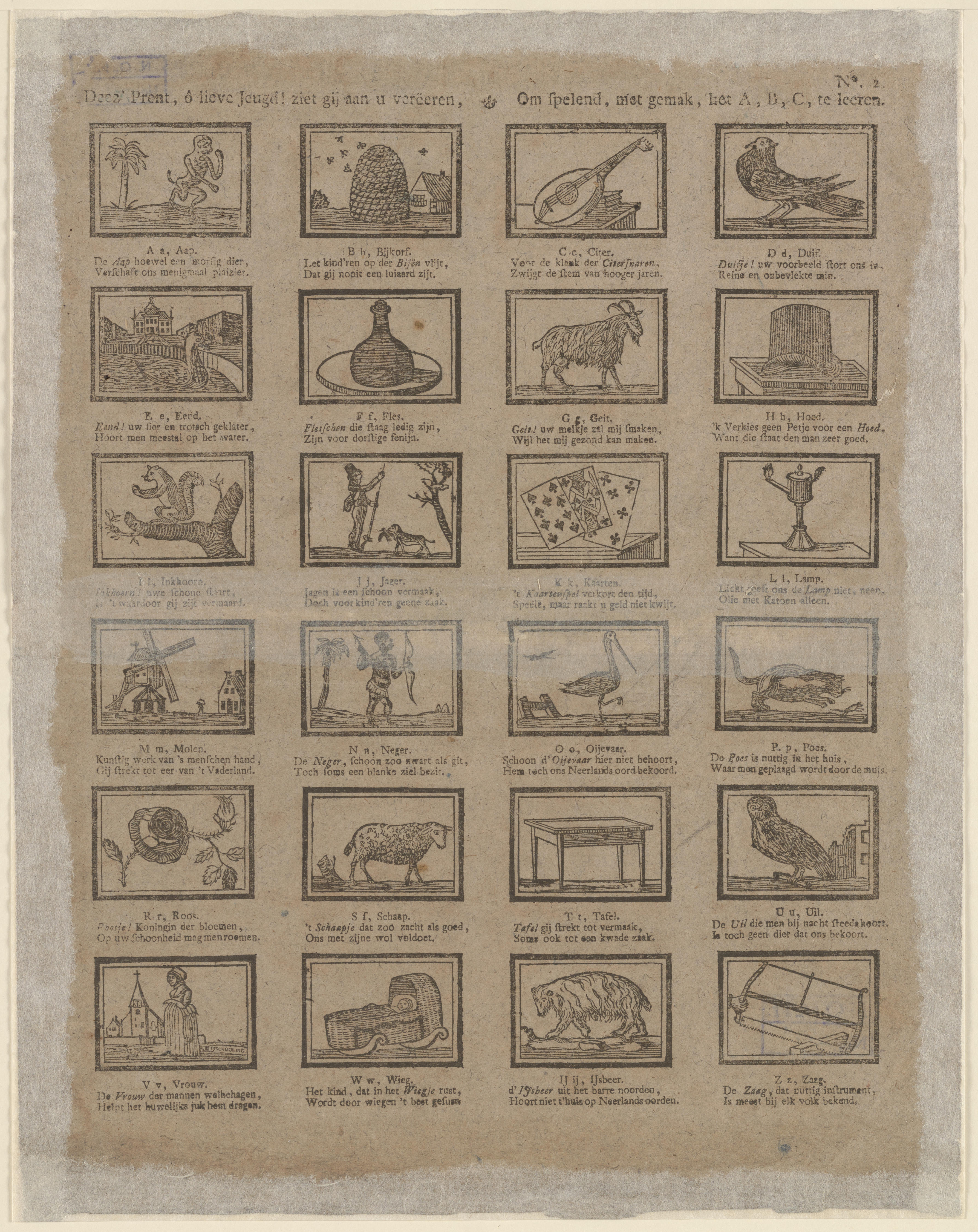 Prent met 24 voorstellingen van voorwerpen, mensen en dieren, die elk een letter uit het alfabet verbeelden. De letters Q en X ontbreken. De prent is gedrukt met houtsneden. Elke afbeelding heeft een tweeregelig onderschrift. Op de prent staat geen uitgever vermeld. Hij is toegeschreven aan de Rotterdamse uitgever T.C. Hoffers. De drukblokken zijn gegraveerd ...