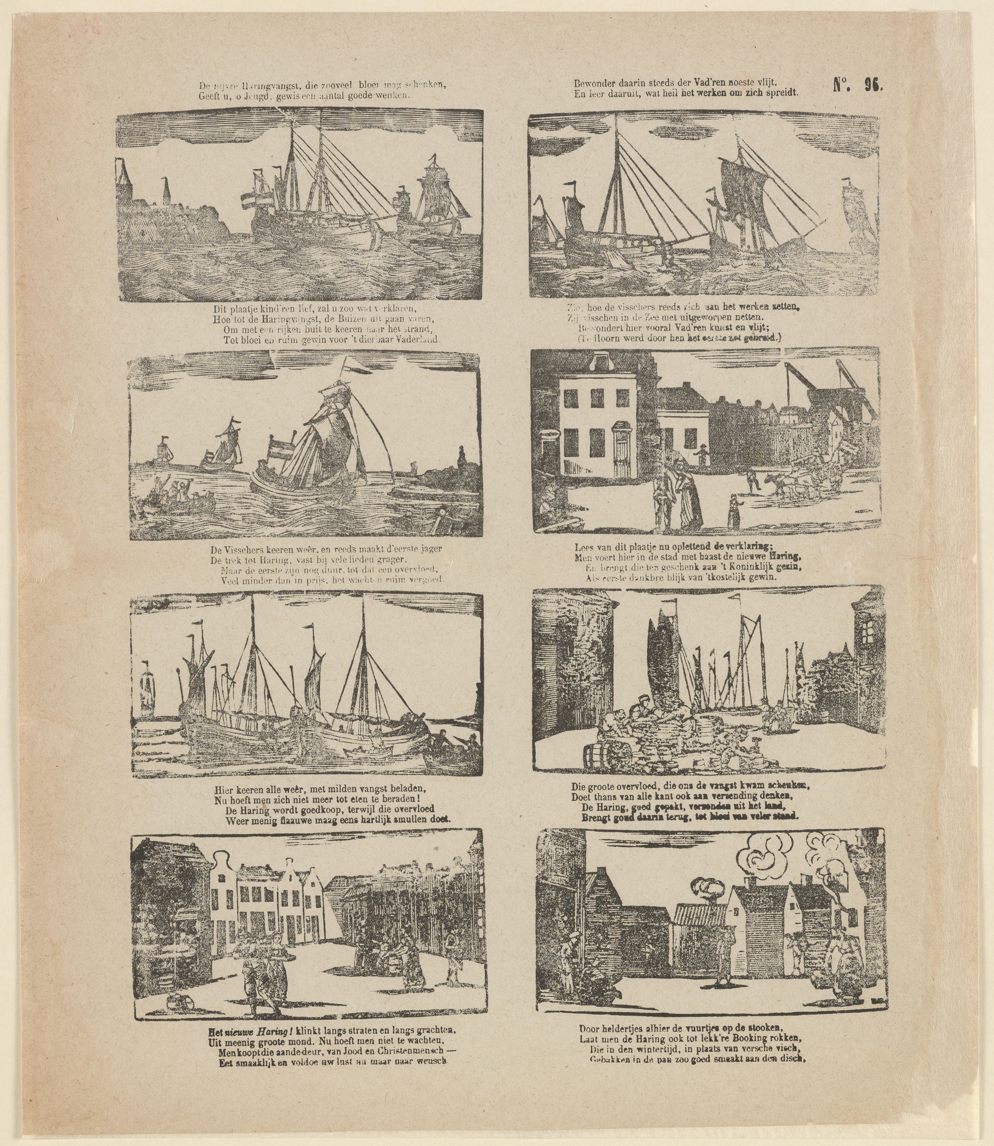 De nijvre Haringvangst, die zooveel bloei mag schenken, / Geeft u, o Jeugd, gewis een aantal goede wenken, // Bewonder daarin steeds der Vad'ren noeste vlijt, / En leer daaruit, wat heil het werken om zich spreidt. - No. 96
