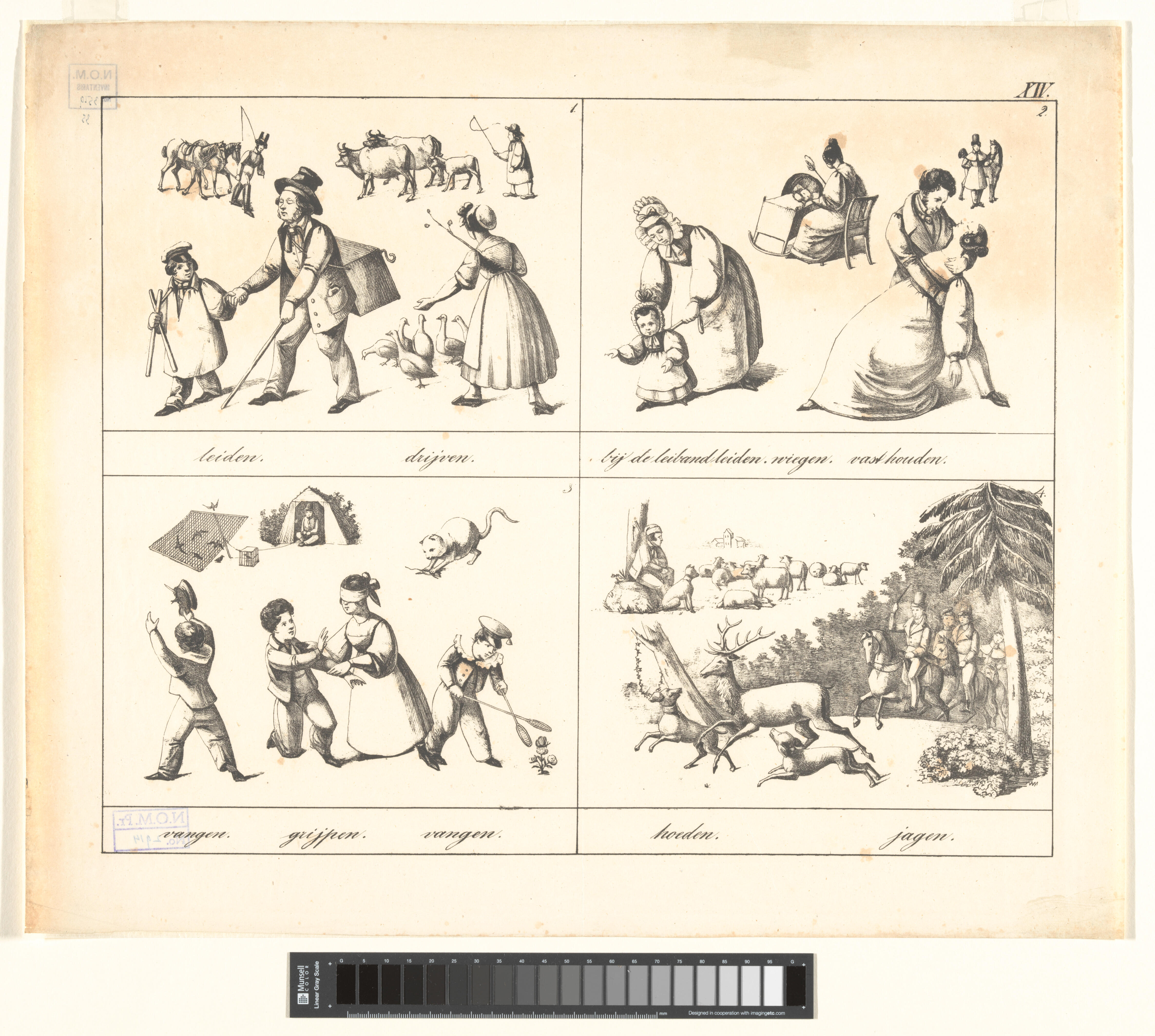 Oblong onderwijsprent, gedrukt in lithografie. De prent is in 1844 uitgegeven door de Groninger R.J. Schierbeek Jr. Dit is nummer 14 in een serie van 20 prenten. De serie is in Berlijn ontworpen door de onderwijzer Carl Wilke. De onderwijskundige Berend Brugsma vertaalde de teksten en introduceerde de platen in Nederland. Deze zogenaamde kwartetplaat kon ...