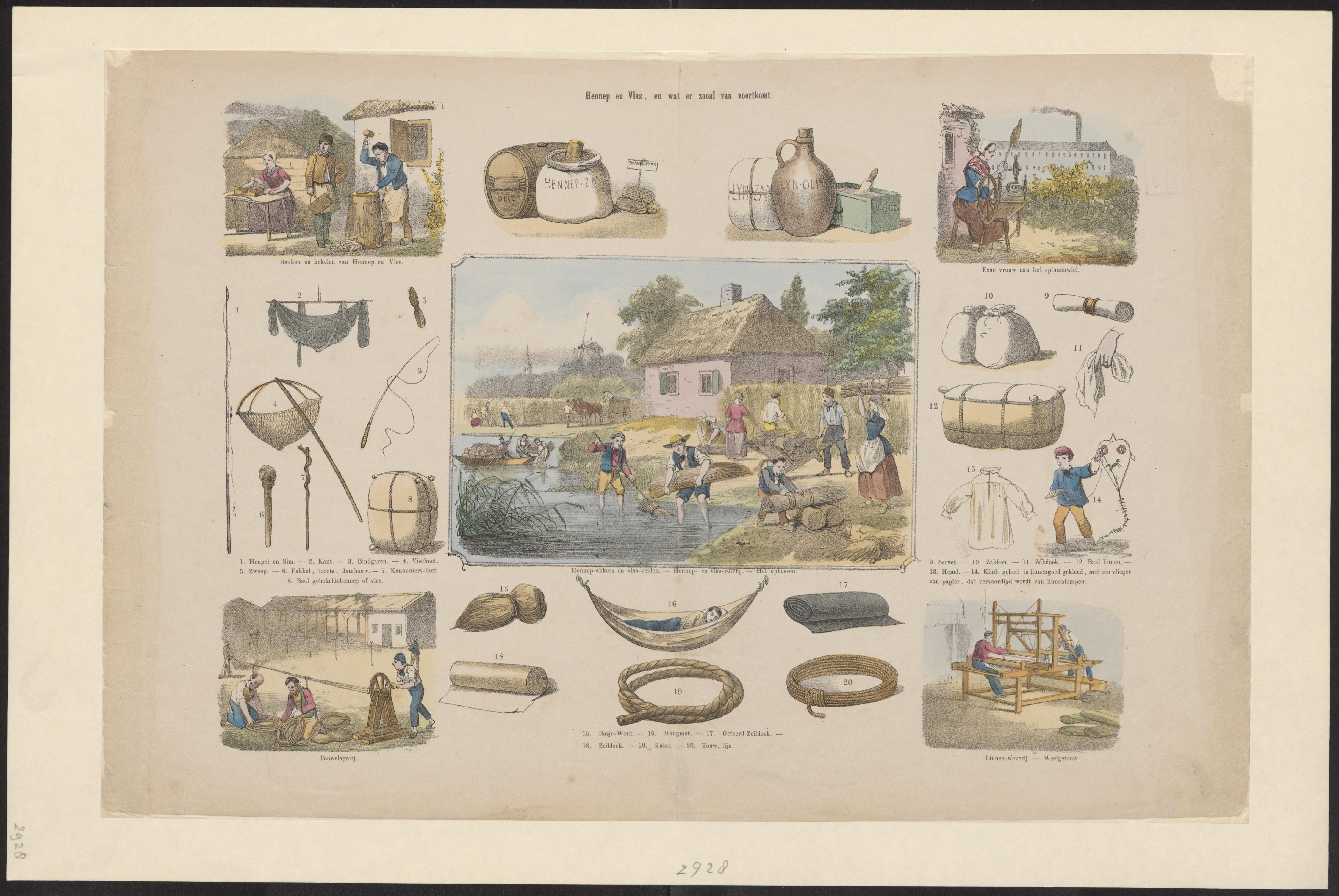 Prent met 27 afbeeldingen, gedrukt in lithografie en met teksten in boekdruk. De centrale afbeelding is van een boerderij, met eromheen afbeeldingen van voorwerpen en handelingen die te maken hebben met de verwerking van vlas en hennep. Omstreeks 1860 bracht de Leidse uitgever Dirk Noothoven van Goor een serie van 25 prenten op de markt ...